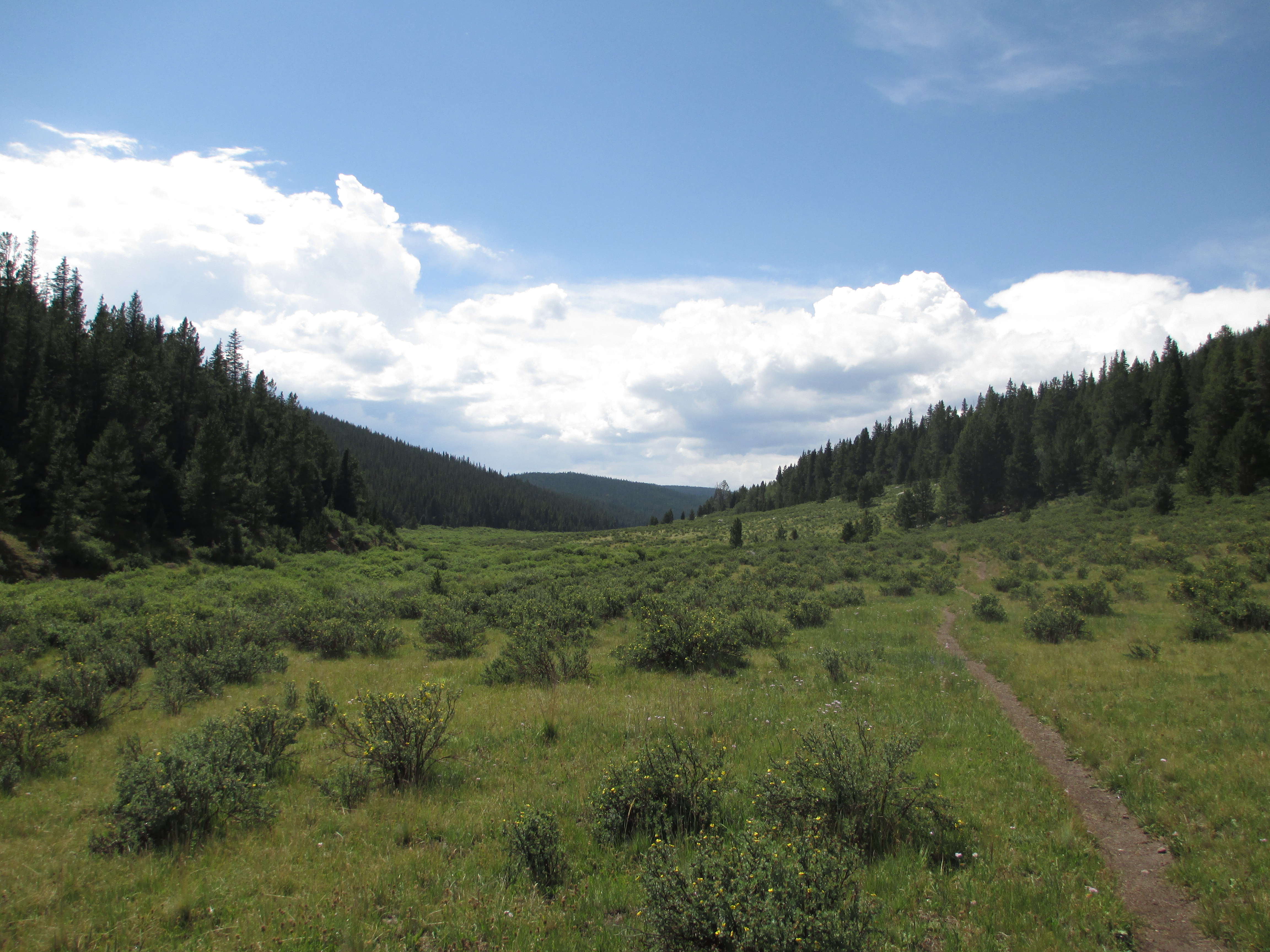 Around 2:45, it began to rain again. I eventually put my rain jacket on, hopped over a tree, and continued on through a large meadow, dotted with yellow flowers. I finally felt like I was in Colorado! (I had known since I was in college that Colorado was a place I had wanted to go, but this was my first time I had actually made it out here!).