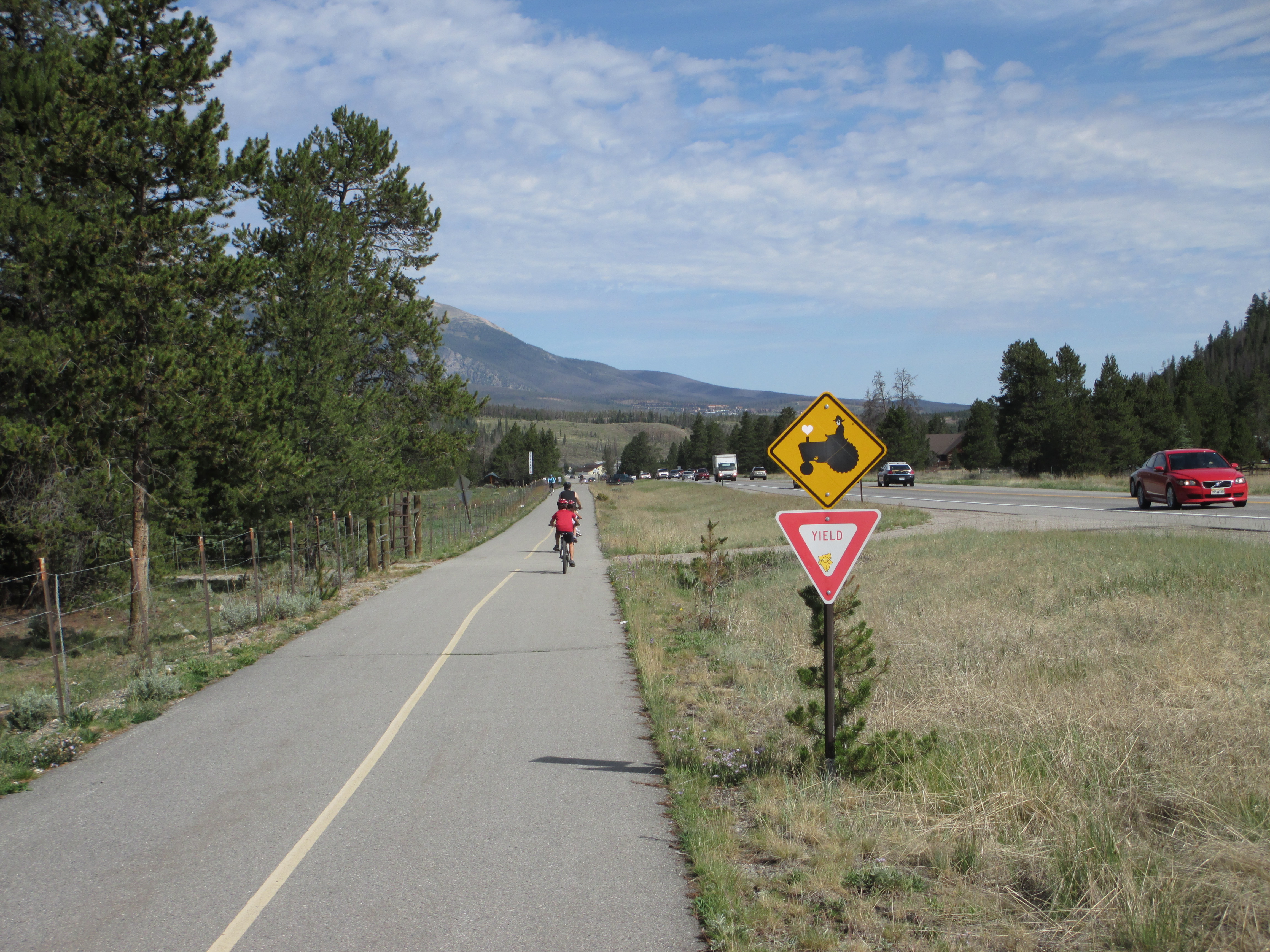 As I made my way to the bottom, I saw a family fishing in the lake, walked around the lake to cross a bridge, then a road, and then another bridge. I thought I only had a 0.4 mile walk to the trailhead. I was wrong. I still needed to cross Highway 9- a major, very busy highway! I made it across, but was confused about where to go next. I almost started up the wrong trail and then realized the CT continued on the pavement, crossing a bridge. The guidebook said the end of the segment and trailhead was 1/2 mile after Highway 9, and the bus stop was supposedly a couple hundred yards away. I came to a trailhead much sooner than 1/2 mile and was confused again. I asked some people who were about to start a hike if they knew what this trailhead was called. They weren’t very nice and didn’t know the name of the trailhead. They just mumbled something about Pike’s Peak. I told them I needed to get the Summit Stage bus into Breckenridge. They pointed me in the direction I had just come from, but I thought it was further ahead. So, I kept walking- and walking- and walking, looking for another trailhead. There was no second trailhead- only runners and bikers on a path!
