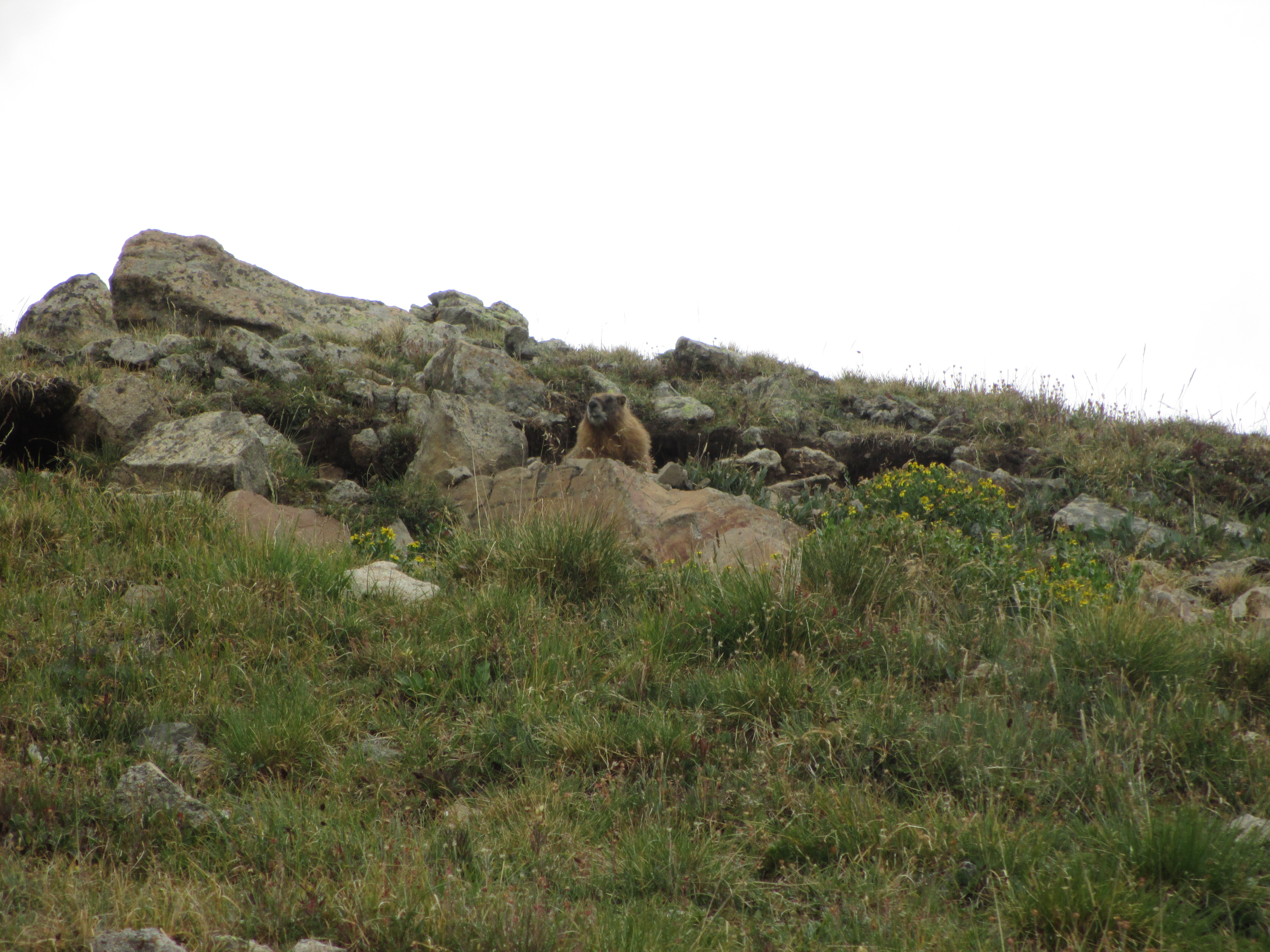 The rain turned to hail… It pelted my hands and bare legs. All I could do was keep moving forward. I thought about people at home, enjoying themselves in comfort as the hail stung my skin. I wished I could enjoy the views in these open areas without racing away from storms! The hail eventually turned to rain, and then stopped altogether. I still hadn’t reached the highest part of this section at mile 12.3. I heard and saw both marmots and pikas. A family of 5 or so marmots poked their heads out of the rocks and watched me walk by. So cute!