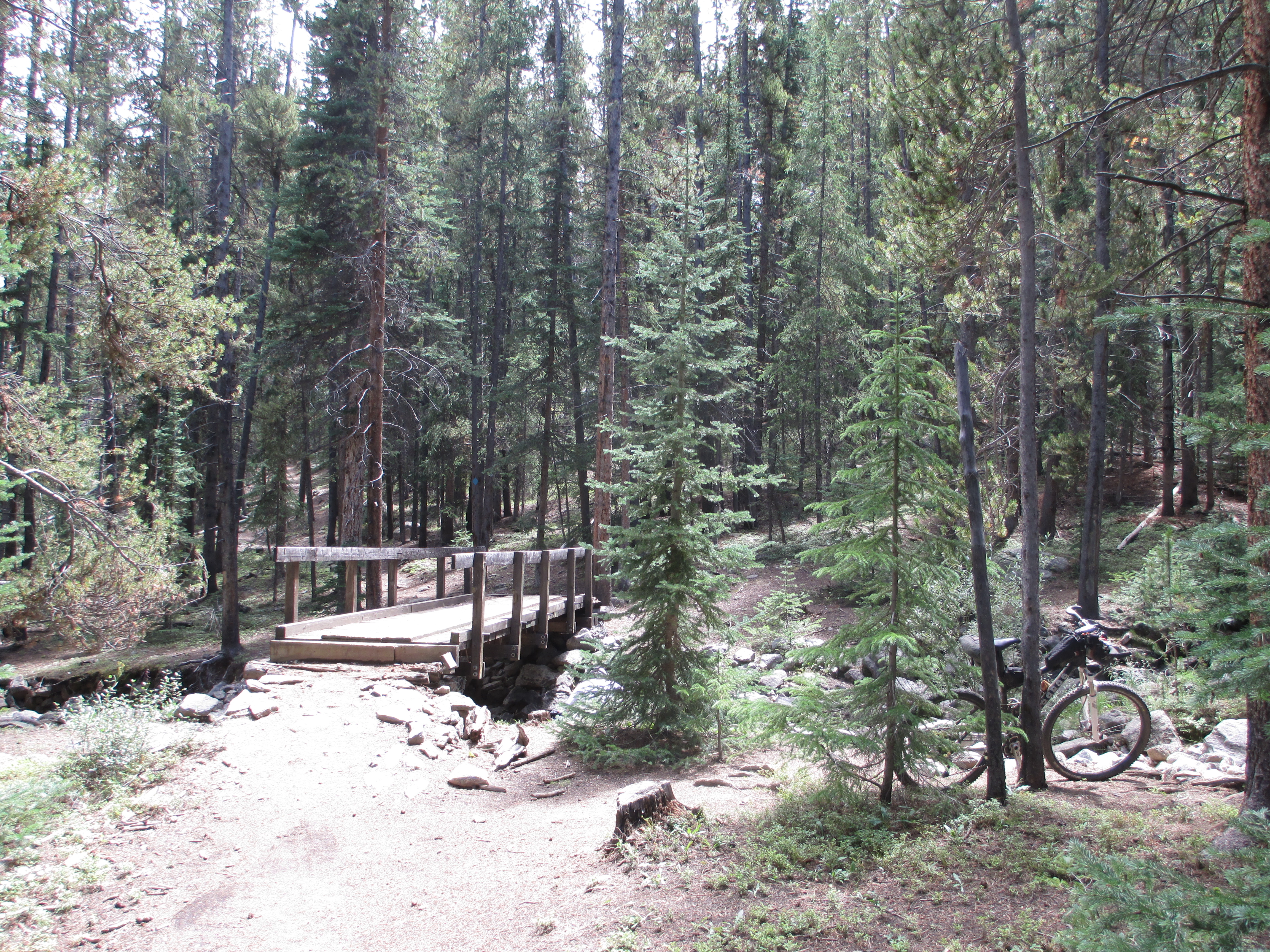 After continuing on for a bit, a mountain biker approached me from behind. I stepped to the side to let her pass and she thanked me. I knew she was in the race (part of the reason I wanted to get back on the trail today was to be able to see some of the racers). She was wearing long, green socks up to her knees and her hair was in braids. Her gear was extremely minimal. The trail descended to a flat spot in the woods, and there was a wooden bridge nearby. I saw a bike and then saw the woman sitting beside the creek, filtering her water. I walked onto the bridge and said hi, excited for the chance to talk with her. I asked her where in the pack she thought she was. She had no idea (it turns out that she was the lead female). We chatted for a bit, and I didn’t feel like I was holding her back at all, since she was filtering her water the entire time. It was interesting for me to hear about what the race was like for them. She said she got most lonely during the dusk, and missed her boyfriend, but once it was completely dark, she felt okay again. I asked her if she hallucinated during the race and she admitted that she did. I told her about running into Chad and she said she would look out for him. She thought that what I was doing was cool, as well. She lived in Durango. Another racer from South Africa passed us as we talked. He didn’t need to stop for water. Since bikes aren’t allowed in the Wilderness sections of the Colorado Trail, the racers had to take detours on roads, and since I was headed into one of these sections, I didn’t know if I would have the chance to run into anymore of them again. I said goodbye, wished her luck, and continued on.