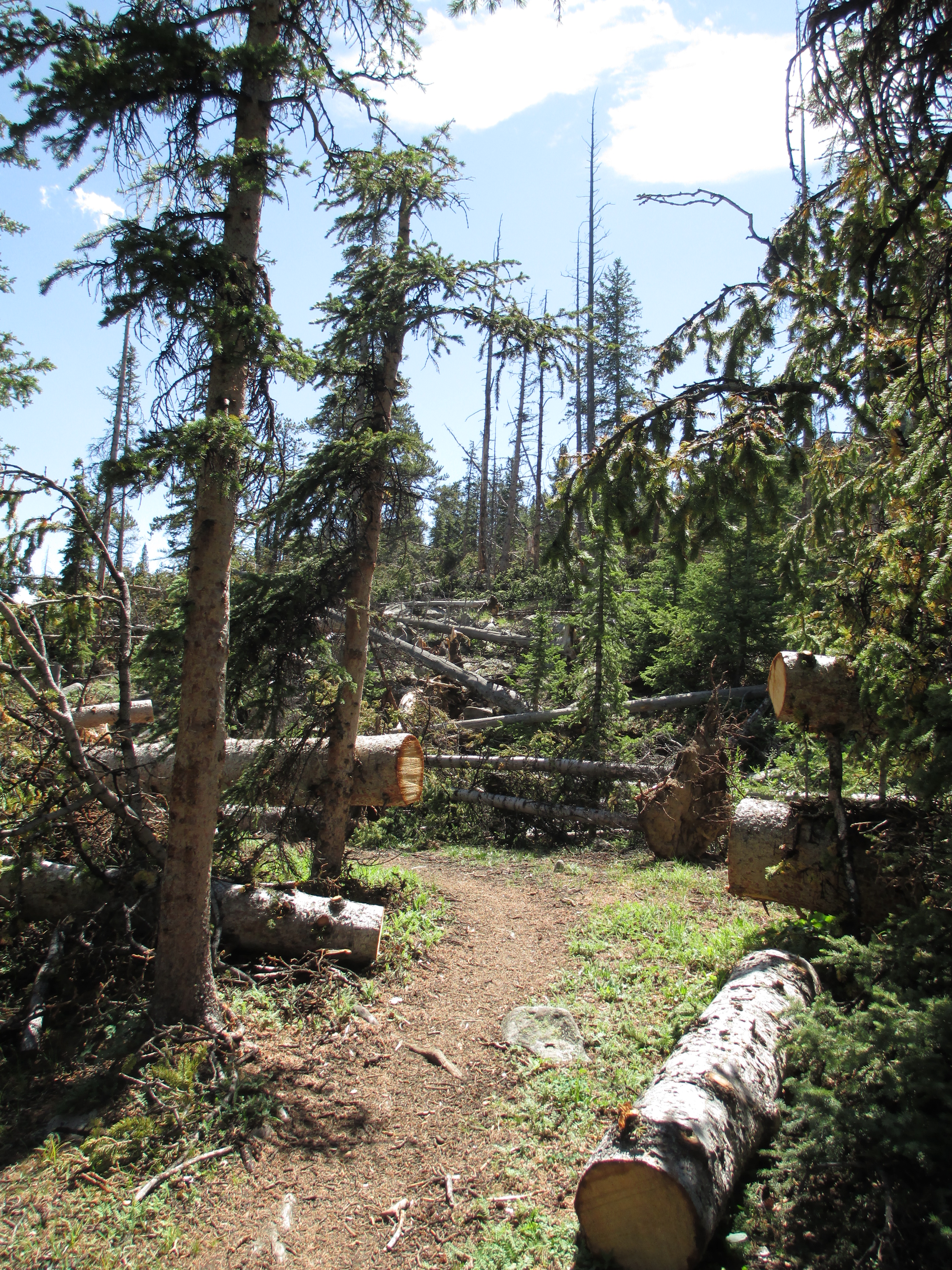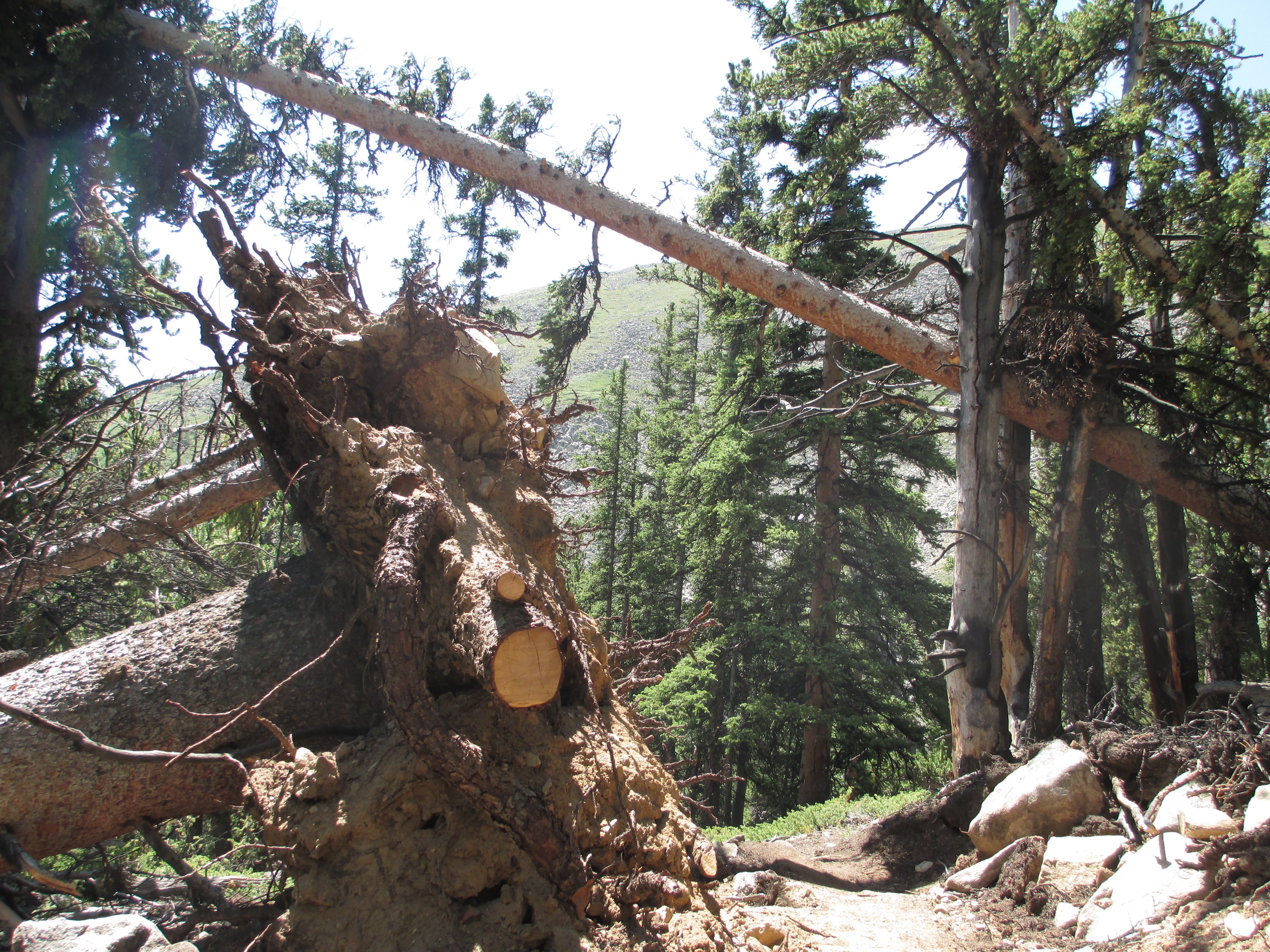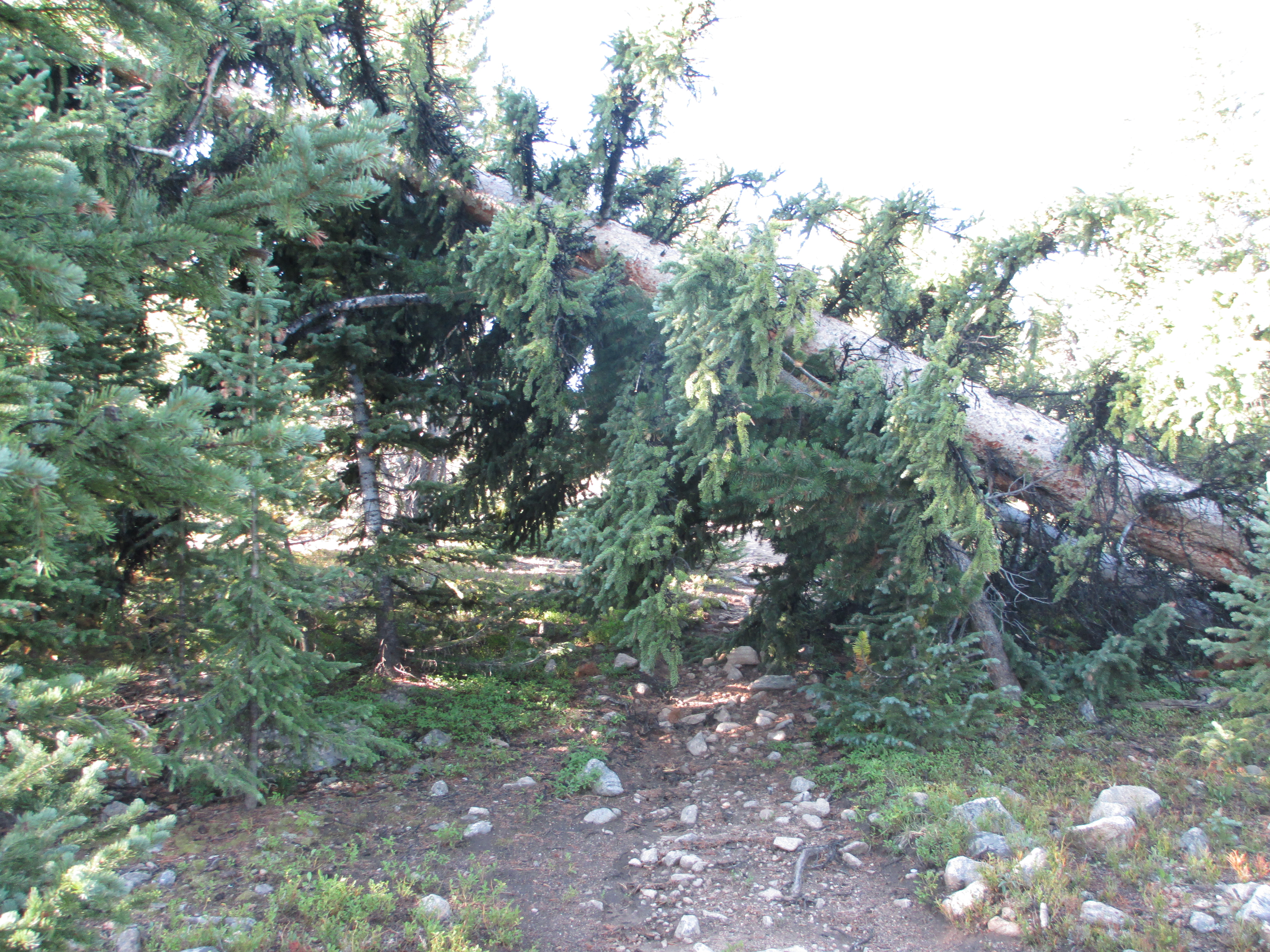 I caught up to the man again at the creek, and this time it was me that kept going. (Honestly, I prefer hiking alone with no one in the vicinity. I never feel like I am too slow or need to be keeping up with anyone else’s pace, and I enjoy the solitude). I continued on to the section with lots of downed trees. It was a very warm day, and I took my pack off for a moment at the top of a dry climb and looked around. Then, I continued on. All of a sudden, I heard an incredible amount of noise in the forest! I stood still. I knew it was a large animal- maybe a bear. And then, a whole herd of deer (or elk) raced down the side of the slope, crossing the trail in front of me, and crashing into trees well below me! It was incredible! One of them, with small furry antlers, stopped at the trail and looked at me for a second, startled. Two others seemed too scared to make their way down past me and remained at the top of the slope, one of them looking at me. Before I could get out my camera, they had all disappeared. Wow! I had never seen anything like that before!
