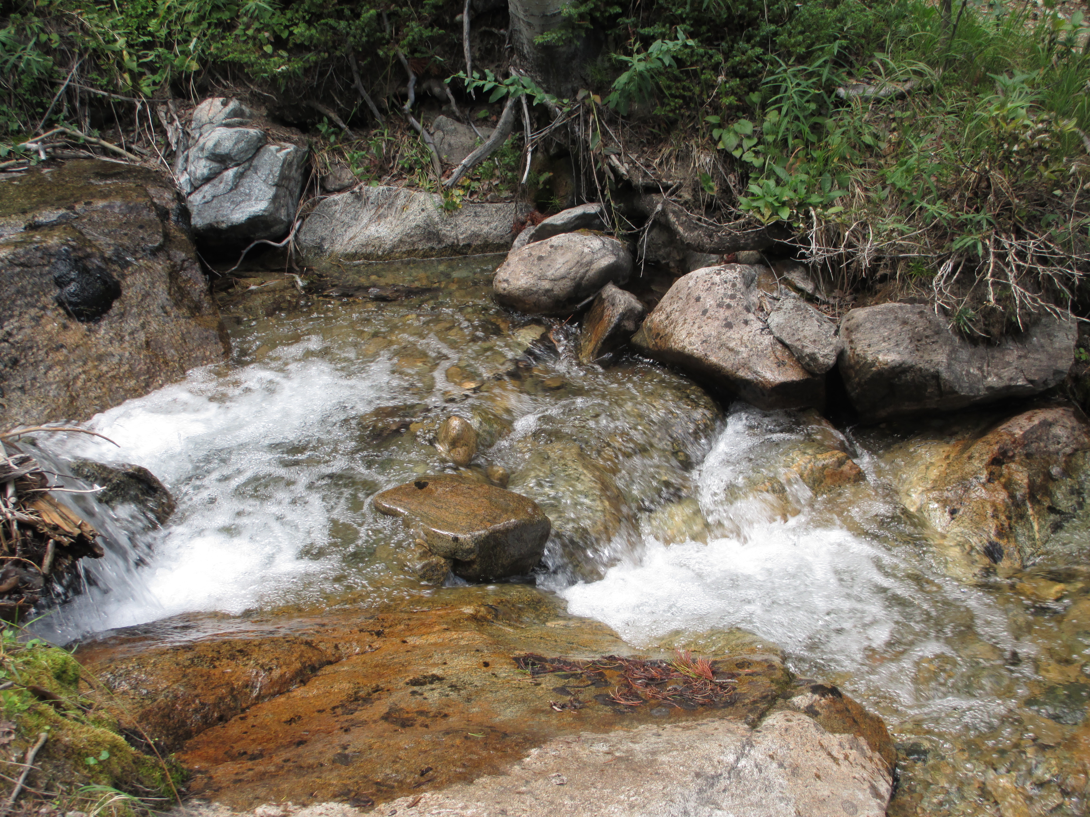 The environment was very arid. The man yesterday had talked about the descent being very steep, but in actuality, it was not (you should never let anyone else’s opinions affect your own experience…) The trail was gravelly, though, and I lost my footing and almost fell. My knee twisted, but I hung on. As I approached Pine Creek Basin, I saw a sign to Elkhead Pass! (the mysterious trail I had wanted to take yesterday!). The man from last night was sitting near the creek, fiddling with his steripen, which wasn’t working even in the clear water! (I was glad I had a filter on this trip).