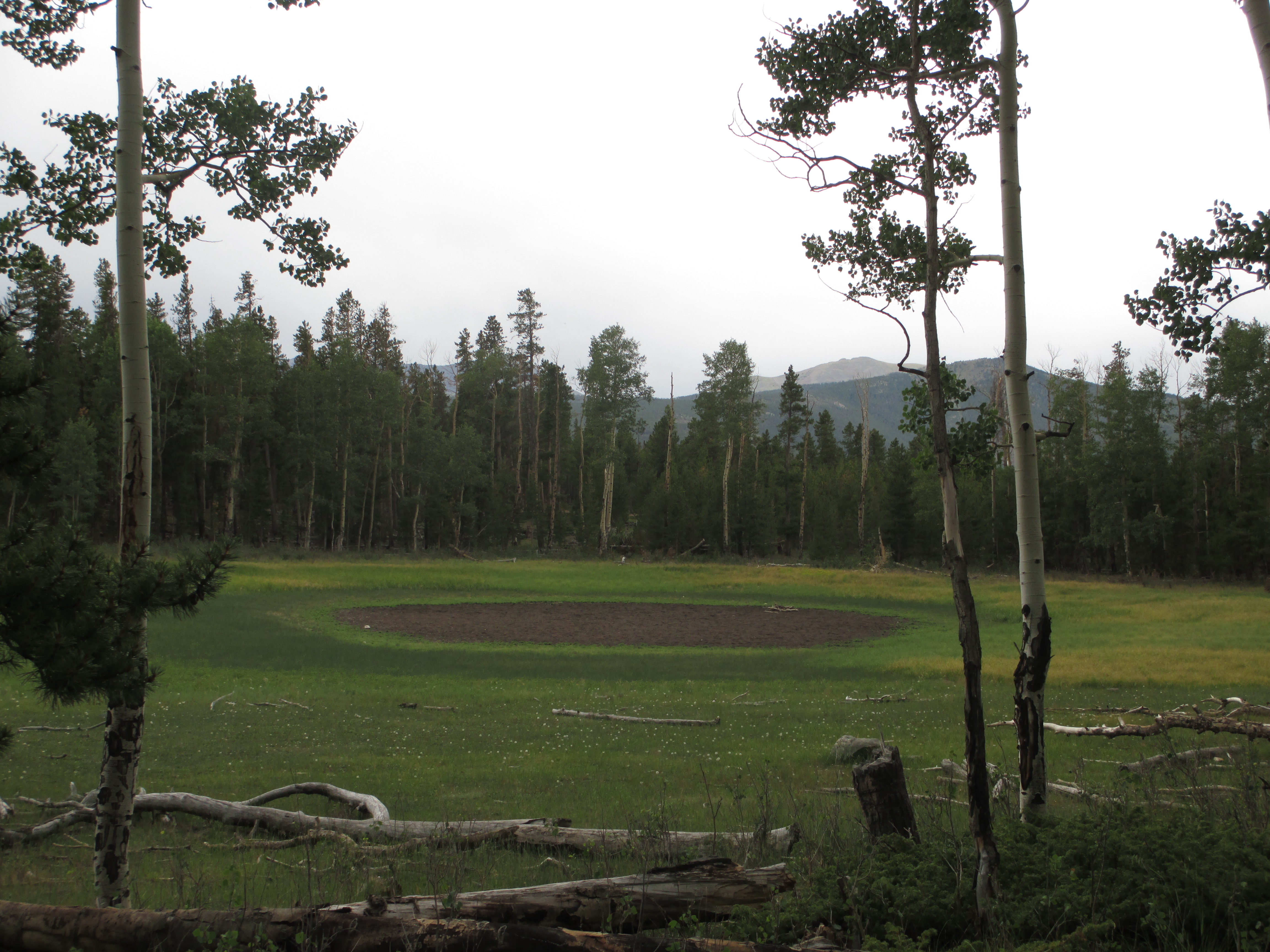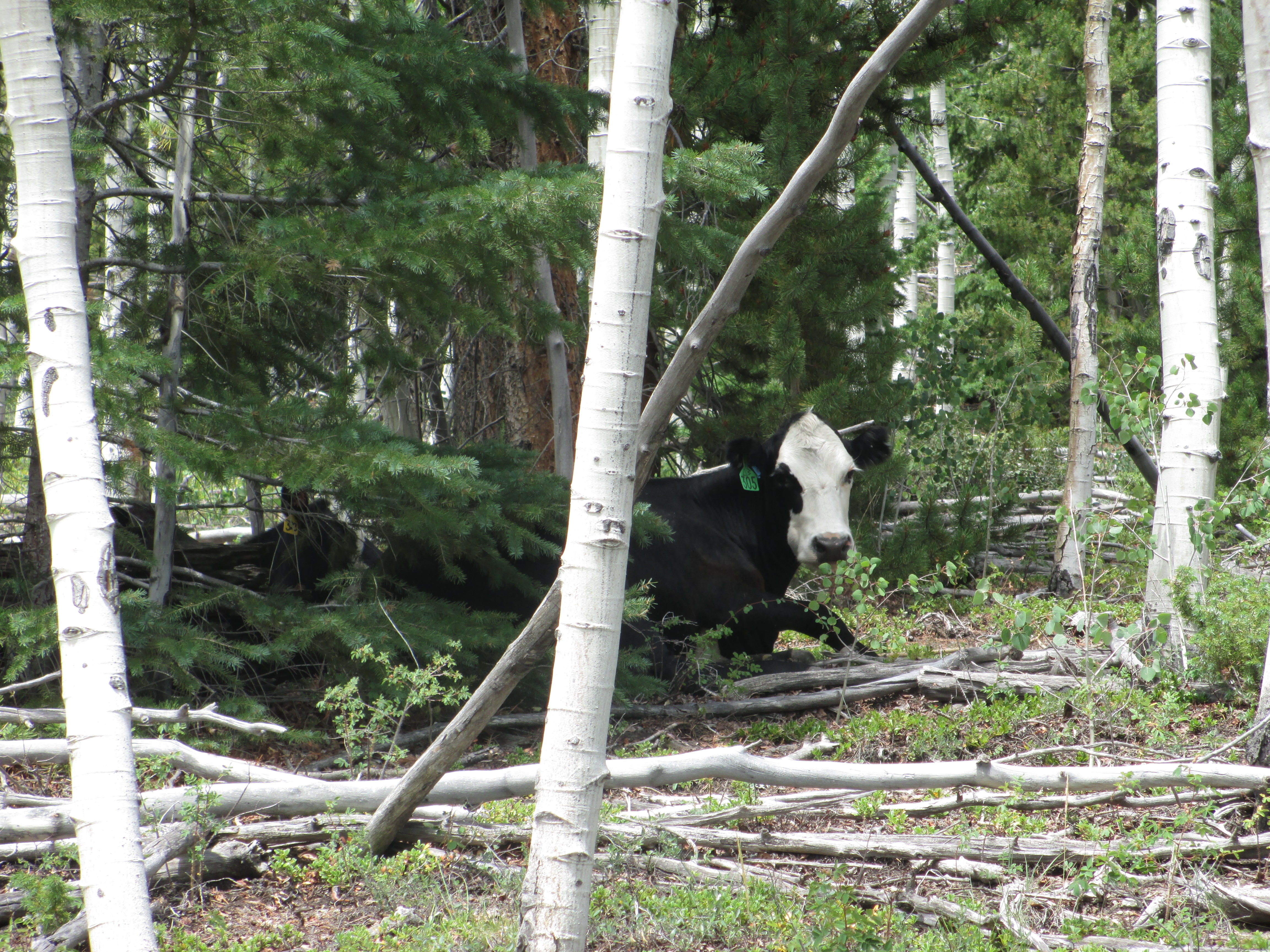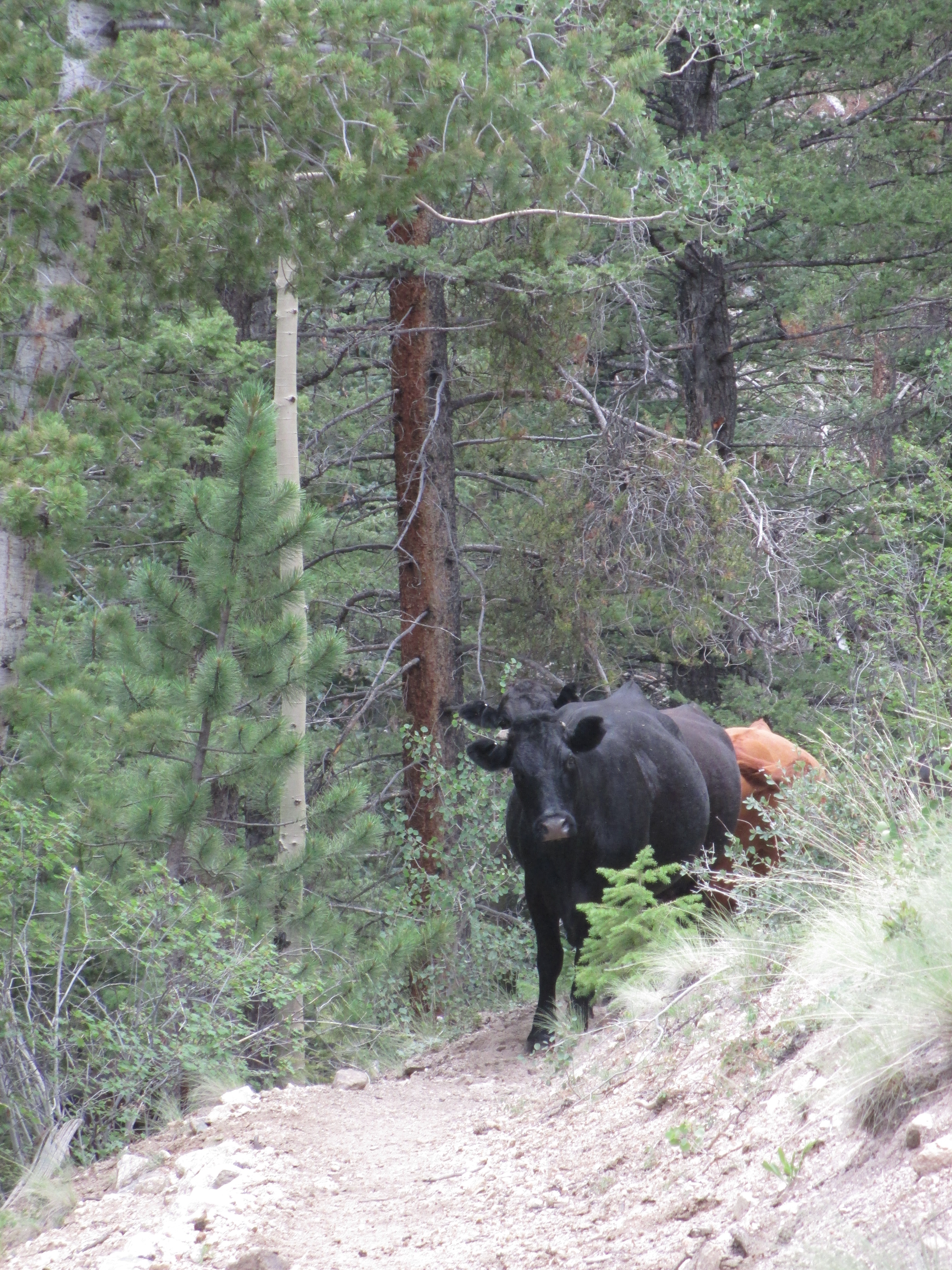 I packed up and trudged on. As I reached the top of the climb, I heard a sound in the forest. It was a big cow! There were lots of cows! It was a funny sight to see these large, slow moving animals up here. There were also enormous cow paddies all over! I was suddenly glad that I didn’t collect water from Sand Creek. (And I remembered that Hellbender got giardia in this area of the trail when he tried to hike it a couple of years ago and had to end his hike in Salida).