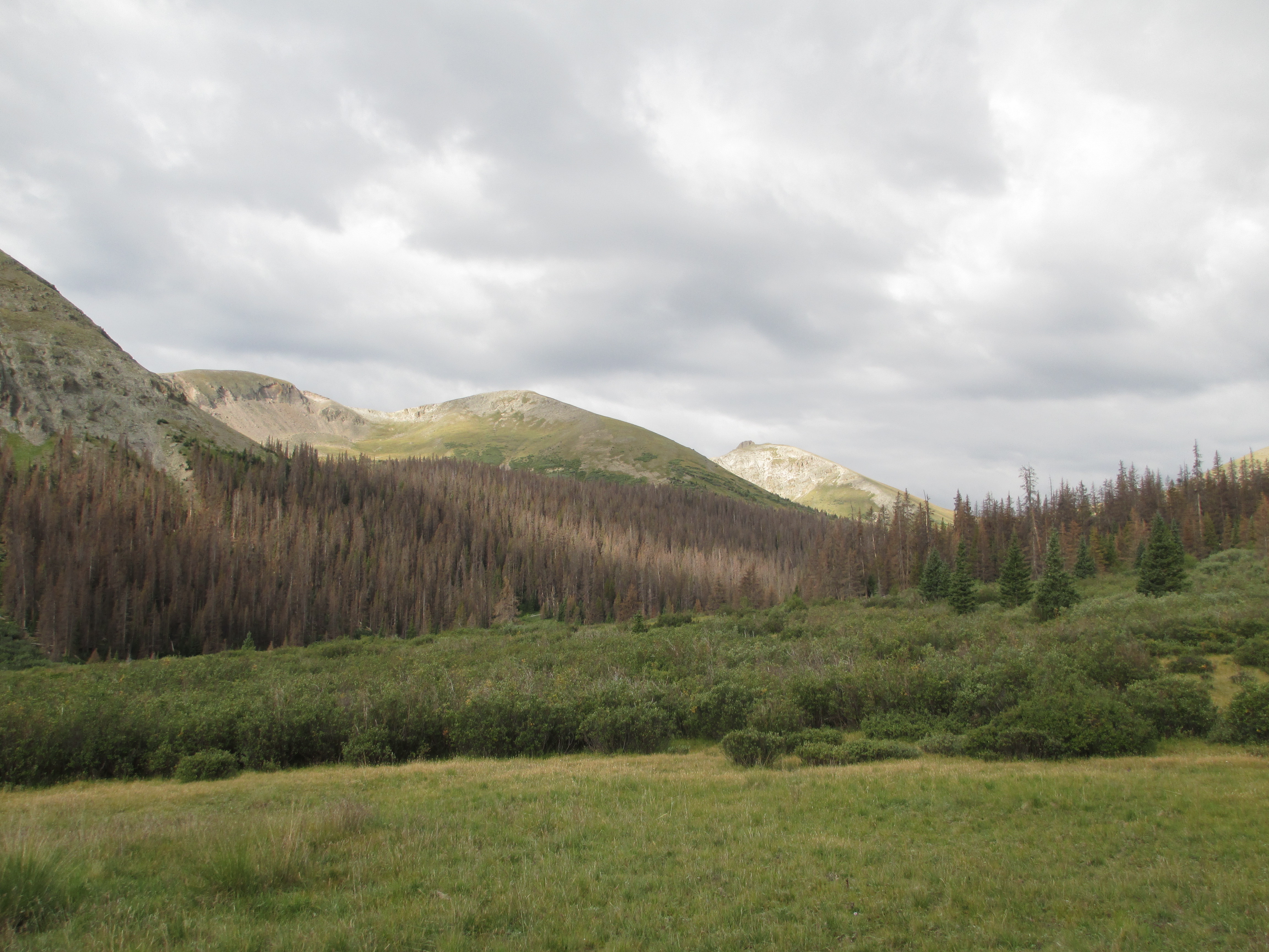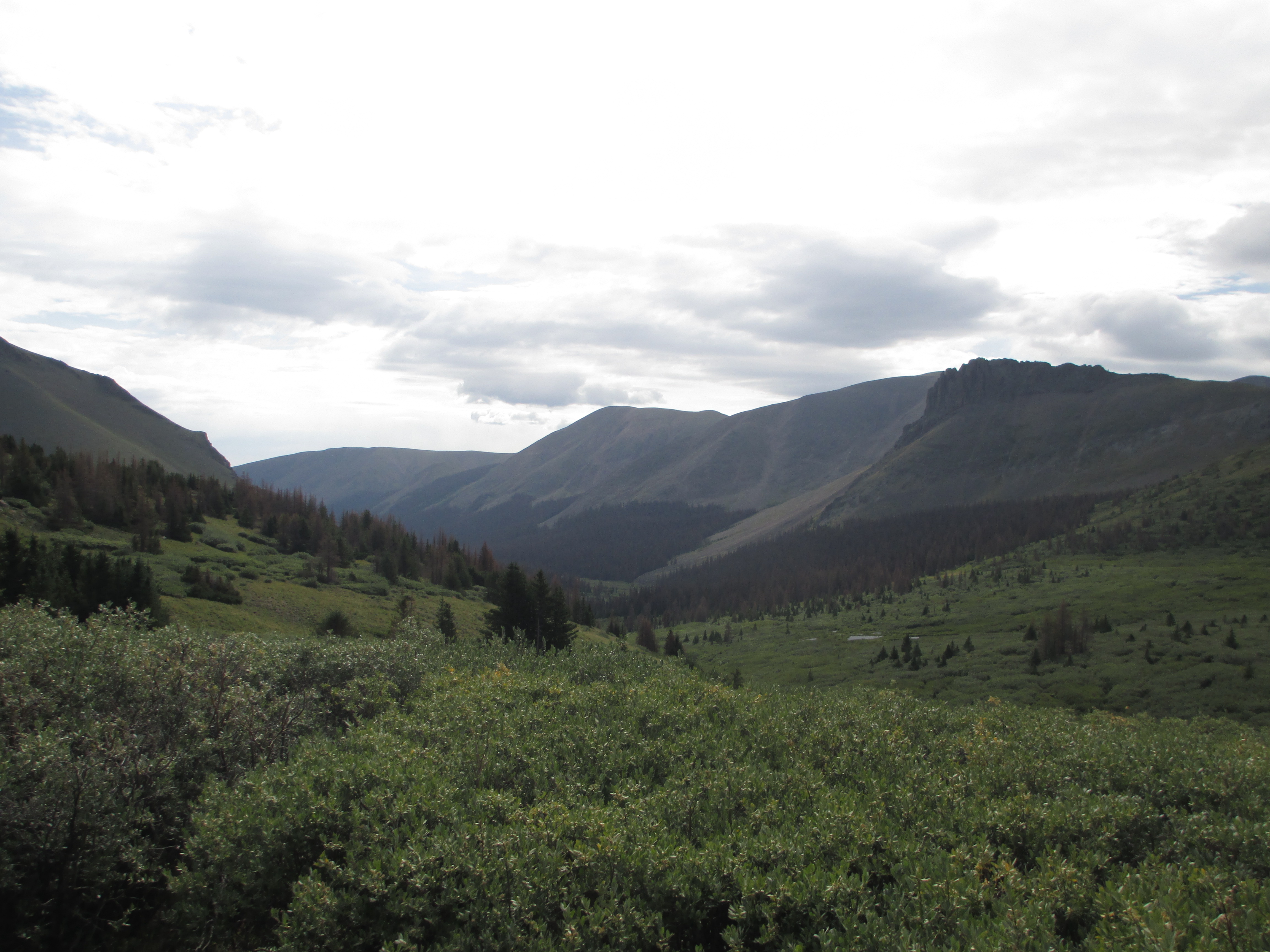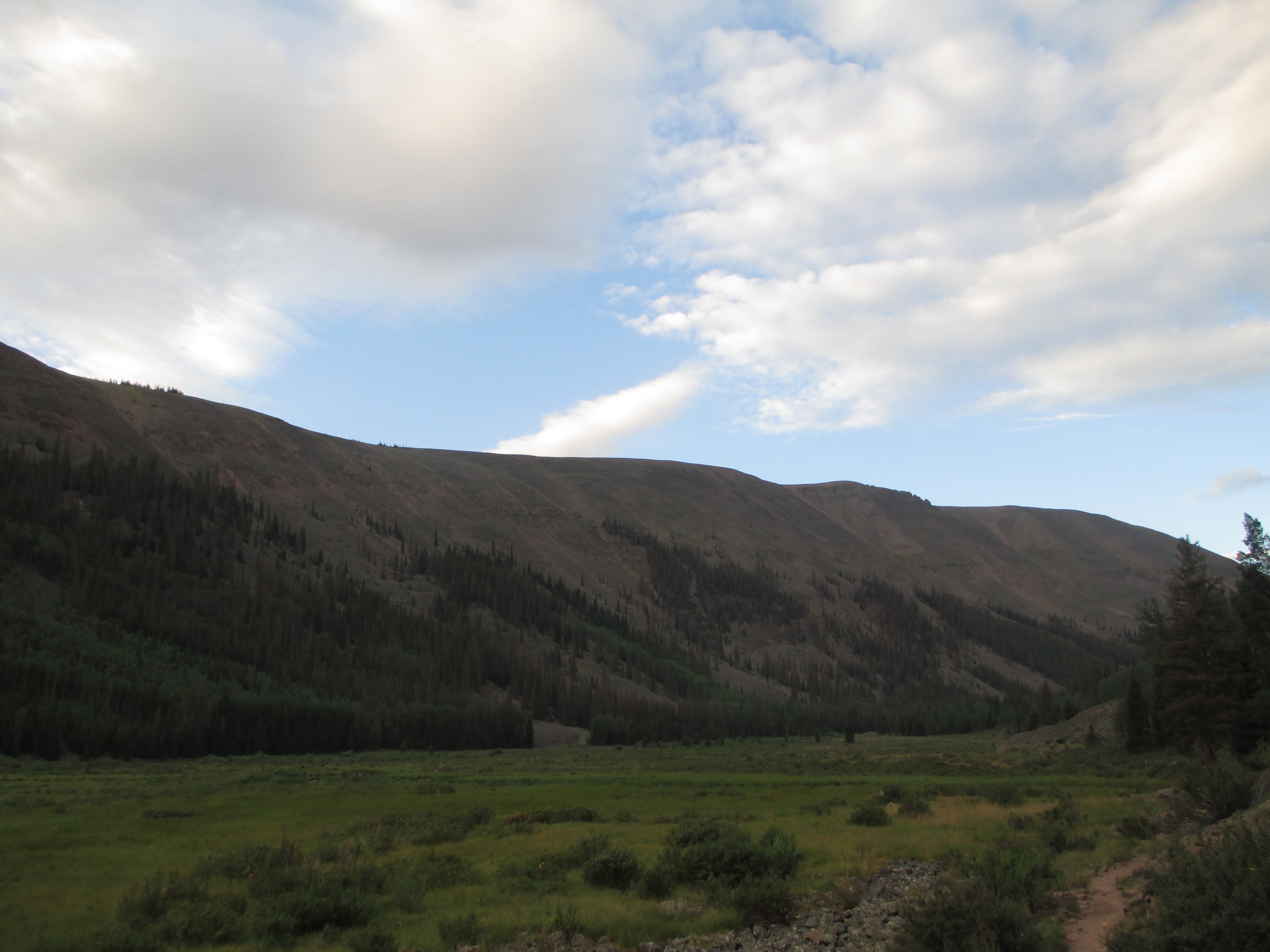 I had 7.5 miles to hike before I would reach the 12,600 foot saddle from which I could climb San Luis peak, so I had to get up as early as possible. For me, that was 5:30 am. (I really don’t like to get up when it is dark out!). When the first light showed around 6am, I noticed how cloudy the sky was, which was a very strange occurrence. Mornings in Colorado are always sunny! I wondered what this meant for my chances of summitting San Luis in the afternoon. The squirrels once again let me know that they did not appreciate me inhabiting their territory (either that, or they were really excited to start a new day!). I told them that I would be leaving soon and they would have the area all to themselves again. I packed up, said goodbye to my home for the night, and headed off around 6:30, passing through the gate, and then through fairly flat meadows with morning dew on the grass.