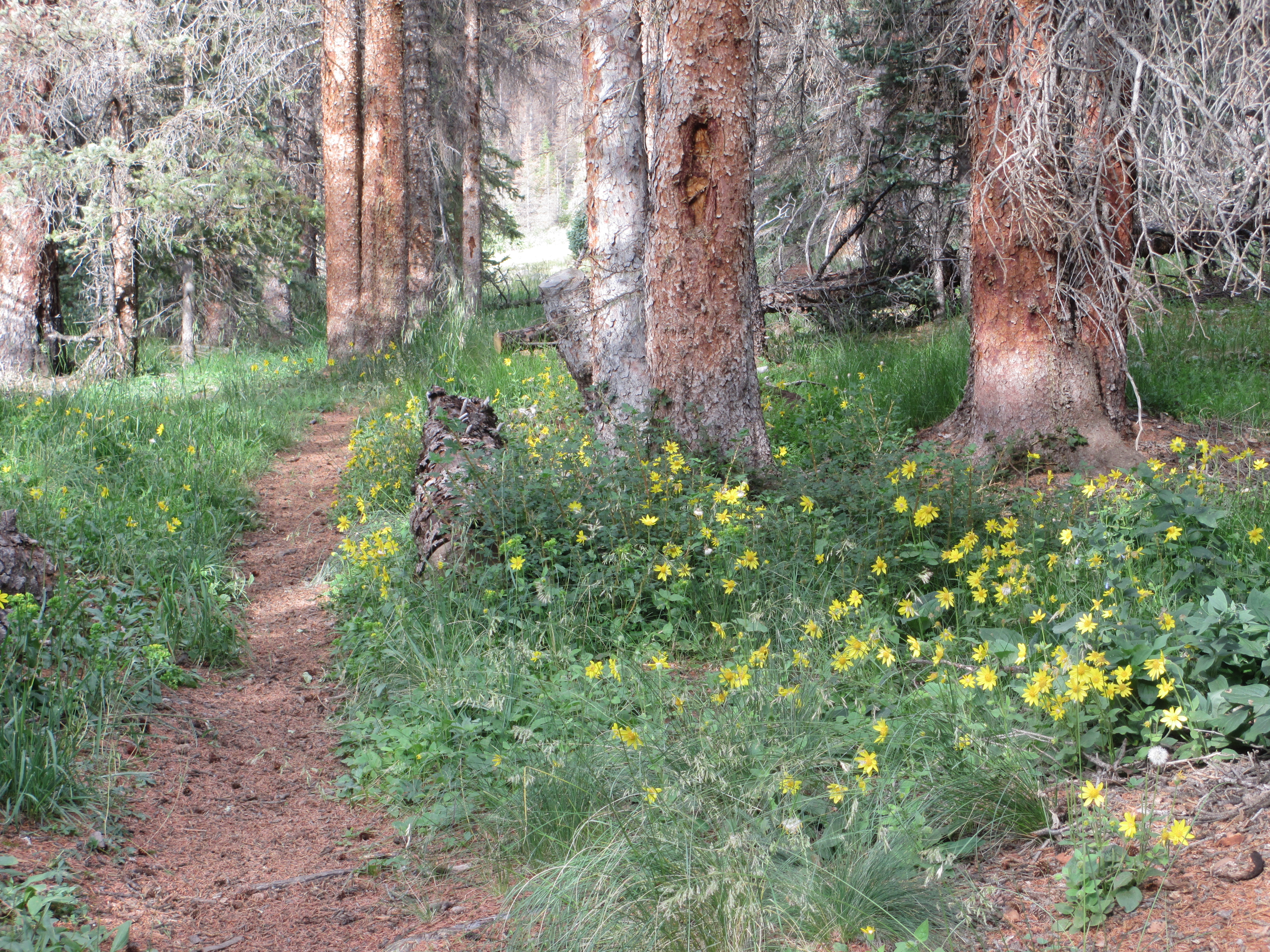 As I looked down, I saw in the distance some elk or deer passing by! I was getting hot and wanted to take off my rain pants. I saw a vehicle on a ridge well above me. Again, it started to rain. Better put the rain pants back on… I kept moving. I crossed one saddle and headed for the next. I decided that I was either going to camp 2 or 4 miles into the next segment. Everything was wet! I bypassed the first possible place to camp, crossed a stream, and came to a huge pile of rocks, where I heard the sound of pikas again! The rain had stopped and the sun had finally come out! I stopped to take a little power bar break. I took off my shirt for a second. It felt so good to have sun on my body for that moment! Then, I continued on. The pikas slowed me down, though! I saw them pulling bunches of leaves out of their nest, and racing back to their nest with them in their mouths! Others were playing, chasing each other around. Finally, I continued on through a pine forest, where I saw some pretty yellow flowers again. Then, the rain started once again! I was getting so tired of this! I found another tree to rest under while the thunder rumbled and lightning struck. I had only made it a couple of hundred yards from the rocks with the pikas. Then, I noticed a patch of blue sky to my left. I decided it was best to head towards the blue sky! I still had one more saddle to climb to.