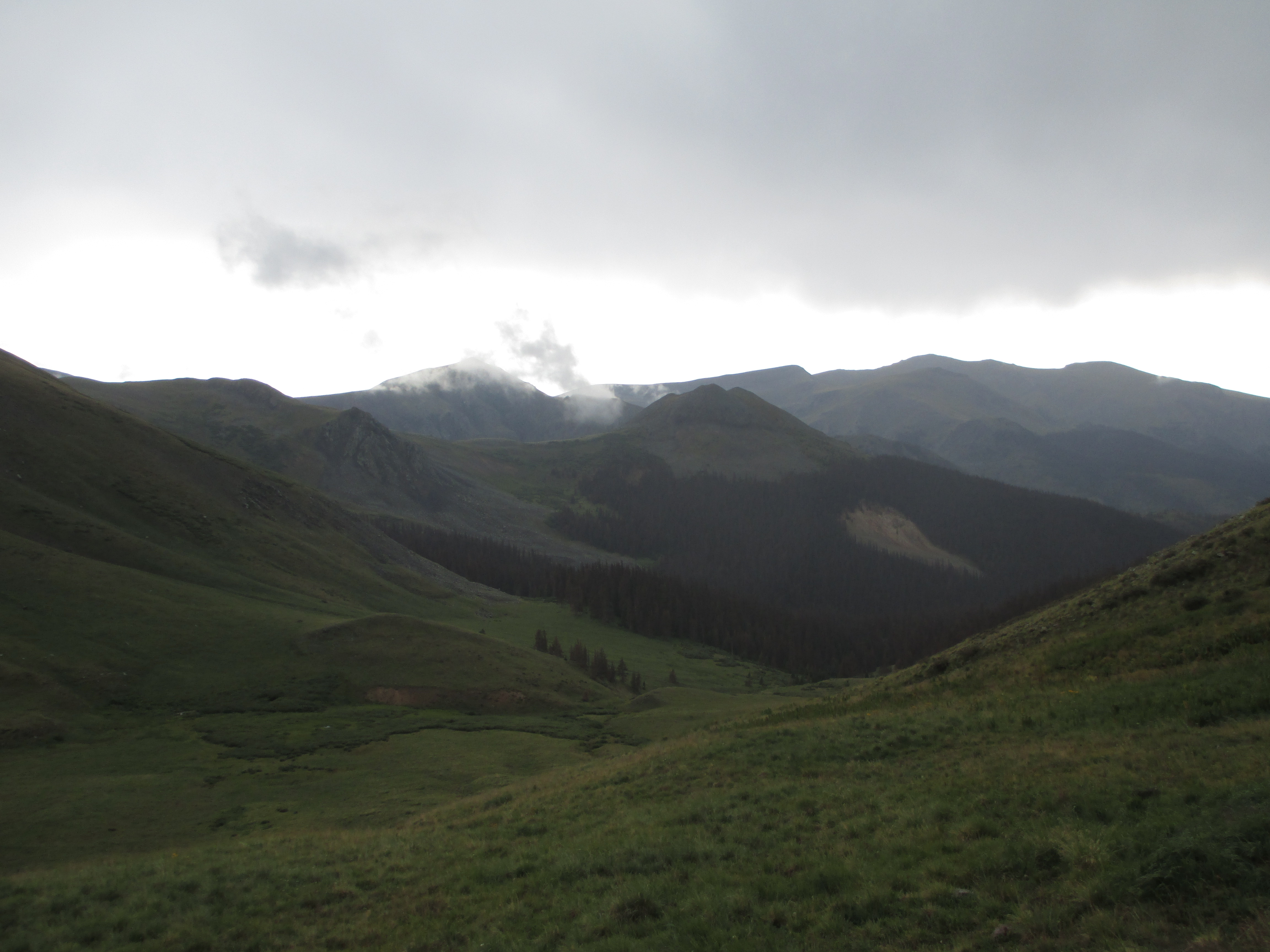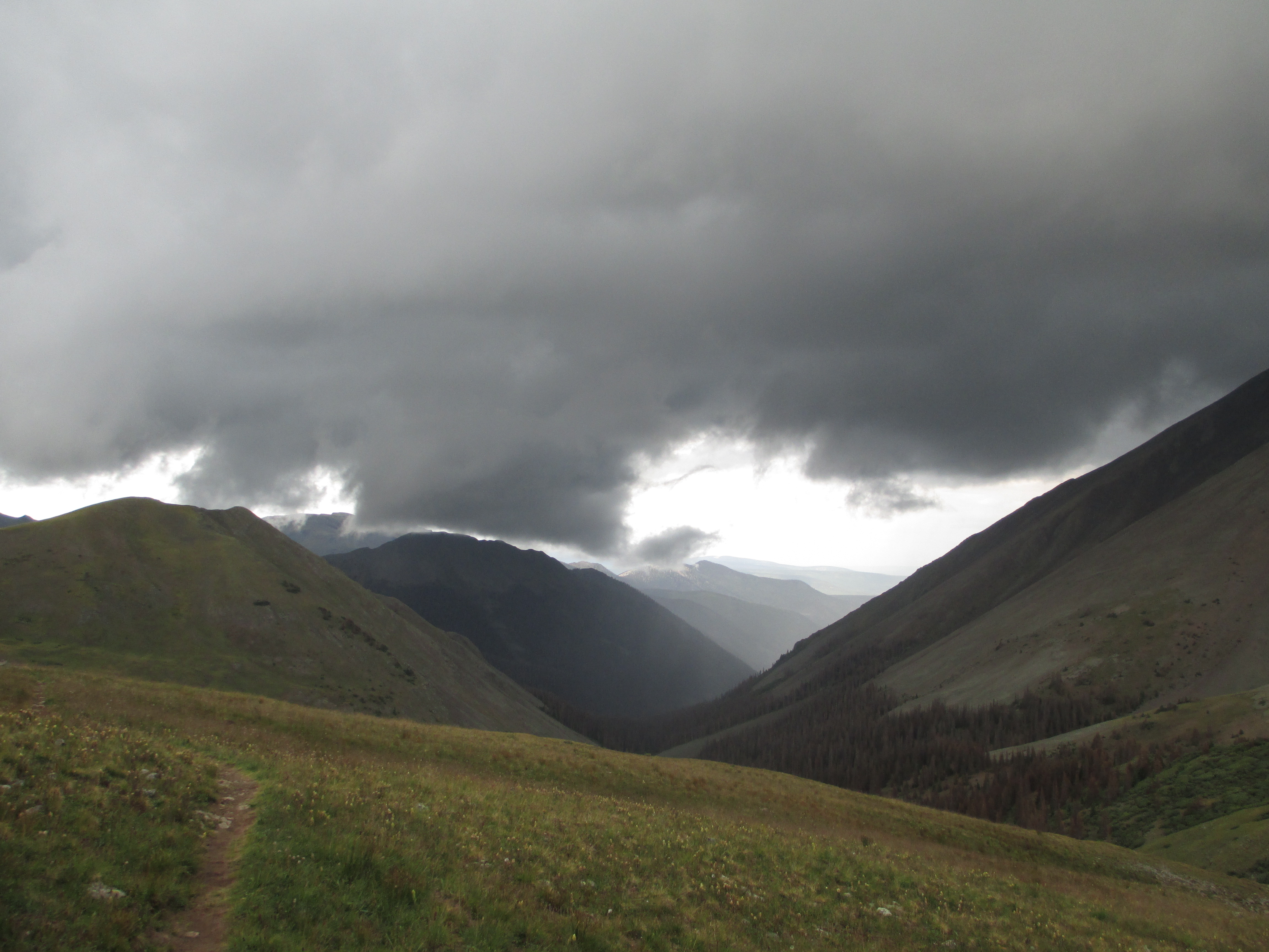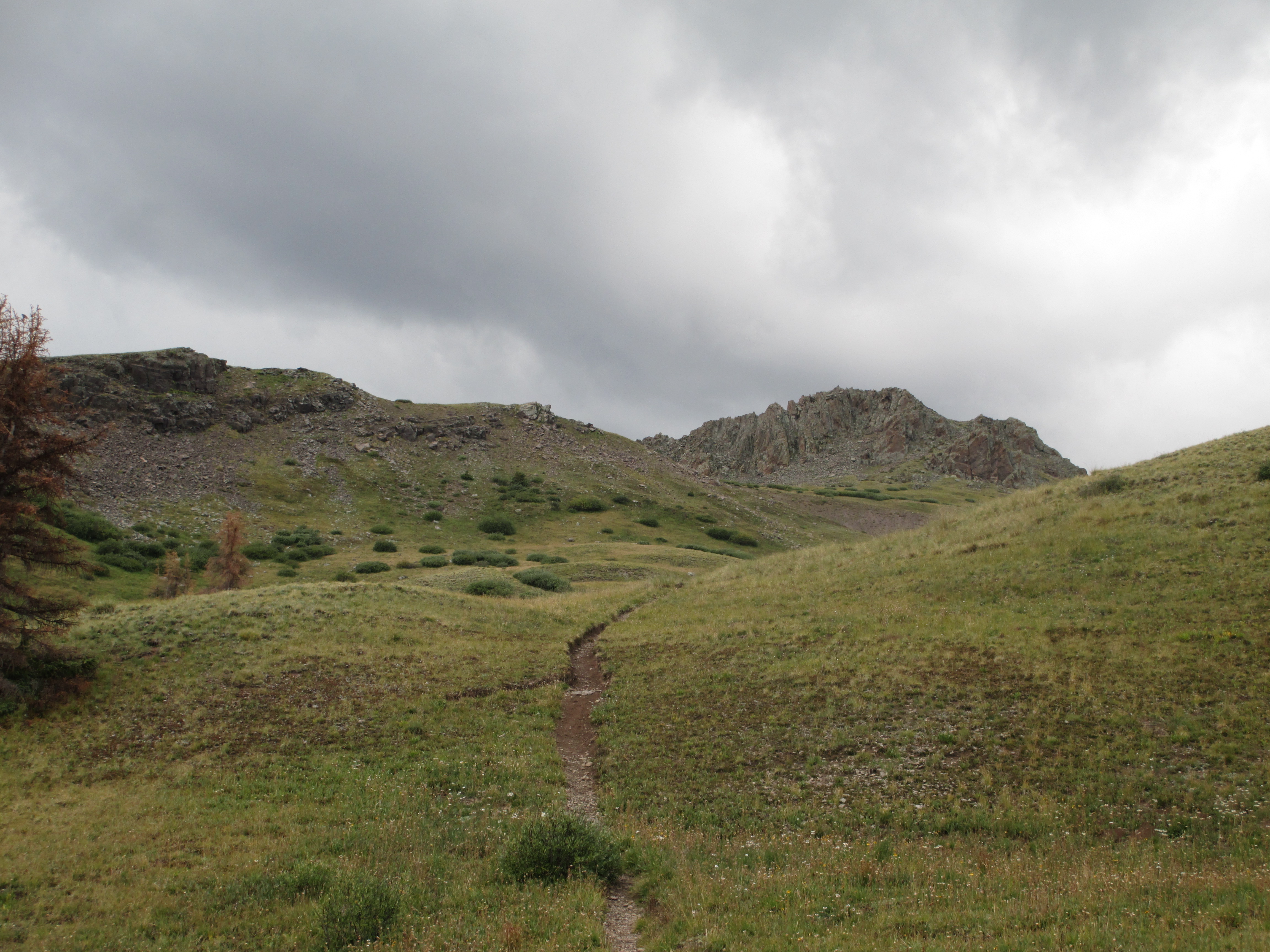I crossed it, continuing on the CT, and as I headed up the next hill, I saw lightning flash to my right! I had just come out of miles of exposed terrain, was just entering a krumholz region, and was about to ascend to completely exposed terrain again. Danger! What should I do…? Should I remain in this area with the low bushes until the lightning stopped? I decided that since the lightning wasn’t right over me, I would keep going. I turned on my phone and stuck it in my rain jacket pocket. A minute later, I heard it make a noise! Reception! A got a text from my “friend”, but all it said was “hey”. I hurried to write him back, telling him I was in the middle of a storm on an exposed ridge. It took me several minutes to send it out, because I would only intermittently get a half bar of service (it must have been coming 11 miles away from Creede). I waited a bit, but got no response… I continued to climb up the mountain, back into completely exposed terrain.