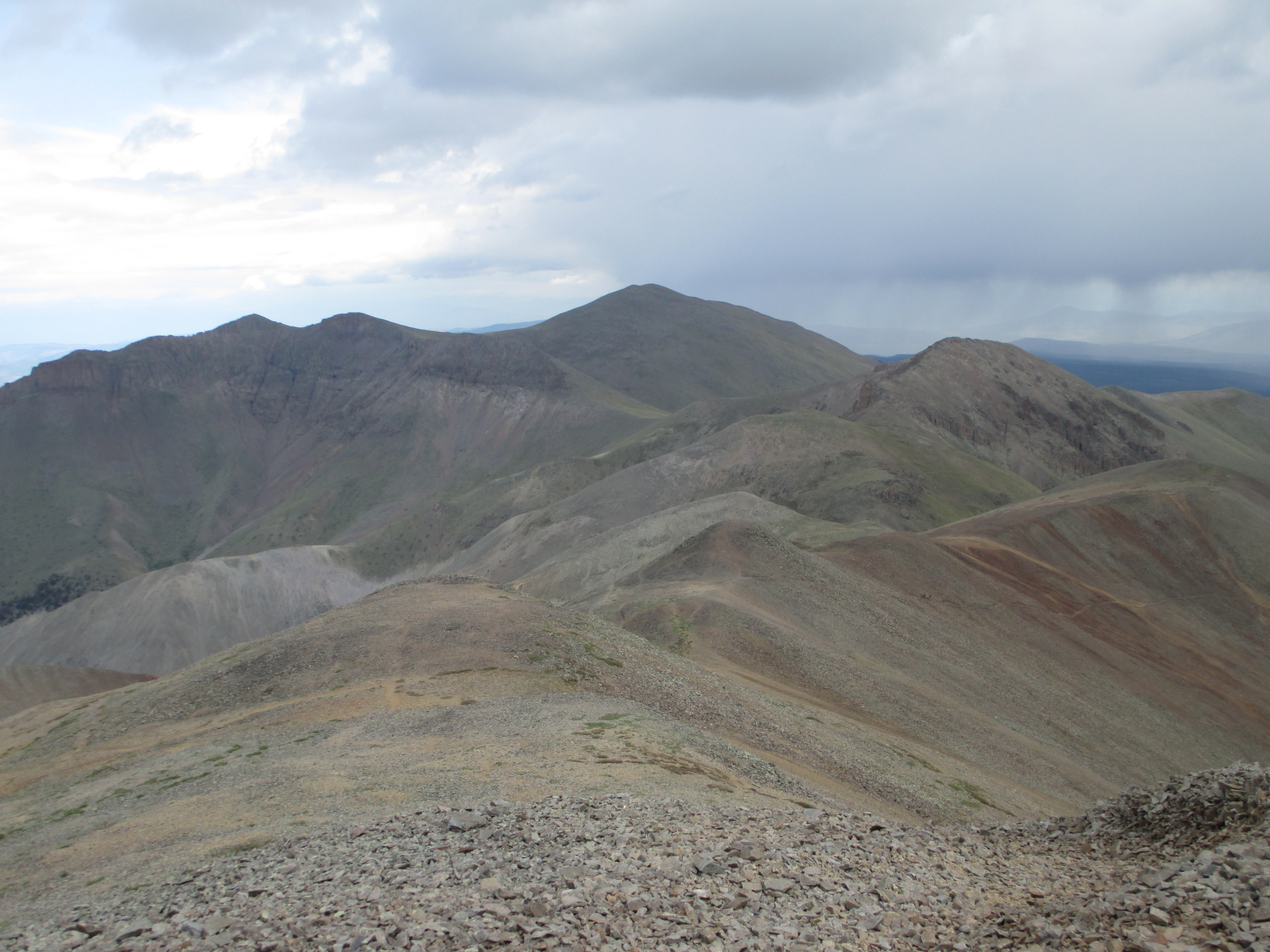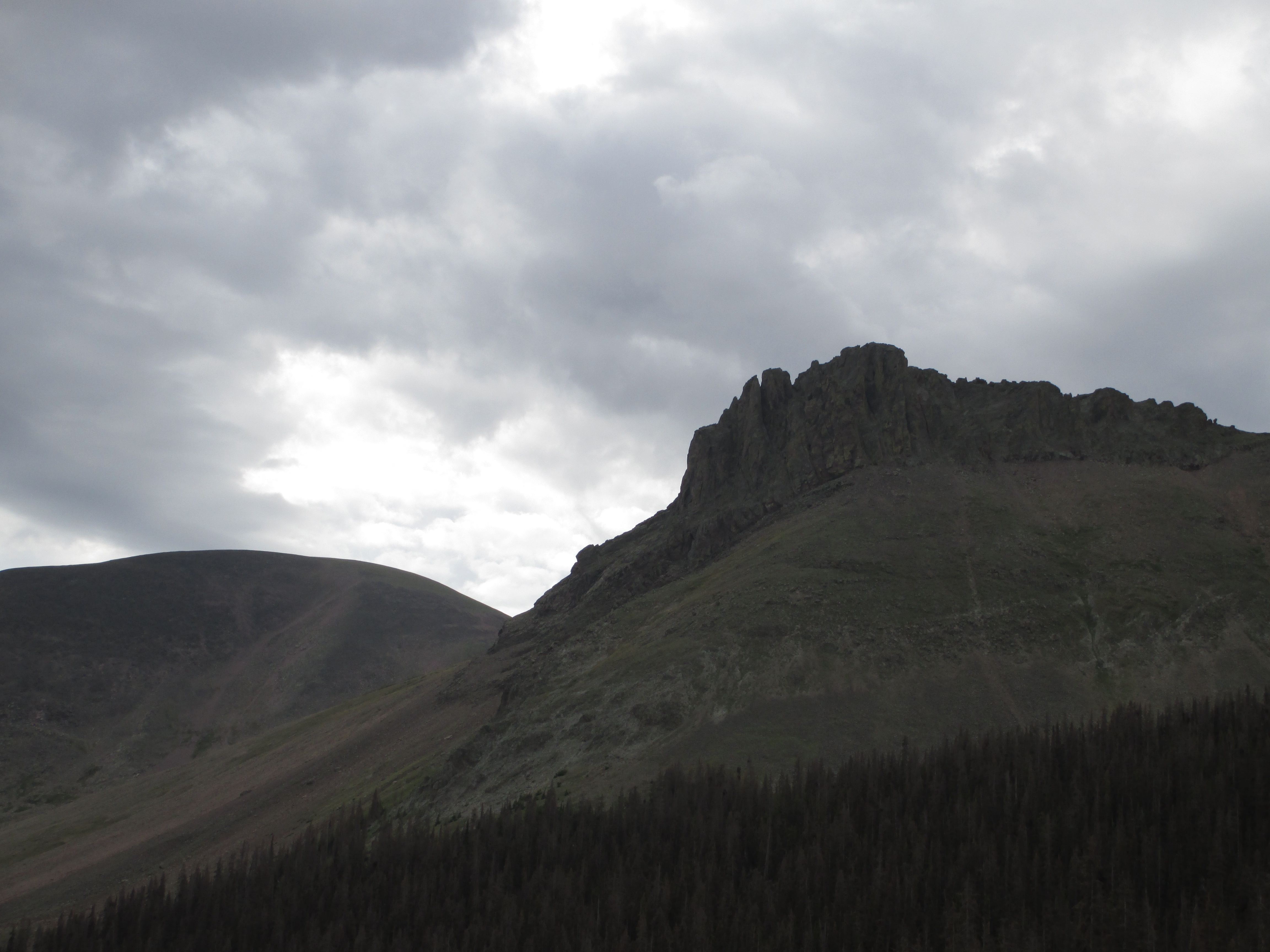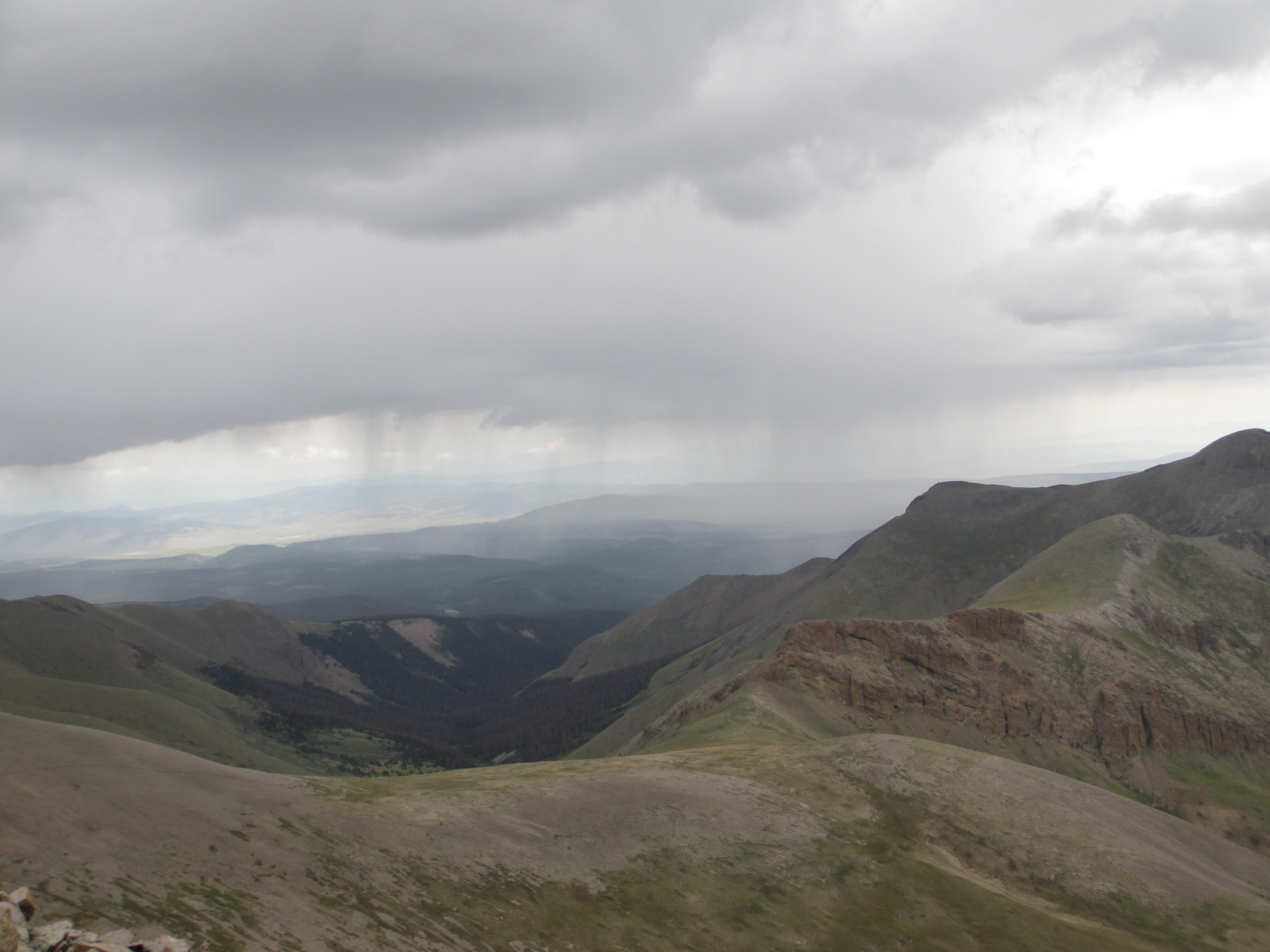 I crossed it, continuing on the CT, and as I headed up the next hill, I saw lightning flash to my right! I had just come out of miles of exposed terrain, was just entering a krumholz region, and was about to ascend to completely exposed terrain again. Danger! What should I do…? Should I remain in this area with the low bushes until the lightning stopped? I decided that since the lightning wasn’t right over me, I would keep going. I turned on my phone and stuck it in my rain jacket pocket. A minute later, I heard it make a noise! Reception! A got a text from my “friend”, but all it said was “hey”. I hurried to write him back, telling him I was in the middle of a storm on an exposed ridge. It took me several minutes to send it out, because I would only intermittently get a half bar of service (it must have been coming 11 miles away from Creede). I waited a bit, but got no response… I continued to climb up the mountain, back into completely exposed terrain.