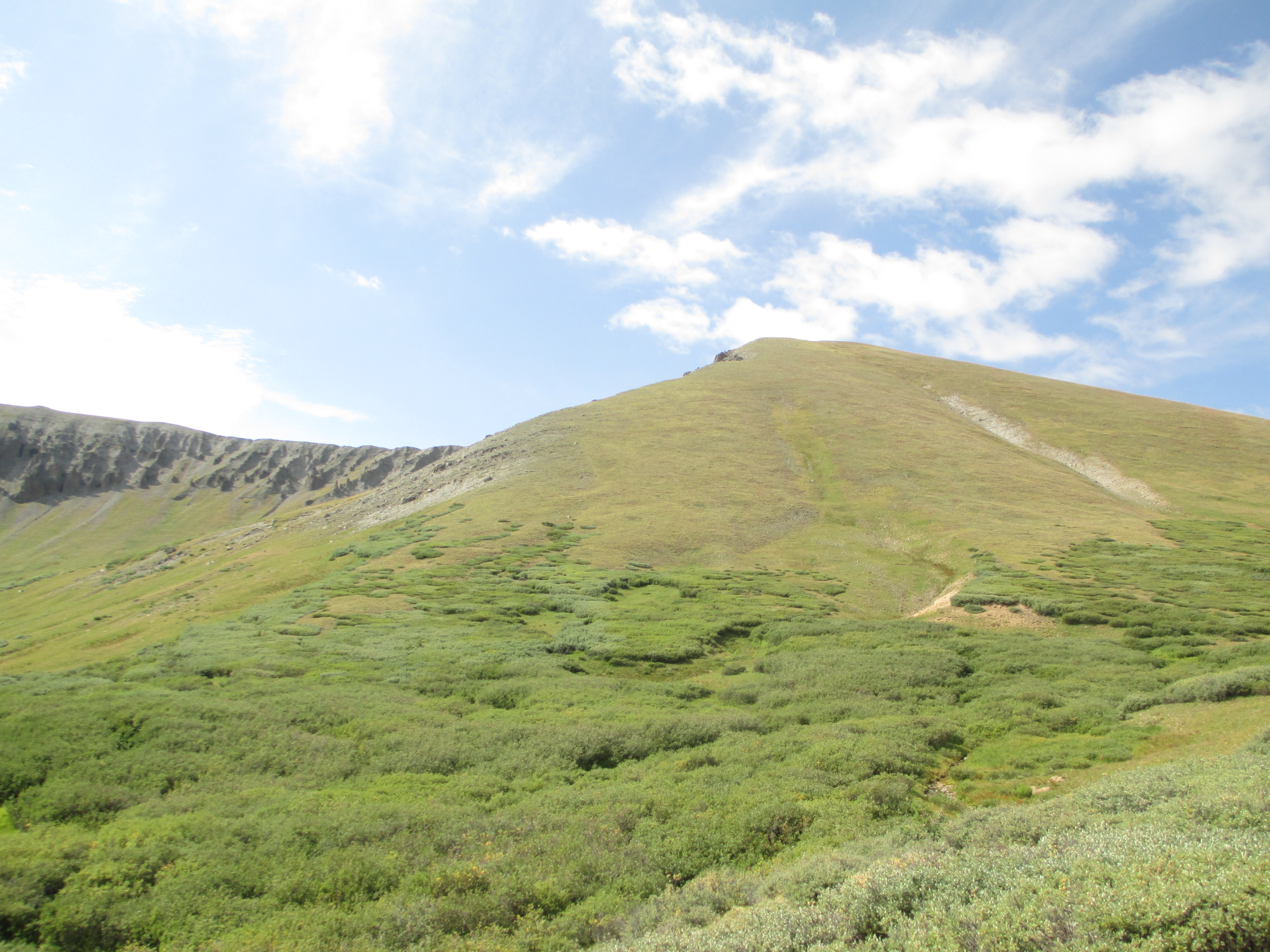 As I approached the saddle, the climb got much steeper, and I had to stop several times. There was a party of 4 at the top, looking down at me. I finally made it up to them. It was windy and cold, and I was hungry, but I had to hurry to climb the peak! I put on some warmer clothes, grabbed a snickers bar to put in my pocket, put my rain cover over my pack, and stashed it in a little ditch with the day hikers’ packs. Before I was ready, the other hikers headed for the peak and told me to enjoy my hike. “I’m coming with you!” I said. (The Colorado trail continued in the opposite direction of the peak). The girl told her father what I said and he responded, “She’s serious!”. (Yeah, she is…!)