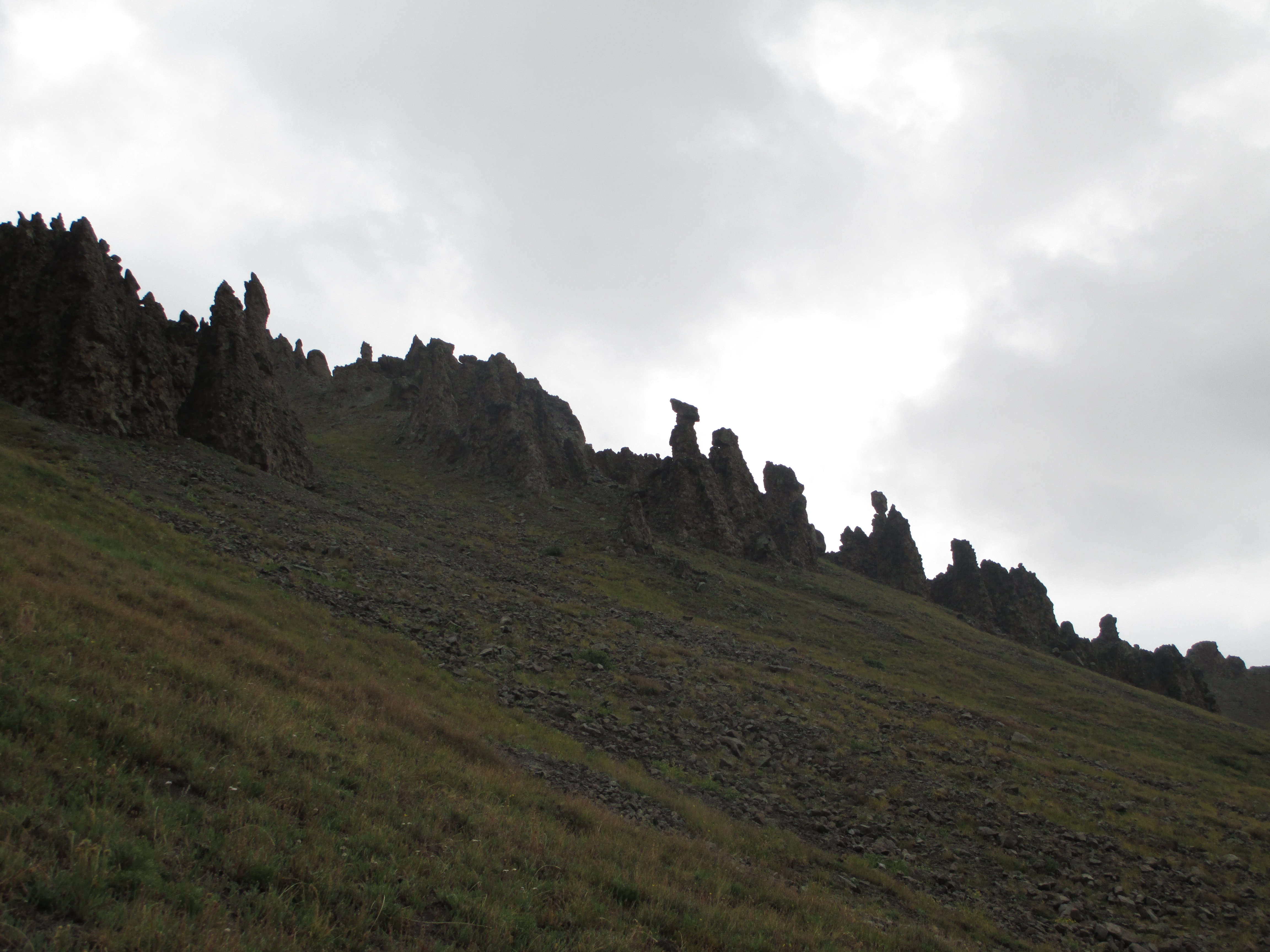 Once making it to our gear, we all quickly collected our things. The struggling girl and her boyfriend ran past us down the trail, calling out thank yous to the father for offering his help. I walked quickly and assumed the middle position between the two groups. The landscape was beautiful, but it had begun to rain again, and we all hiked as quickly as we could. The first group was definitely on a mission to get out of this weather as fast as humanly possible. The second group took their time, talking amongst one another. I noticed some interesting rock formations that looked like sculptures of people. I kept stopping to take out my camera, and then stashing it away again. The openness of the landscape reminded me of Switzerland and I felt happy when not rushing to escape the lightning.