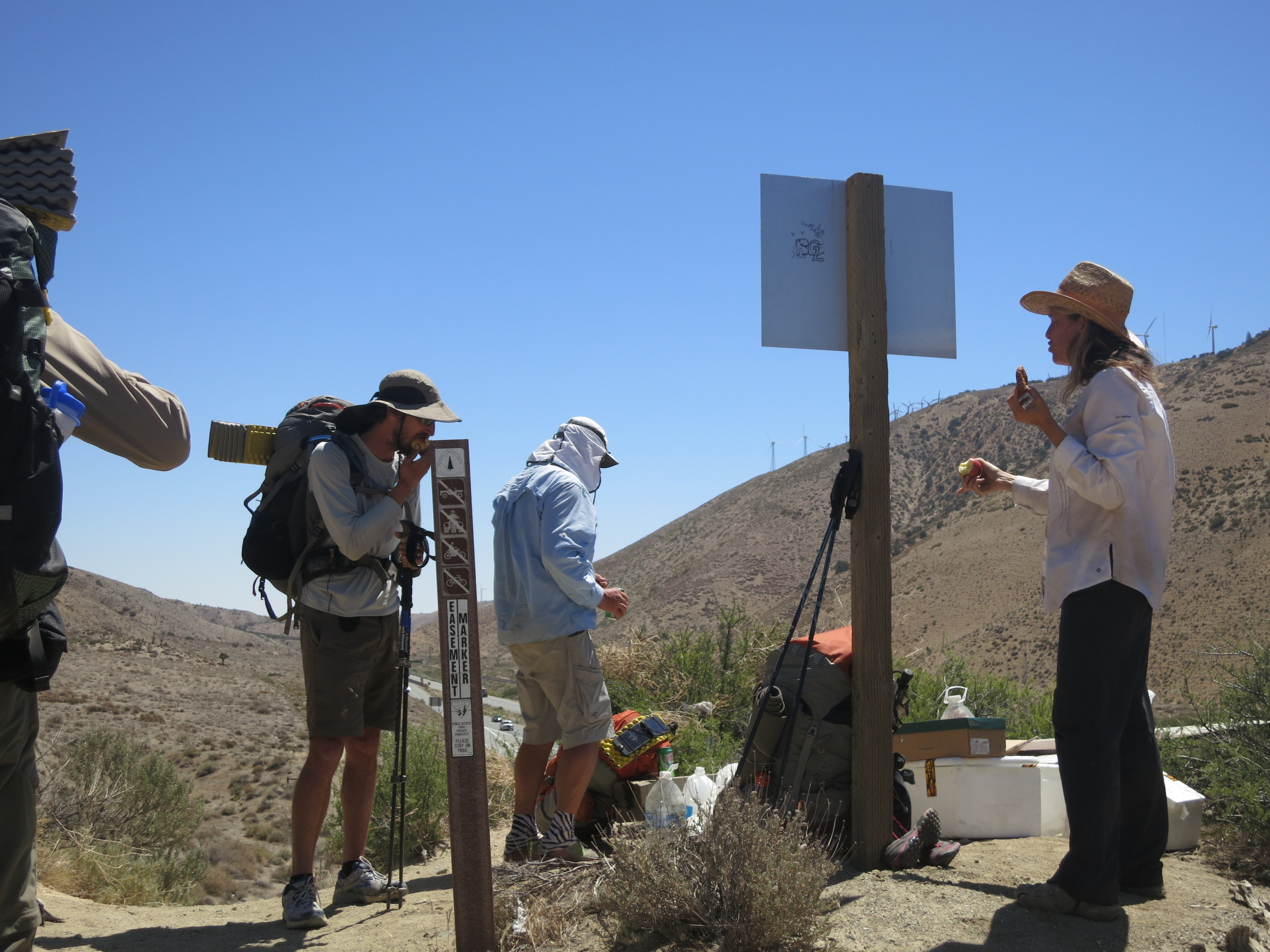 We walked over the highway 58 overpass and soon found a display of trail magic treats that had been left by Chief’s wife! She had left homemade cookies, apples, and soda, and while I definitely did not need any of this food, we all stood around and enjoyed it for a few minutes. Icebucket was having some problems with his most recent download of PCT maps and waypoints and was only getting an image of the Atlantic Ocean, which I thought was funny.