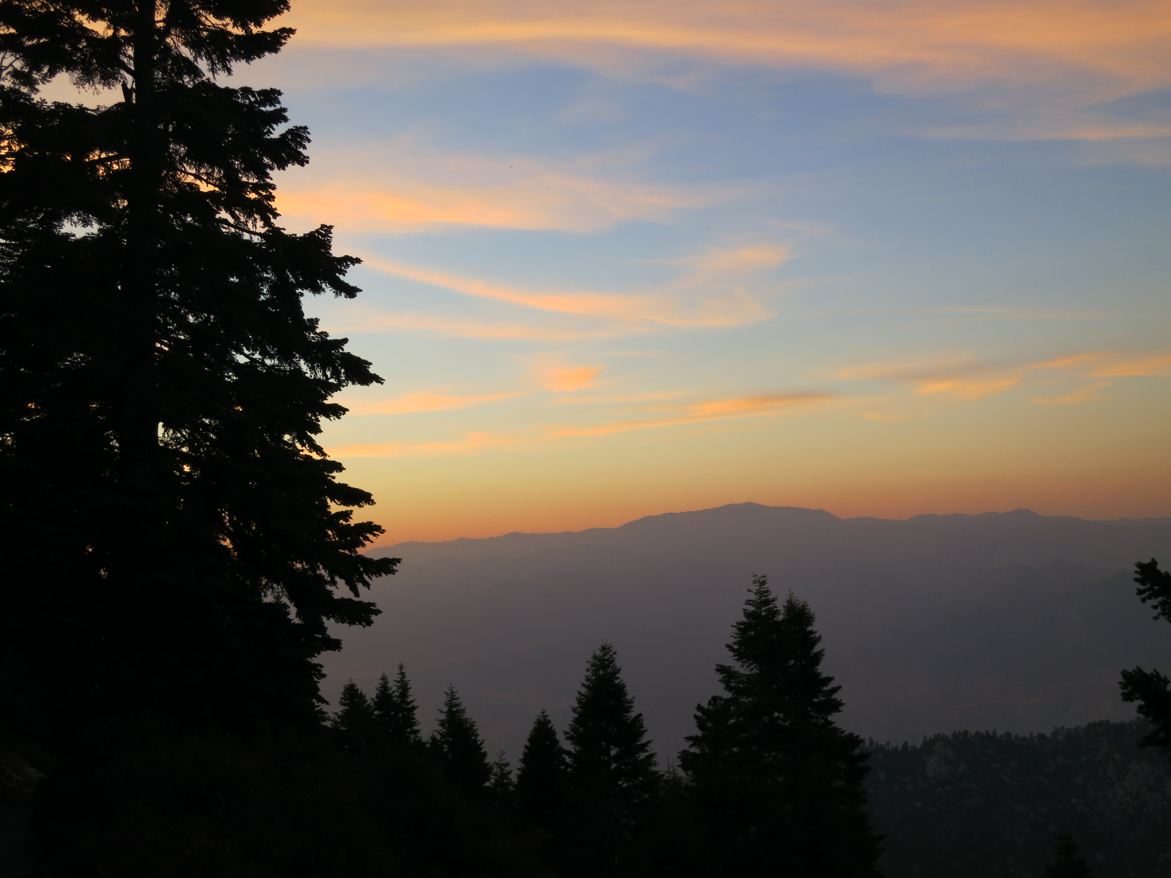 Sam, who had given me the kiwi, and his friend made it up to the summit as the others turned back and they asked me more about my hike. They assumed I had grown up backpacking with my family as a kid, but I told them that this was something I discovered on my own. They shared a couple more treats, including some pepperoni and cheese from Trader Joes’s (amazing!) before heading back down. Since I had a little cell reception, I took the opportunity to call someone from back home, who I hadn’t been able to reach since I was out here. While I was having a great time on top of the second tallest peak in Southern California, he was in a grumpy mood. We kept getting cut off, so I headed back down the rock scramble and made my way towards the PCT hoping that he would be able to find the same kind of freedom and happiness in his life that I had found out here. I collected water and then caught up to Kim who was still amused at the summit entertainment. I told her it was keeping me amused, too! She said she was going to start calling me “model”. A little ways ahead, I found Anastasia, Archie, and Joey (Leftovers), on the side of the trail having a snack. They were talking about walking all night until they arrived at trail angels’ Ziggy and the Bear’s house. We had a notoriously long, hot, waterless, never-ending descent into Cabazon before reaching this little haven. I knew I wasn’t going to be able to hike all night but decided to hike as far as I could and do at least part of the awful descent when the sun wasn’t burning down on me. Kim and I hiked a bit together as the sun set. “We’re walking into the sunset!” I said.