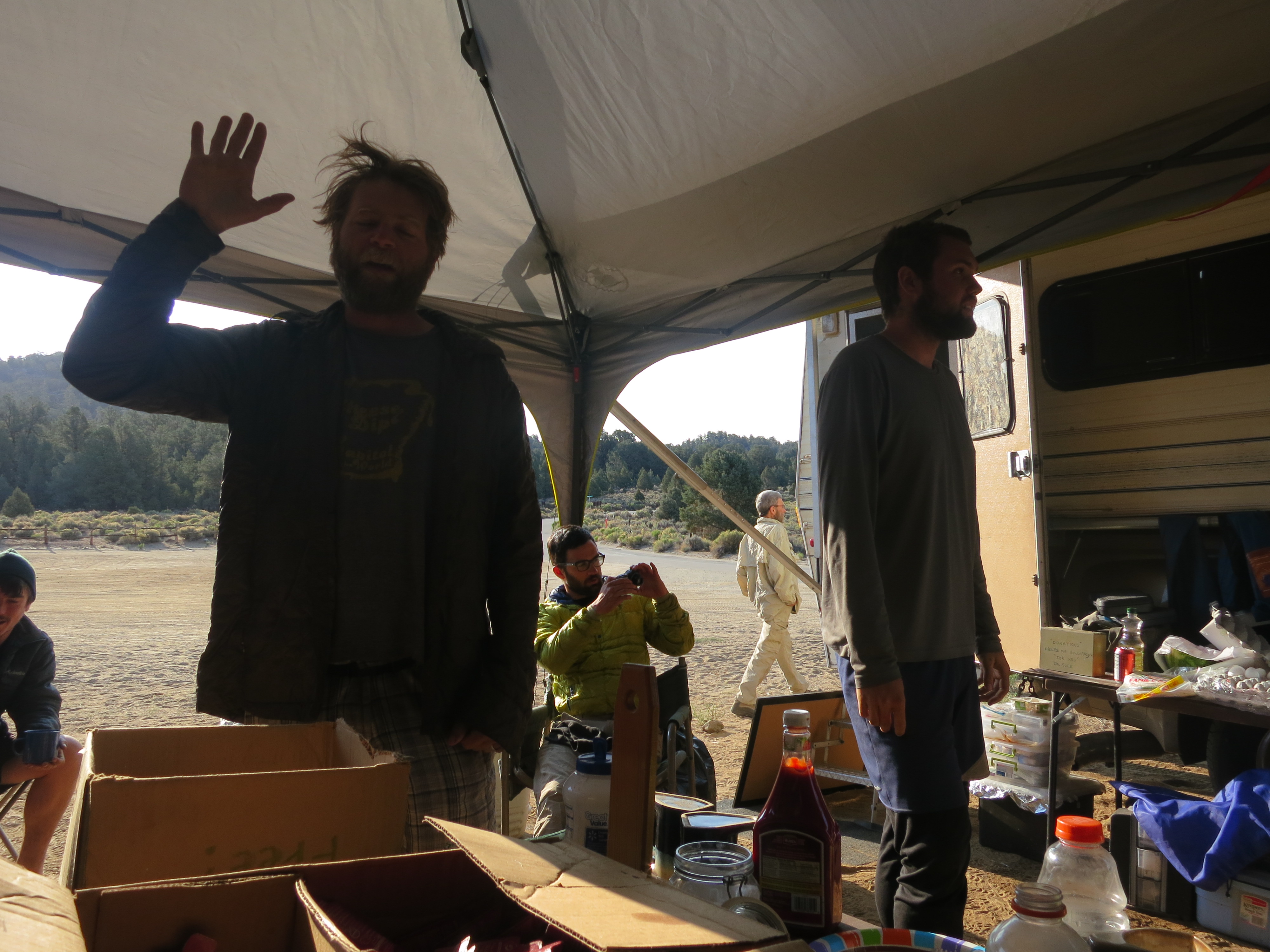 We found some folding chairs to sit in under the already crowded awning besides Dr. Sole’s RV. We were served chorizo burritos and coffee. I didn’t think it was the best thing for my stomach, but I ate it anyway.