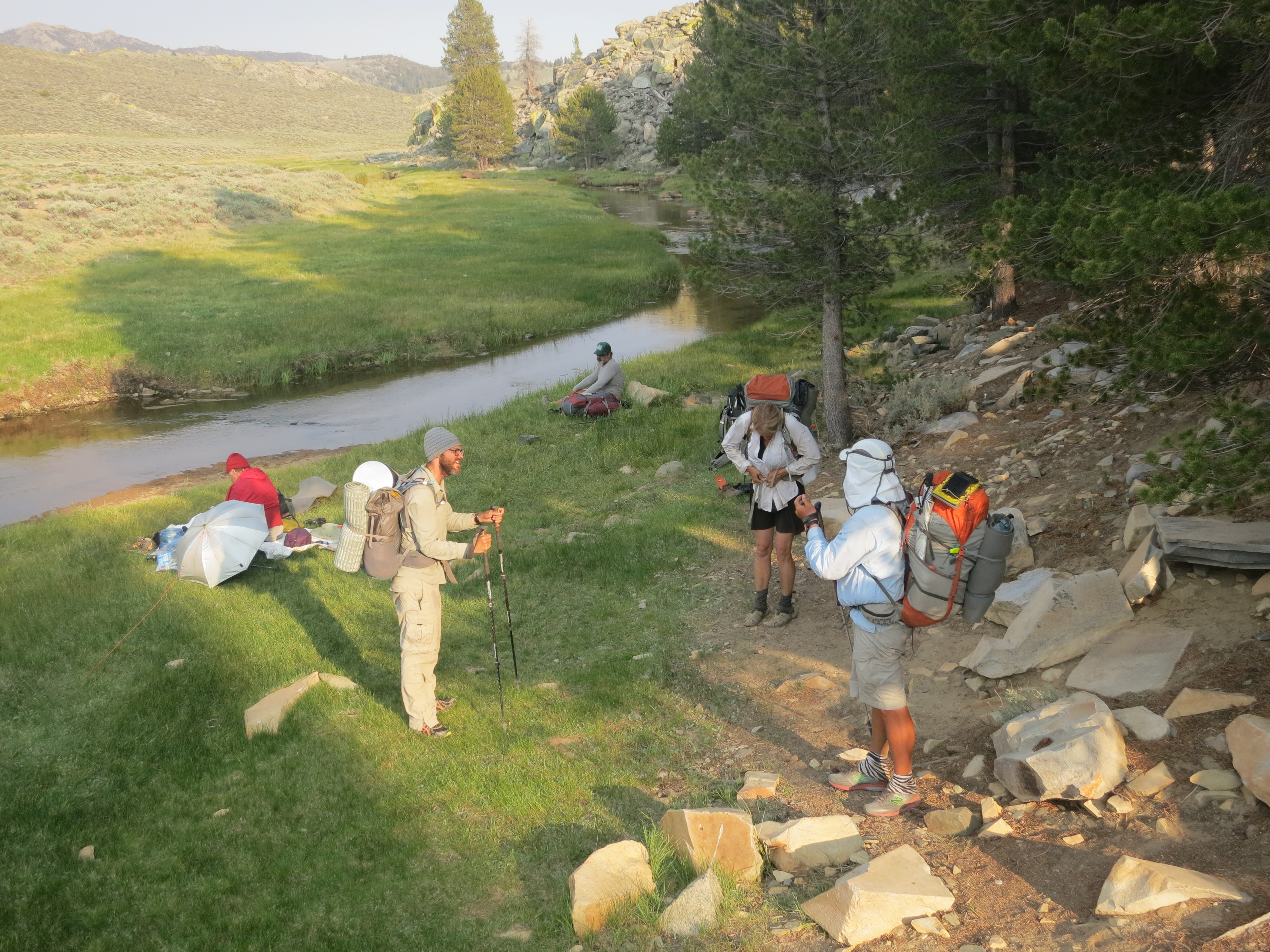 A couple of miles away, there was a campground that Weeds said they would stop at to get water. I arrived there ahead of everyone else, used the restroom, and tried to fix the gaiters that I had used on the AT and CT, that now seemed way too big with the socks I was wearing. I wished I could get rid of them immediately, but I was stuck with them at least until I got off Kearsarge Pass. I also discovered that I had already lost one of my snow baskets! The entry into the Sierras was not going so smoothly!