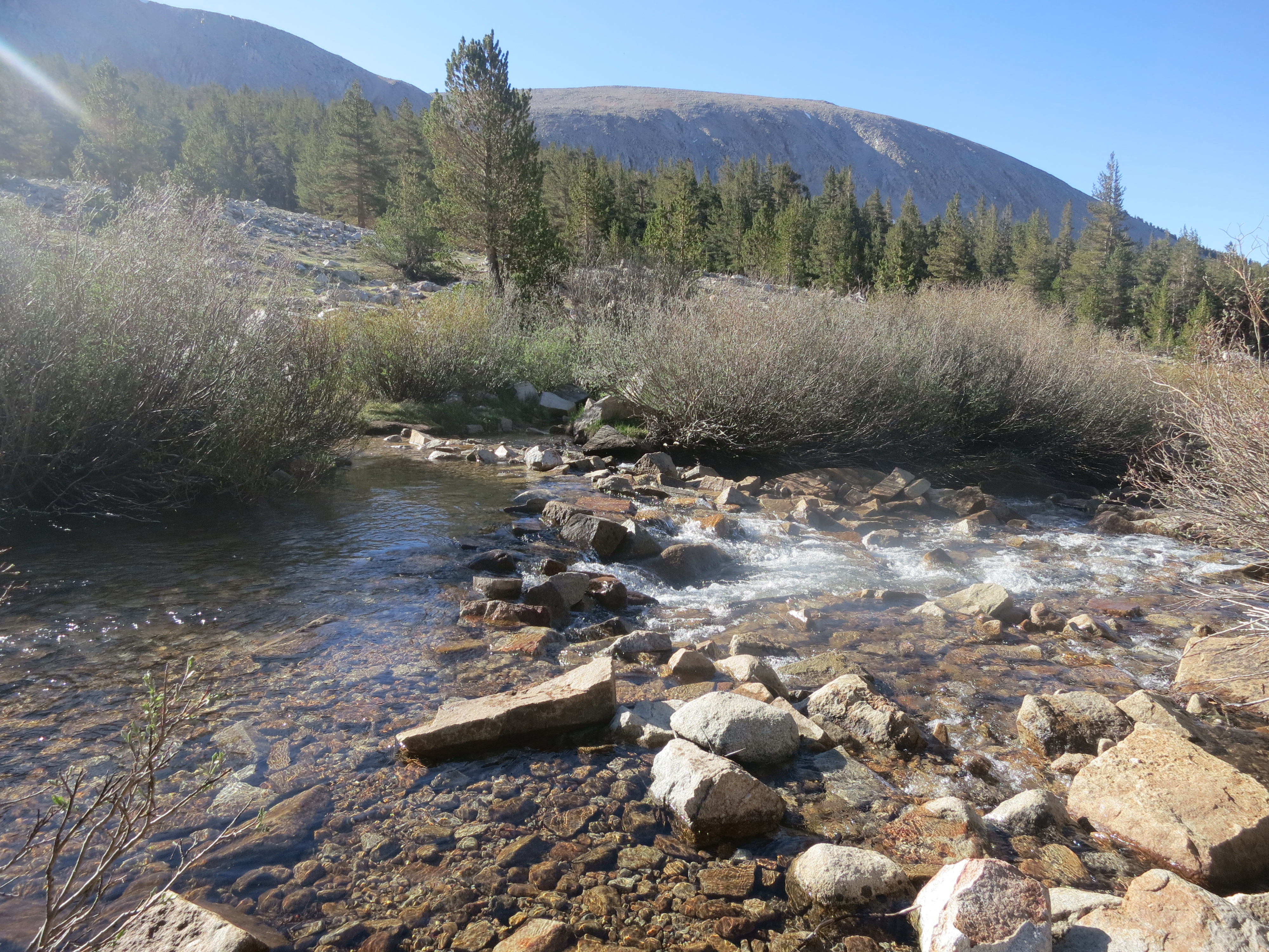 I held them in my palm until I was ready to eat breakfast, went through my food bag and offered some of my extra food to Bambi in exchange for the antibiotics. The boys packed up and Bambi said he would see me on top of Forrester. “But I’m not ready to leave yet!” I said. I was hoping to be around someone that could take my picture at the top. He said he was planning on taking a long break up there and would most likely still be there when I arrived. I still had to finish eating, find a place to go to the bathroom, and pack up. I headed out about twenty minutes later and soon came to the creek that I had advised everyone to wait until morning to cross. I was amused to see that it was actually no big deal to cross. (I was still anticipating the freezing cold, thigh or chest high waters I had heard so much about!). The morning hours were pleasant and I moved through a landscape of Sierra trees and grass that shifted into open spaces between huge granite mountains.
