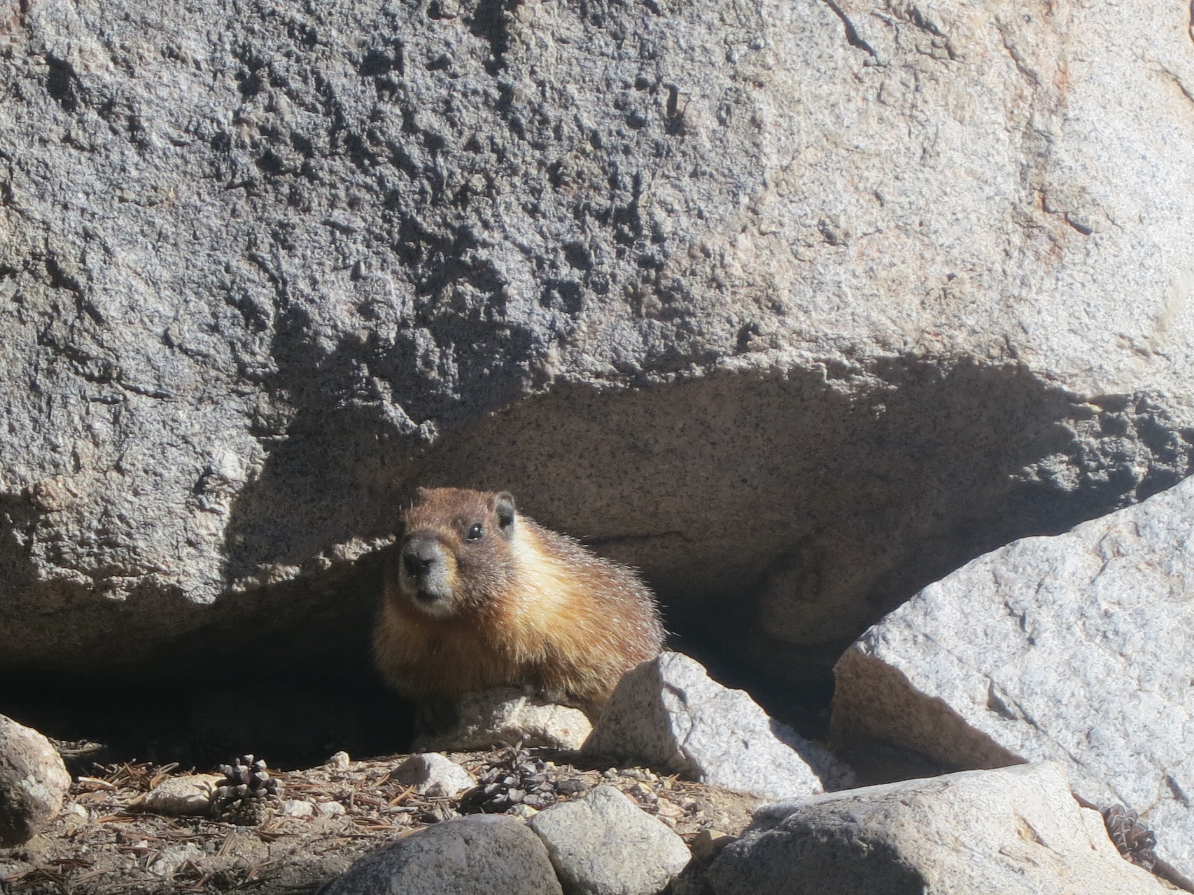 We started the climb. Up, up, up we hiked as the minutes ticked by. We would not be descending to a highway, but a trail head parking lot, where the chances of getting a ride grew slim in the evening hours. I kept my mind focused on moving forward. Just before I arrived at the top of the Pass, I heard Bambi talking to someone. Maybe he is on the phone, trying to get us a ride! I had heard that there was cell reception at the top of the Pass, but it turned out that neither of us had any. Bambi was just talking to a curious marmot, trying to complement him so that it would come close enough that he could pet it! It never came that close.