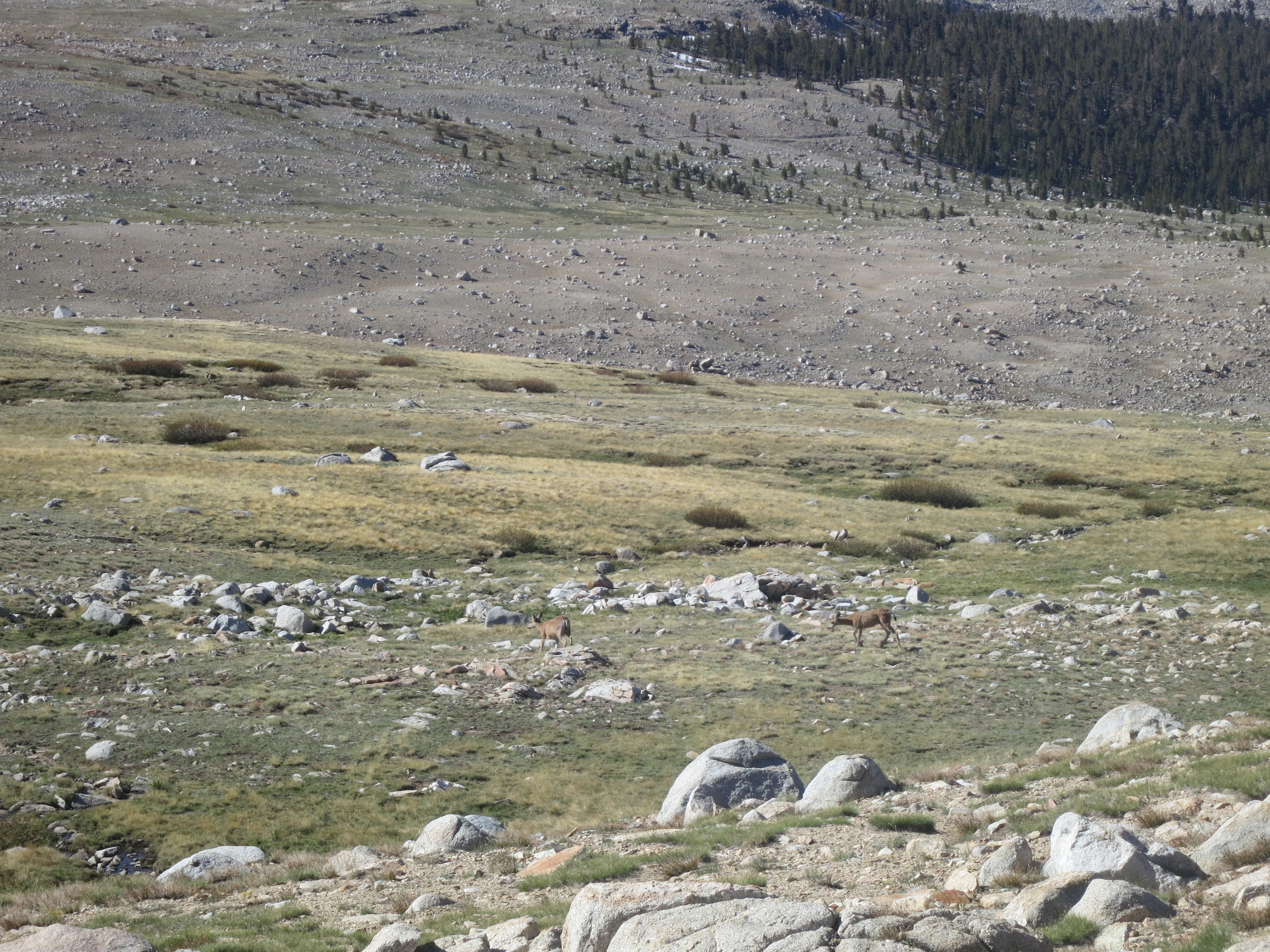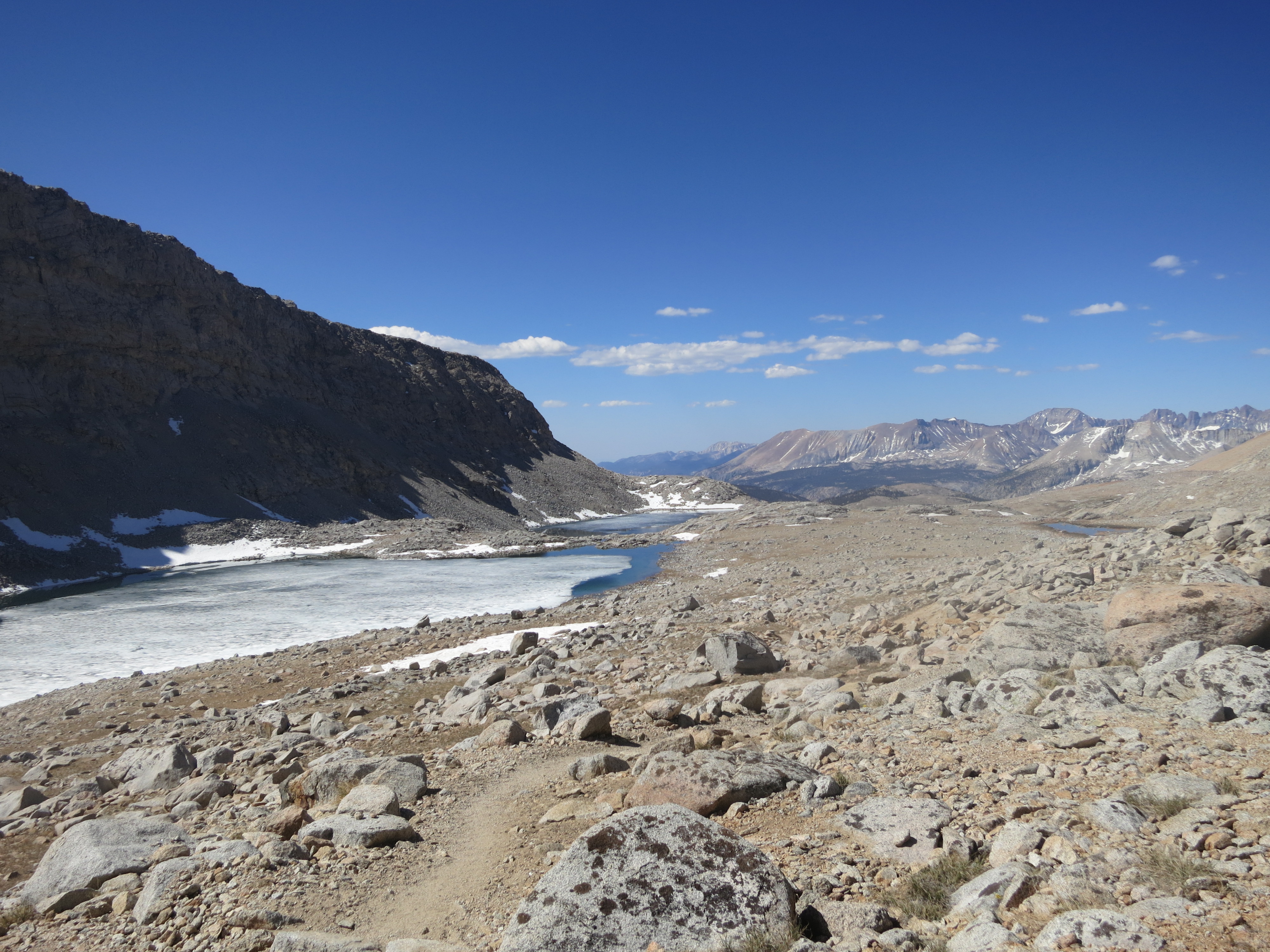 I stopped to take off a layer and spotted two deer in the distance and watched them for several minutes. I liked being alone with the animals. As I climbed into the more desolate rocky environment with ice encrusted ponds, I looked ahead to see if I could figure out where Forrester Pass was. In a snow packed year, I strongly doubted that I would ever be able to find the trail. It was only because I had seen a few pictures of Forrester that I was able to vaguely figure out where I was headed.