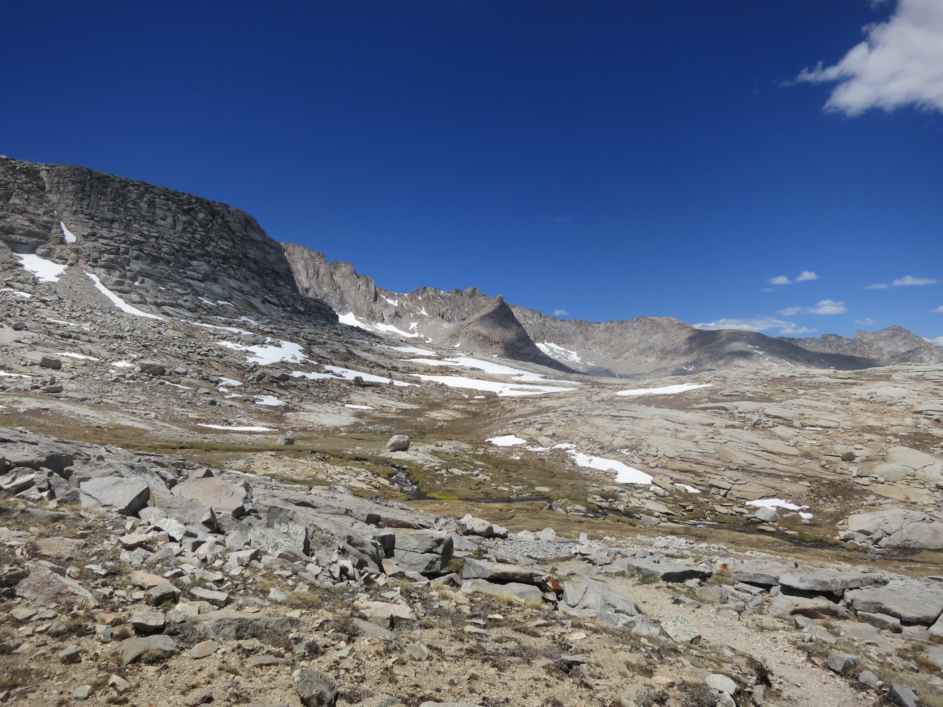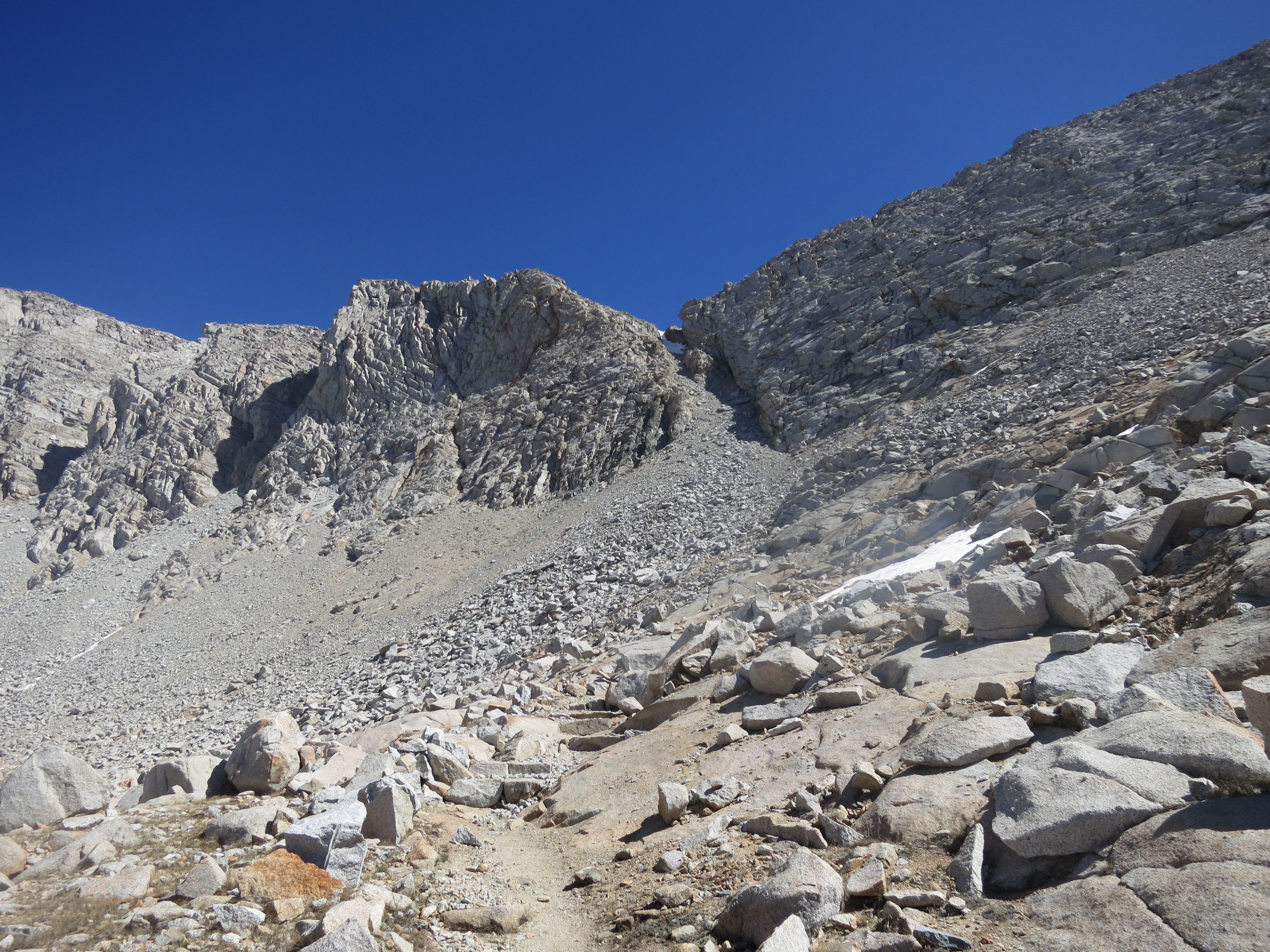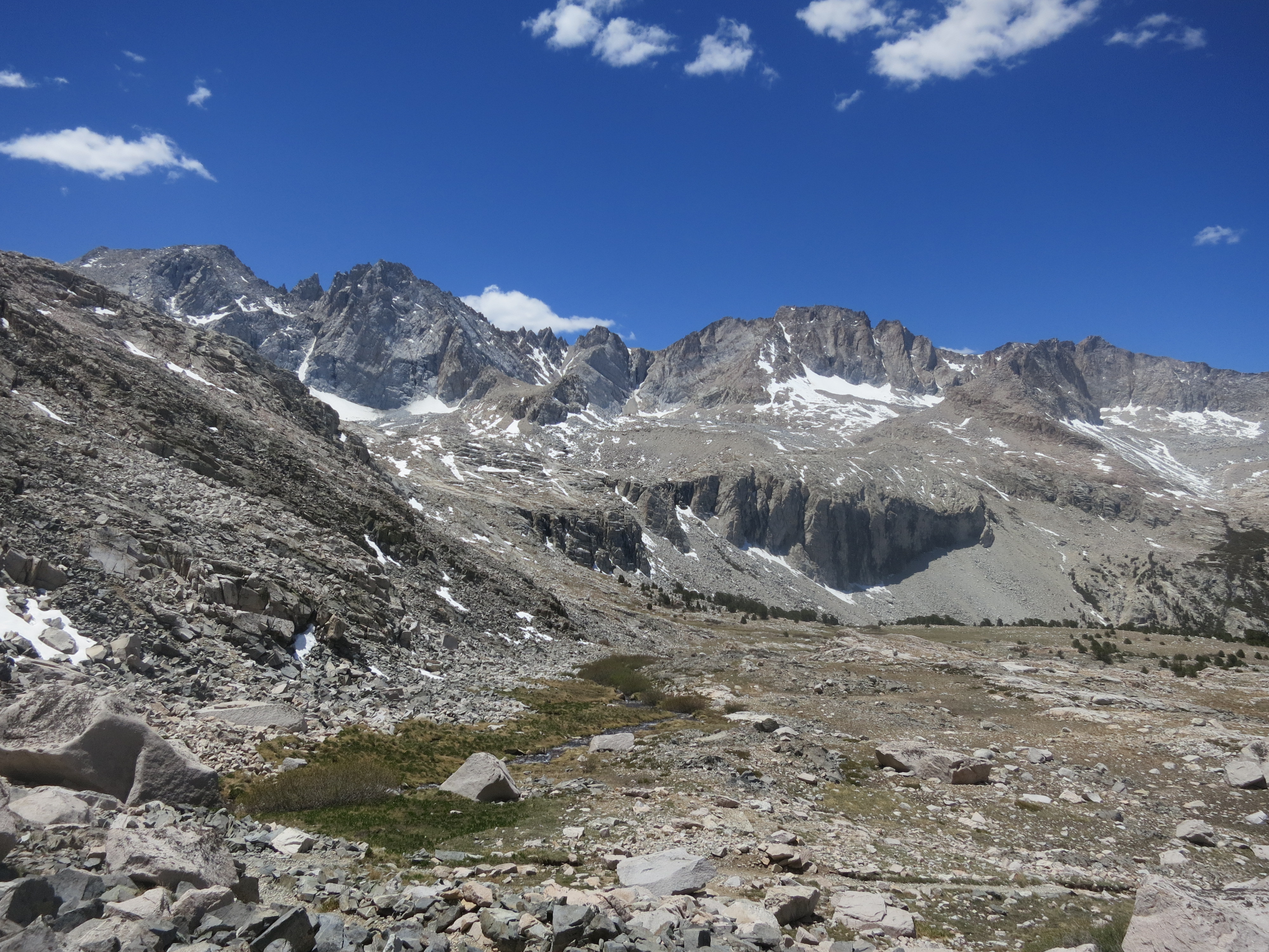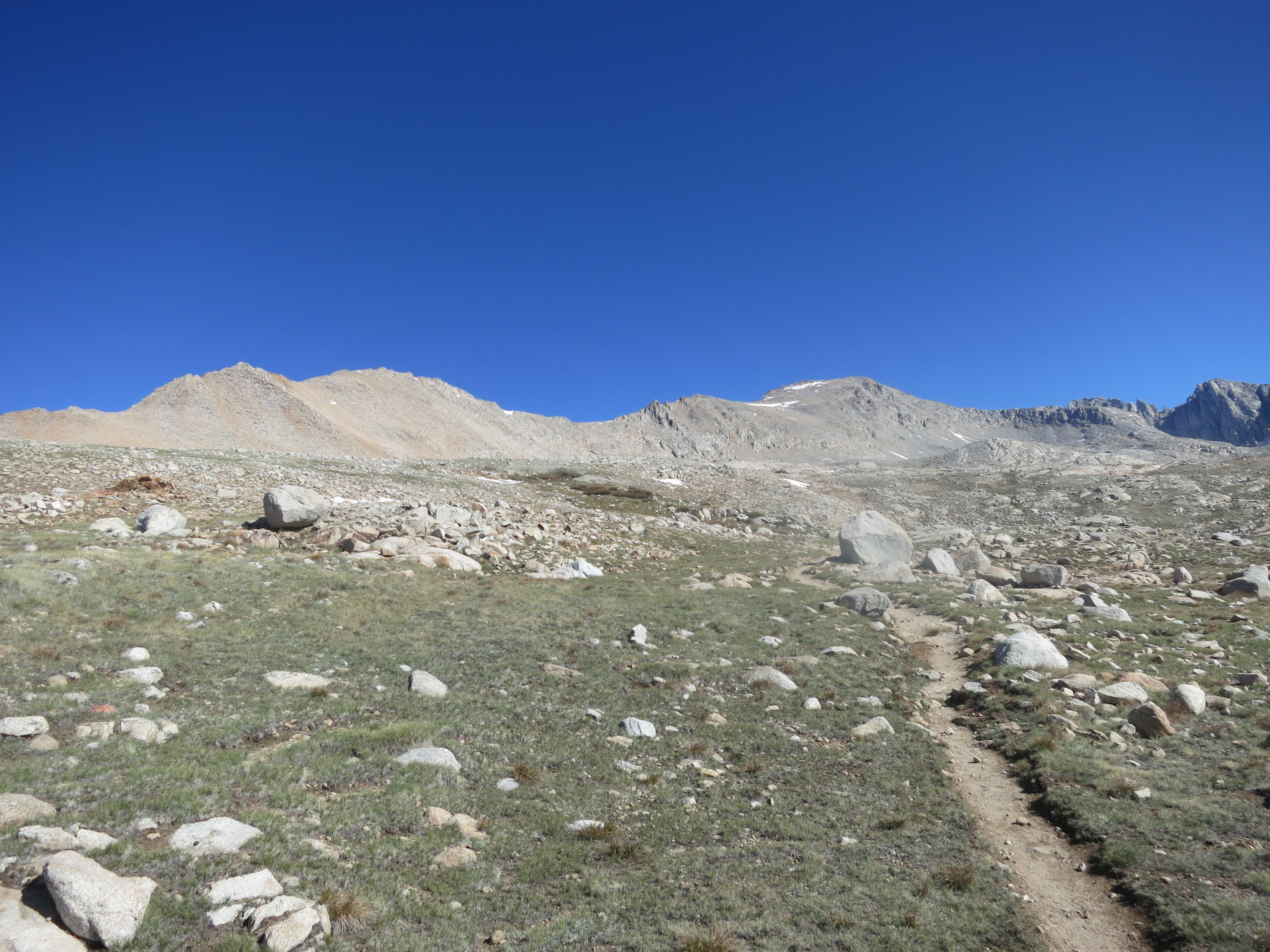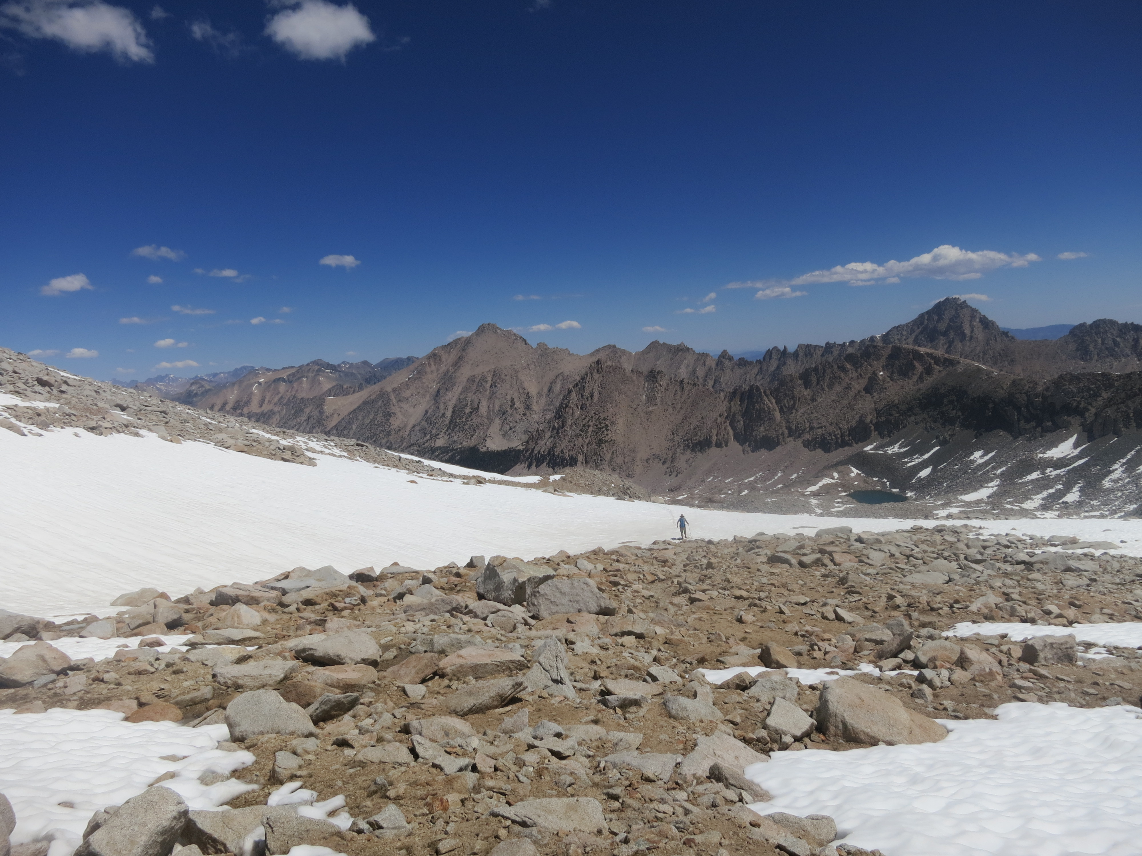 I saw a hiker ahead of me who I had never seen before and guessed that he must be hiking the John Muir Trail (from Mt. Whitney to Yosemite). He seemed to be hiking pretty slow. I took a break and looked up at the Pass, where I could make out a figure at the top. I still had a long way to get up there and hoped they would still be there! I moved on, taking many pictures of the incredible views around me.