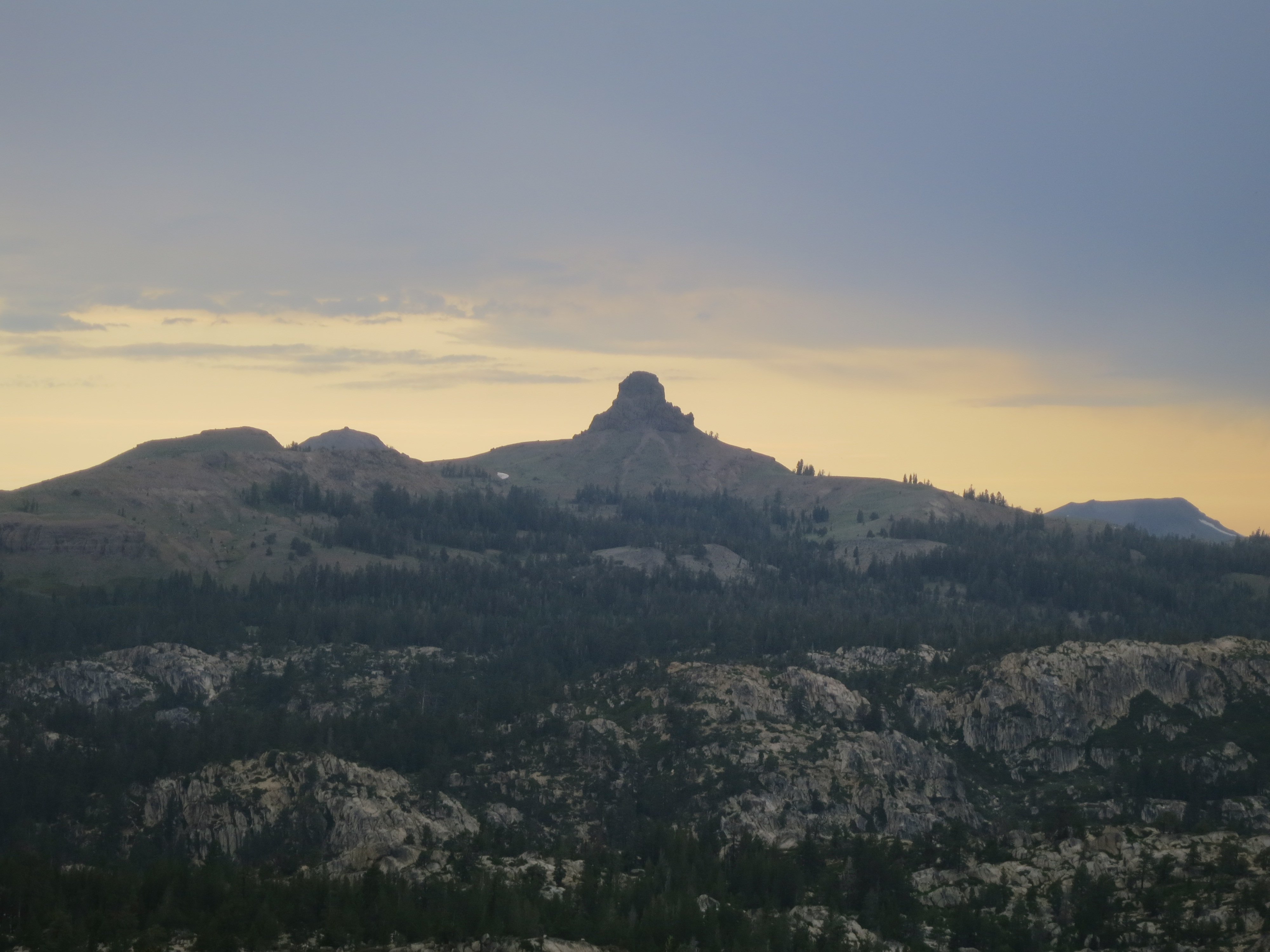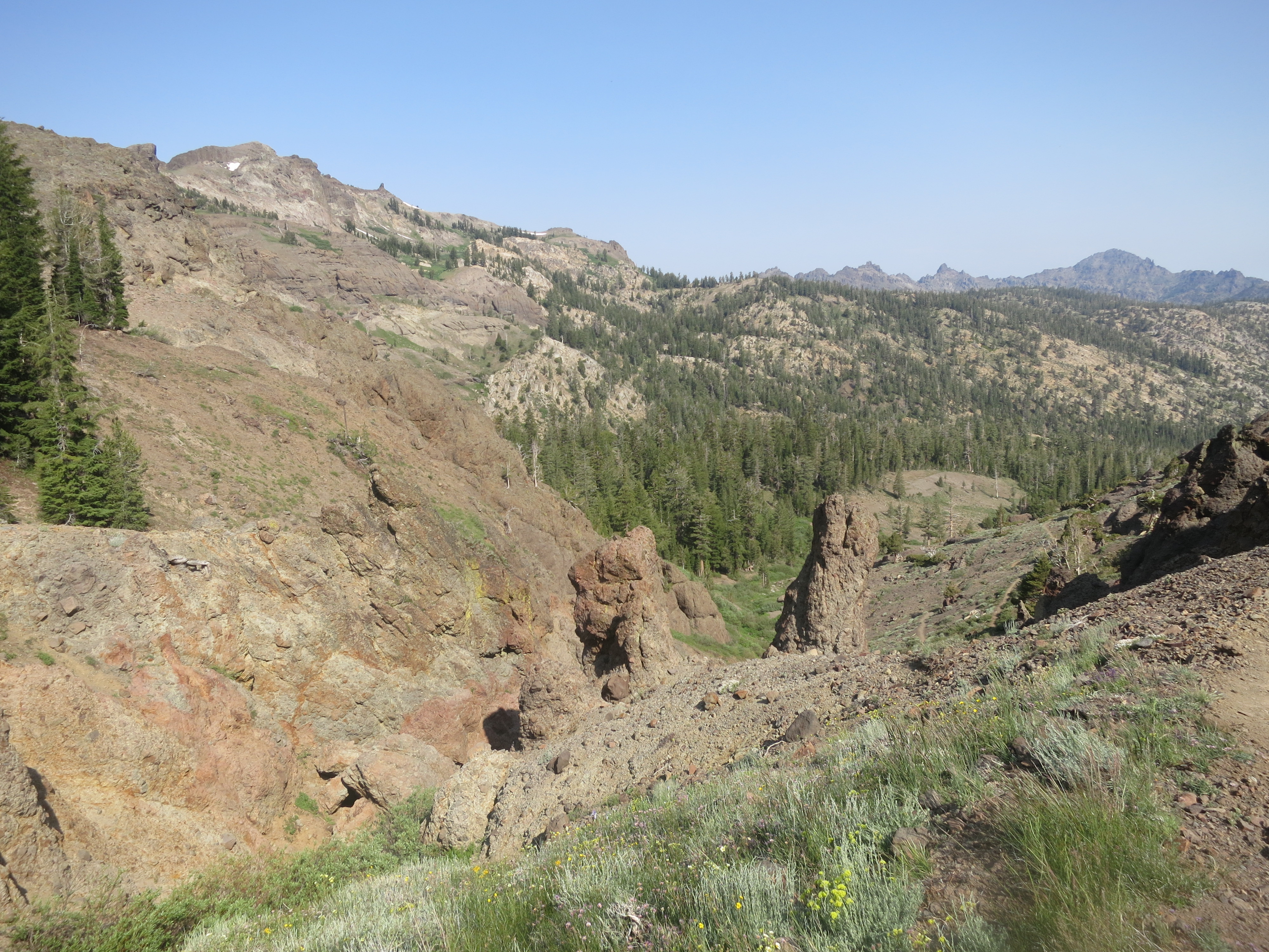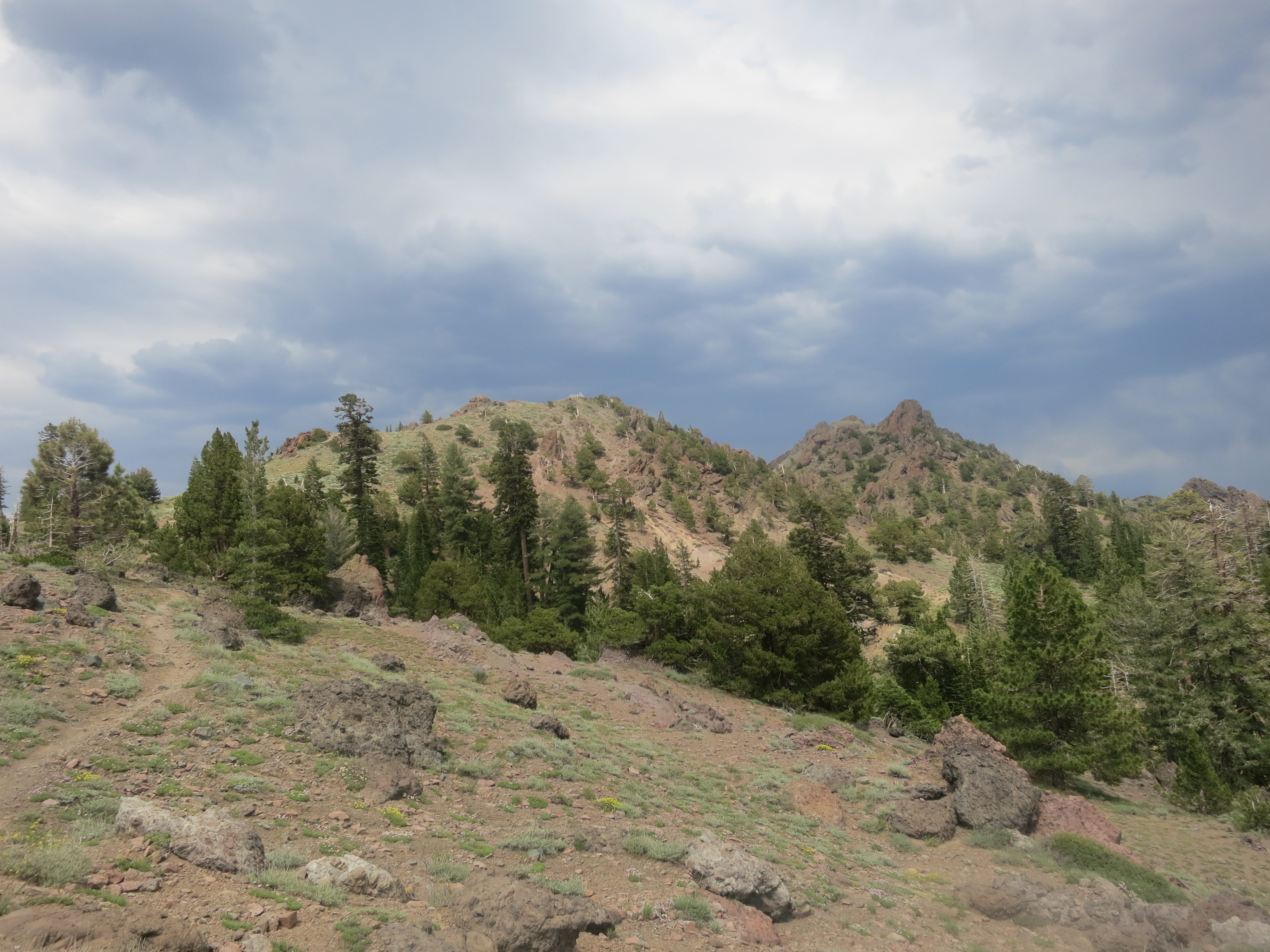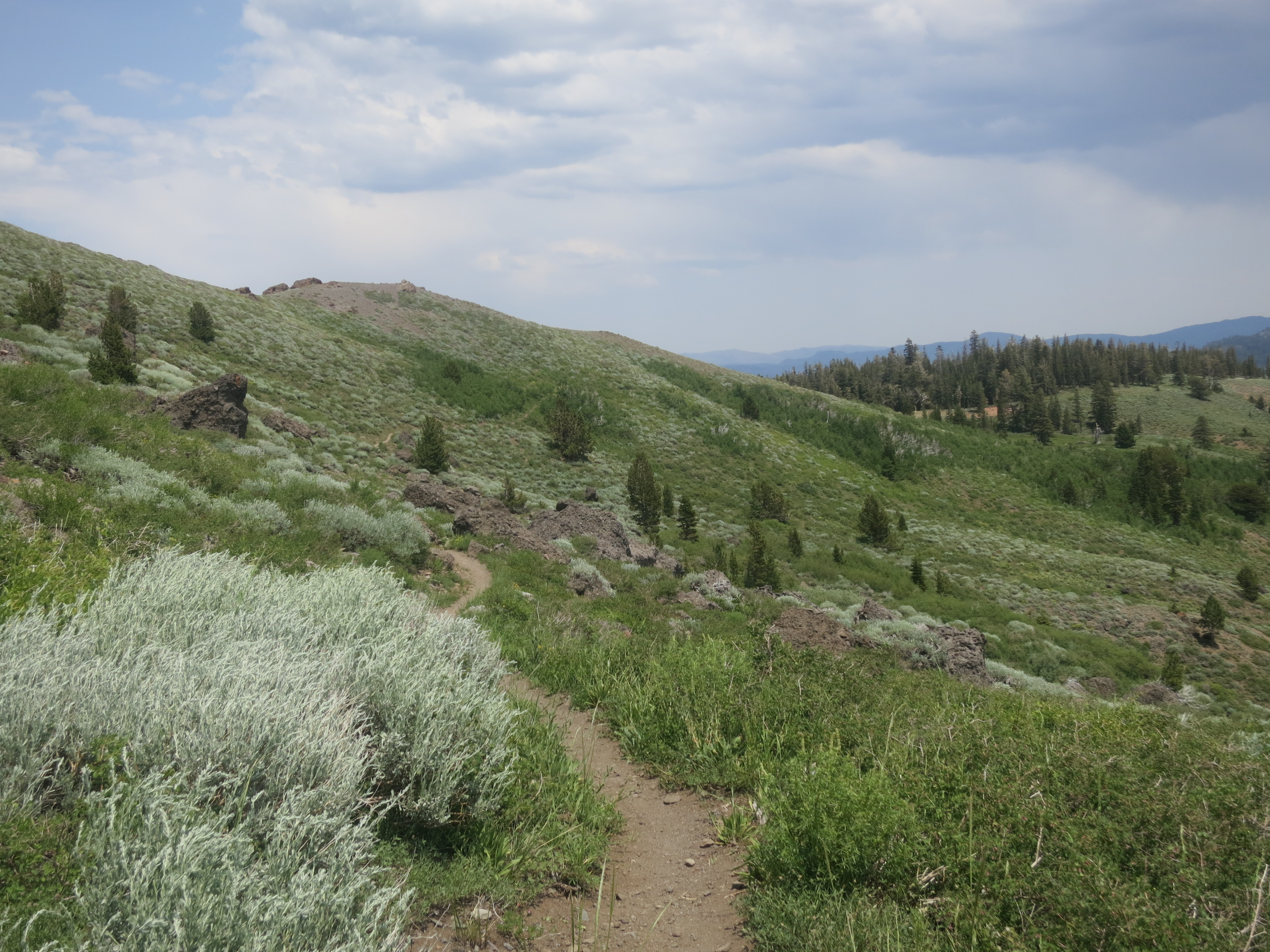 I kept my eyes peeled for the red cooler that 5-Star had mentioned, but it was not appearing in any of the places I thought it would! I crossed a road, looked around, and still saw nothing. Maybe I had missed it. Scat Tracker and Unicroc were sitting down, eating a snack a little ways into the forest. “No cooler?” I asked. They laughed and said they were just talking about that, hoping to come across some trail magic. “No, really,” I said. “I was told there is a cooler around here.” They told me to yell back to them if I found it. I walked up the hill and suddenly, the red cooler appeared to the right of the trail! I called back to Unicroc and Scat Tracker and they came up to share the gatorade, apples, and chips. I didn’t know how these things would be on my stomach, but I appreciated the offerings. Anything different is so refreshing on the trail! I asked them if they happened to be carrying Yogi’s guidebook pages, as I had no info on anything in South Lake Tahoe due to my box not getting to me. Luckily, they did, and I was able to take pictures of the town notes. Another hiker approached, followed by three more, who were moving slowly and looking at us warily. They said that six or seven more were on their way. Yikes! I jumped up and got going. Very soon afterwards, my intestines demanded they be emptied. I didn’t have time to find a place far off the trail. Scat Tracker and Unicroc walked by a minute later.
