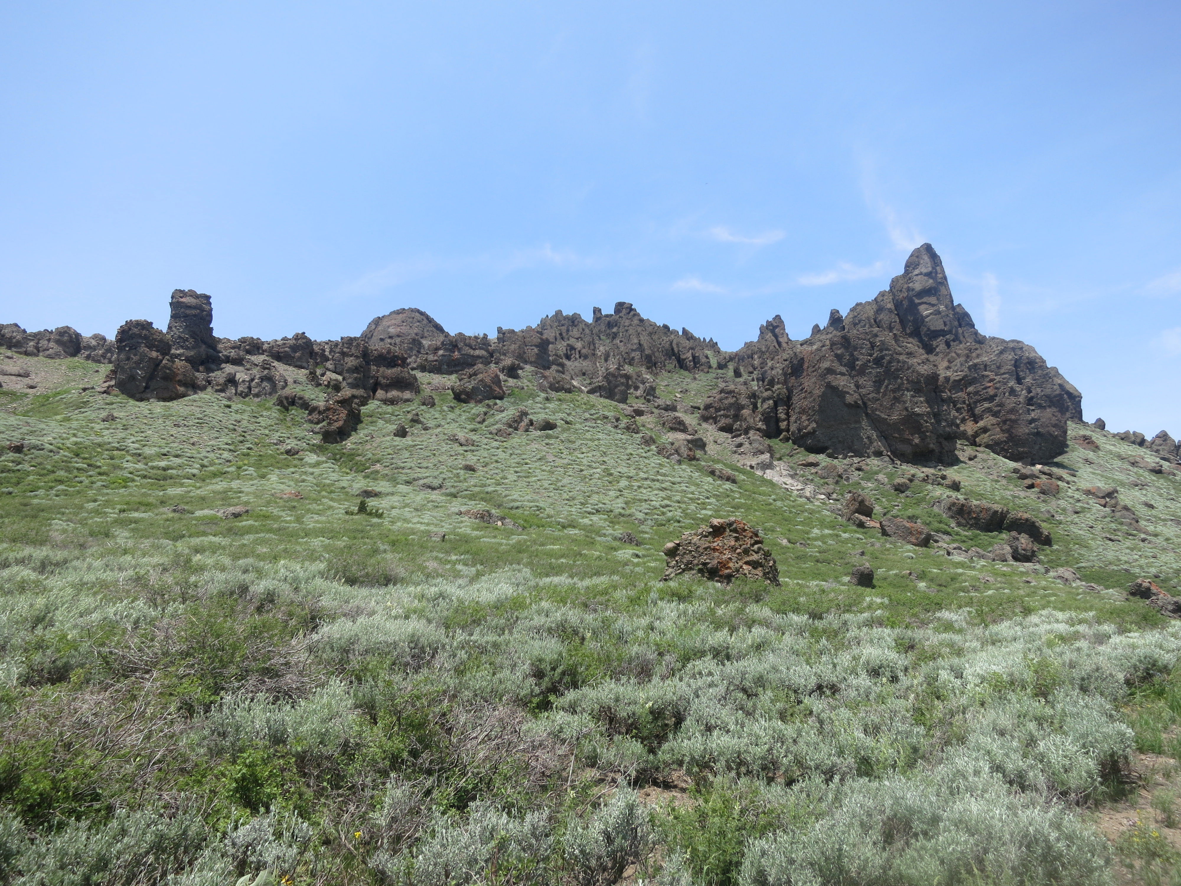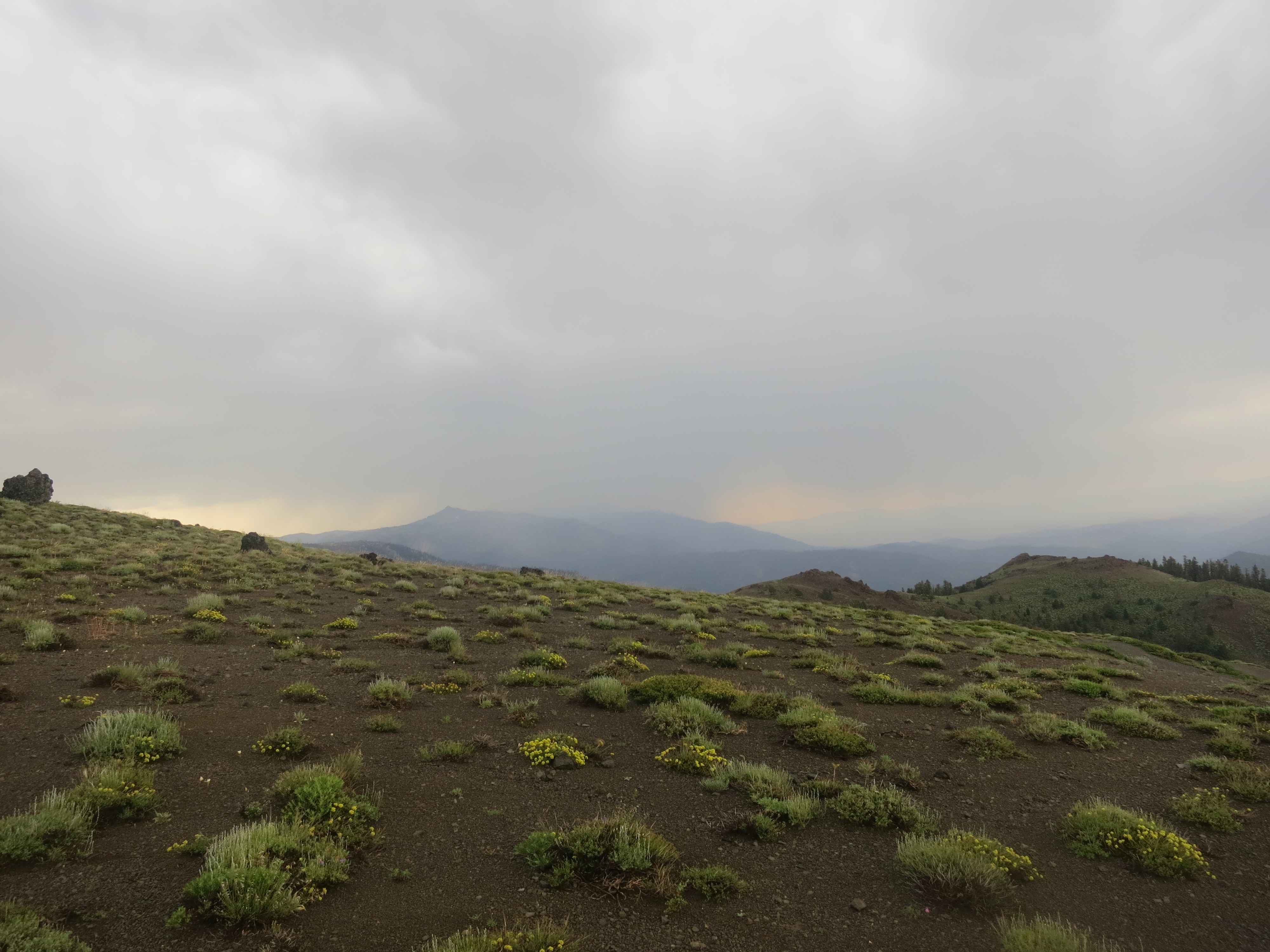 I continued along, climbing up the dirt path, surrounded by yellow flowers on both sides, and then heading back down and continuing along a more exposed path. Two of the wary-looking hikers from the trail magic cooler caught up and passed by me, hiking hard and not greeting me. When I reached the top of the next climb, I stopped to eat a power bar as the third guy passed. I had hoped to camp at a particular site and was worried that everyone else planned on stopping at the same place.