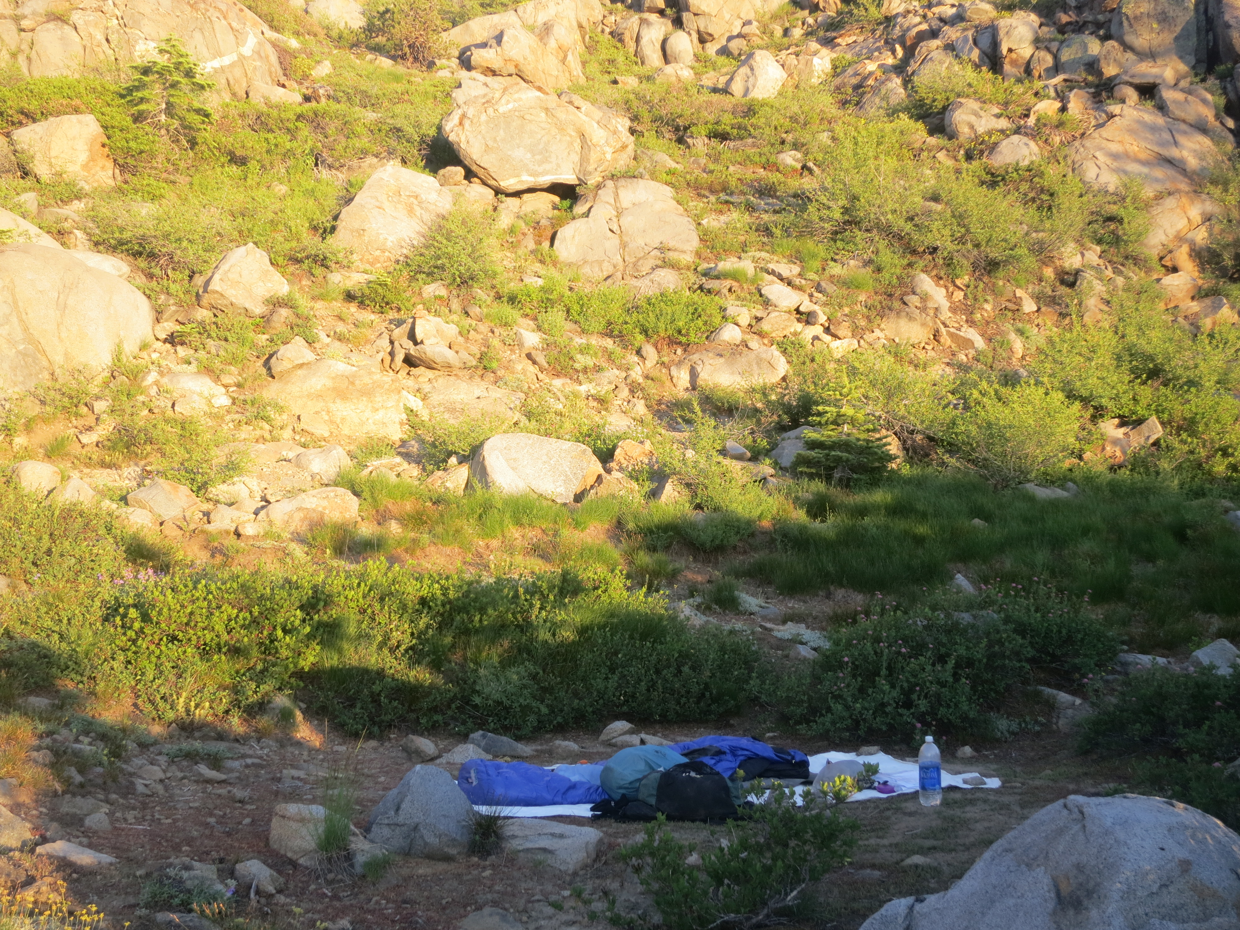 As I walked on, I came to some signs, noting the historical significance of Donner Pass, which I was approaching. Since I had sent a resupply box to the post office in Soda Springs, I had to end my day before I reached Highway 40 so that I could hitch in in the morning. (A lot of the other thru-hikers were walking straight to Sierra City and part of me wished I needed need to take the time to stop here). I walked by four hikers who were finishing up their two day hike. The woman asked me, “Did you have a good time?”. I wanted to tell her to ask me in 2 and a half months! Right now, I was in the middle of my hike! Again, they were impressed with how long I had been out for. I searched the surrounding areas for a place to camp, but nothing suitable was appearing. I secretly hoped this this group of people might offer to let me stay at their home with them and take me to the store in the morning, but they did not offer. I was now less than a mile from the road and descending switchbacks with no flat areas. However, a perfect spot magically appeared with a half mile to go! It was a little too close to the trail for my comfort, but it would do. I set up my cowboy camp, cooked my dinner, and watched the sun disappear behind the mountains. I realized that, although I was still 200 miles away from the halfway point in distance, that I was already halfway finished with the trail by the number of days. After I picked up my resupply box in Soda Springs, it would be time to start putting down the miles!