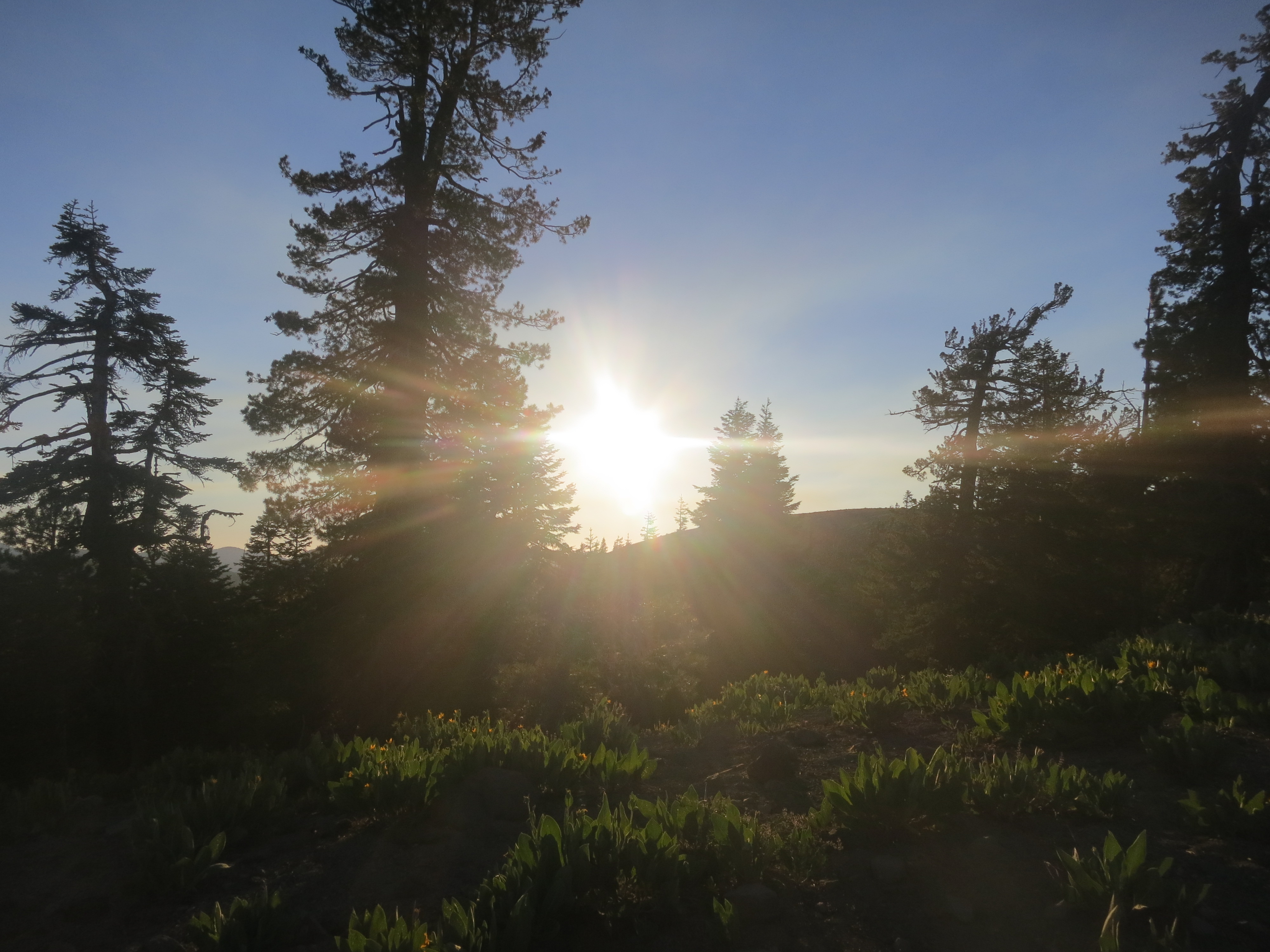 I sat down on a rock along the trail and ate a Snickers bar to try to boost my energy for the last few miles of the day. Then, Cuddles and Emma came along! It was nice to see them! We chatted for a few minutes and then followed each other in a line. Emma took the lead. This woman is absolutely amazing! She outdoes us in every department- looks, talent, and hiking ability! Tomorrow, she would end her 400 mile section hike with a violin concert with Cuddles at the Red Moose Inn in Sierra City. I fell behind slightly, and Cuddles took the middle space. Emma said she was willing to stop at anytime, and when they found a nice place to camp, decided to call it a night. I went on a little further in order to let them enjoy their last night on the trail together. I climbed a hill, saw an opening at a turn, and went to investigate. I found a real campsite! Unfortunately, it was an abused one with lots of broken glass. I set up camp, boiled water for my pasta, and then took it over to a log to watch the sunset. It was amazing! A deer even stopped in for a visit!