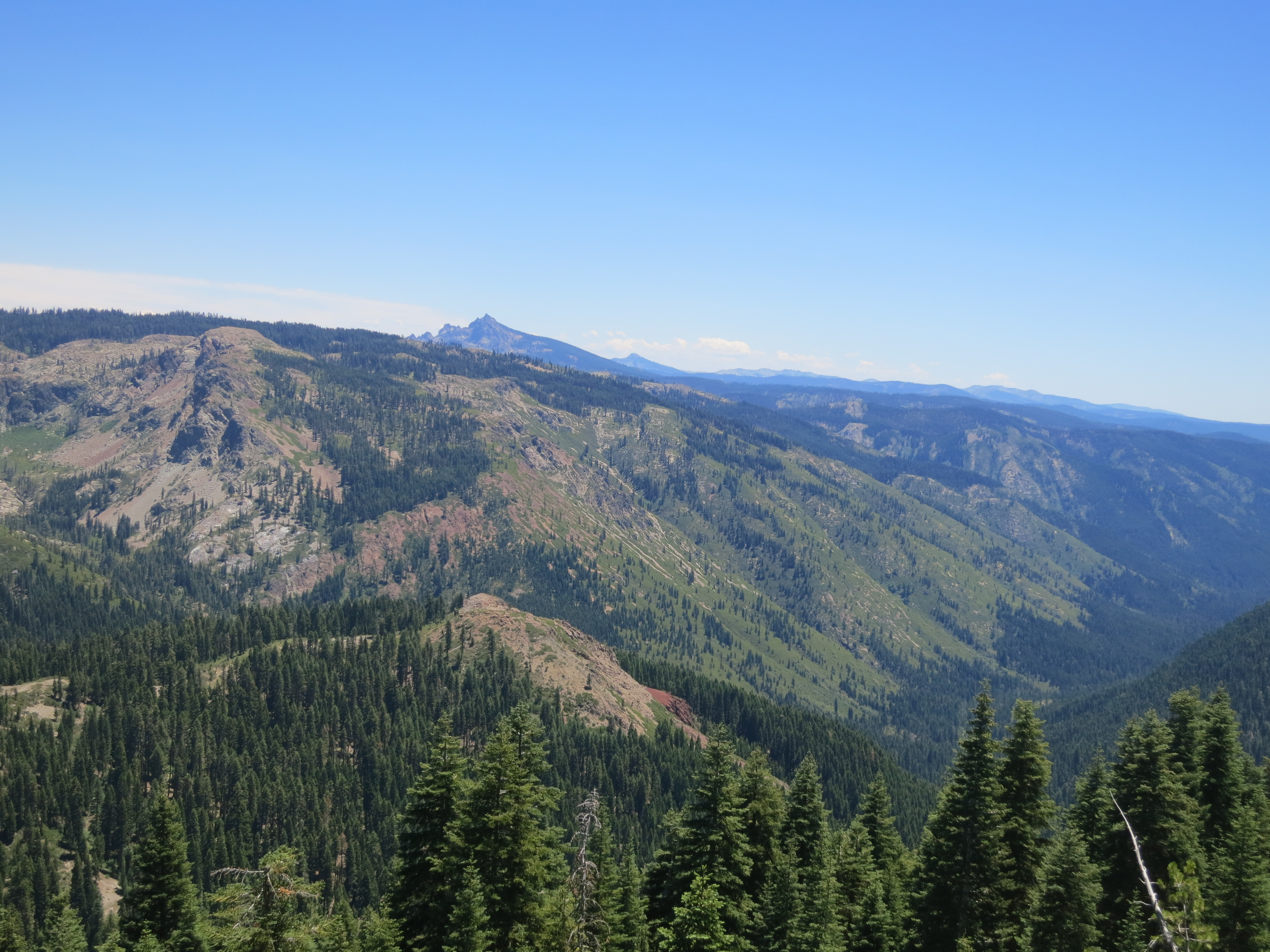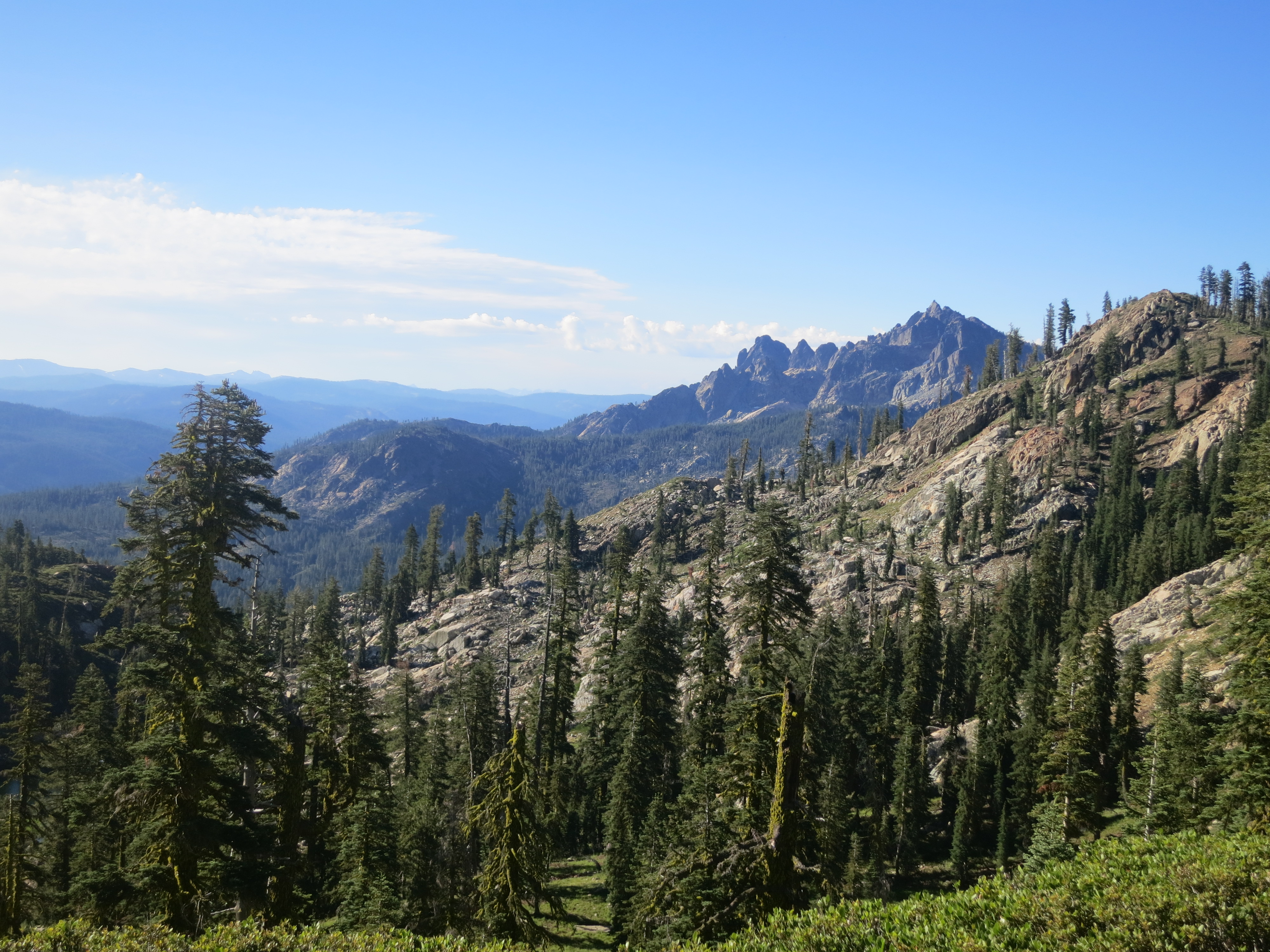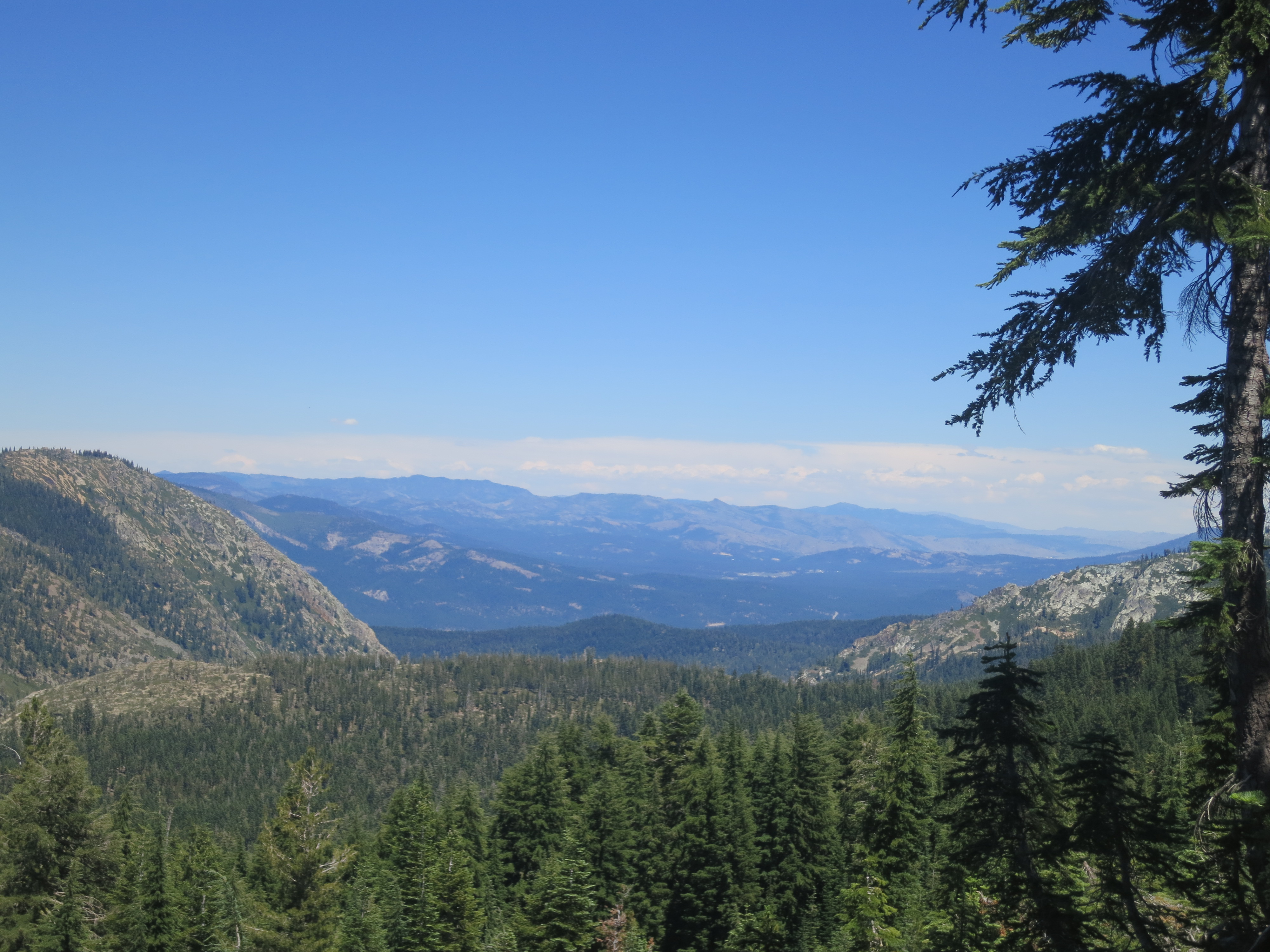 The views were beautiful in the morning. Blue lakes shimmered in the distance and the trail was lined with evergreens. I had a nice view for my first break of the day!