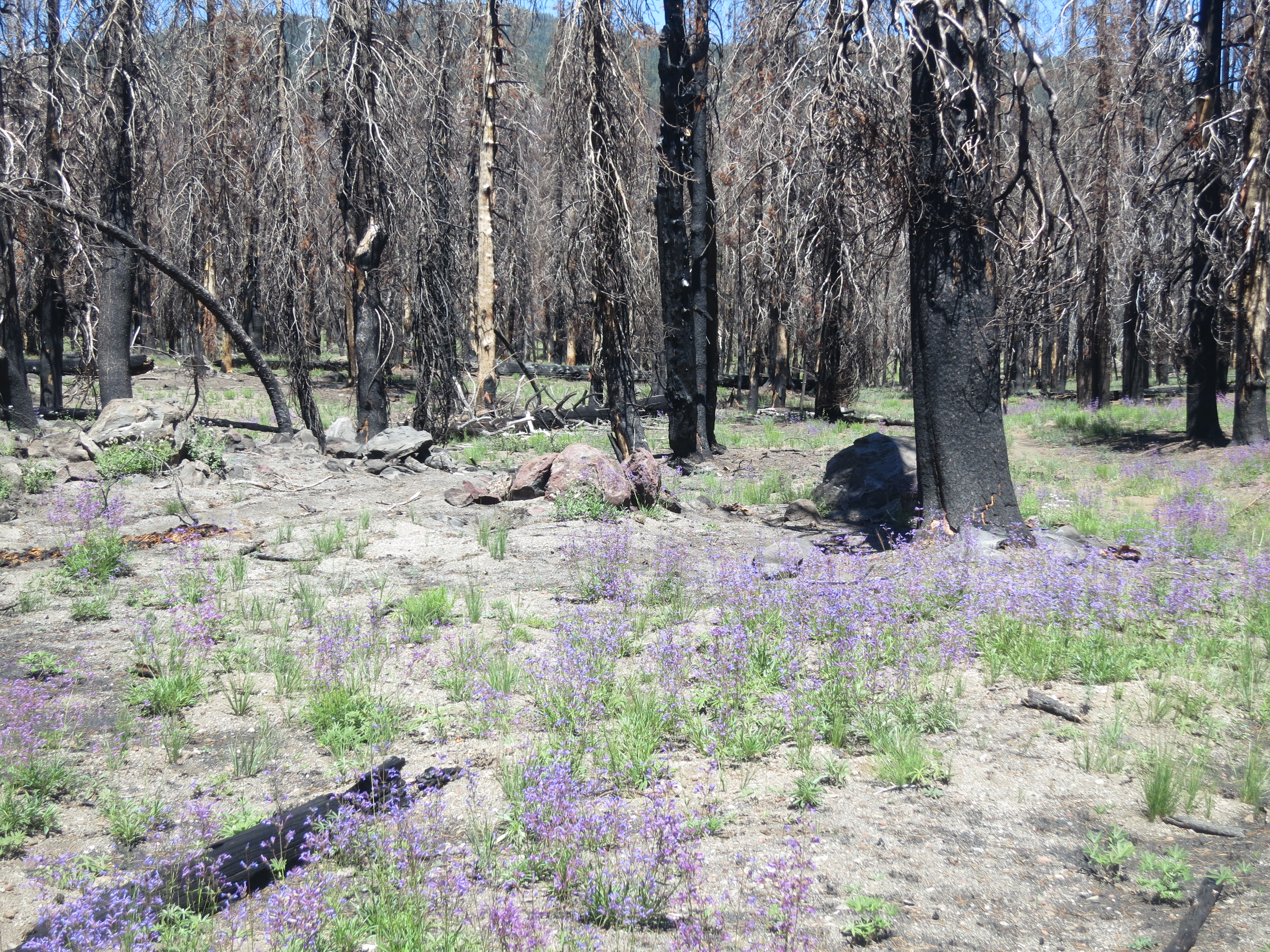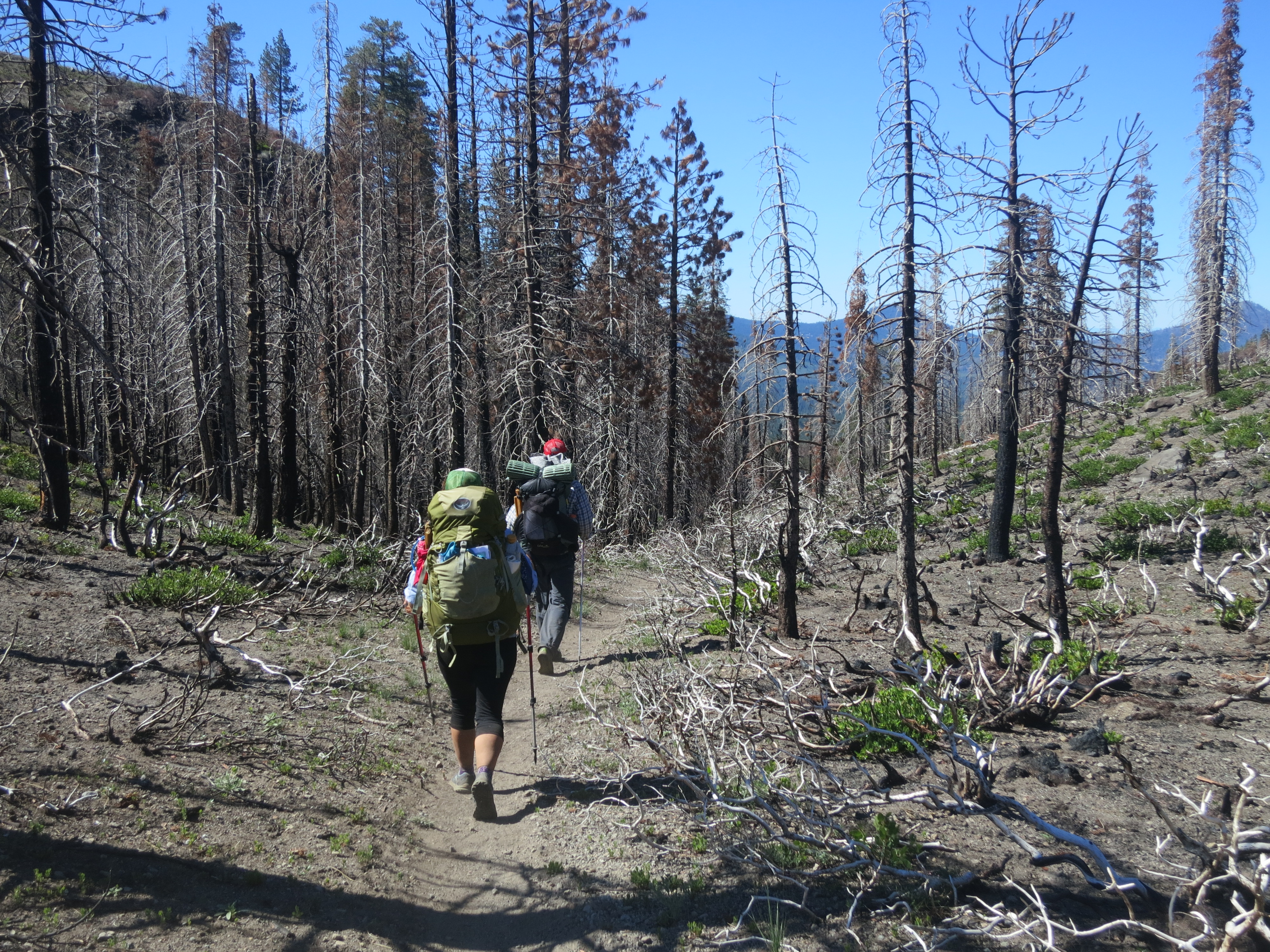 When I came to a lake, I looked around but didn’t see anyone. I figured that he meant the one labeled on our app, which was still up ahead. I kept going and was happy to find him at the second one. He had already put his feet in the water and was thinking about going for a swim, but decided not to. We sat on a fallen tree and snacked while a tame, curious deer came to check us out. Never feeling like we have time to relax, we packed up and headed out. Fun Size was hoping to get to Old Station where there was a campground and small store and restaurant. He asked me if I wanted to share a site with him and split the cost. Although I wasn’t planning on the extra side trip off trail and preferred to camp for free, I agreed. It was really nice to have some friendly company. We found ourselves back in yet another burn section, and as the miles continued on, Fun Size began to tire and wonder if hiking over 30 miles was too much for the day. By now, since we were making good time, and because we needed to set ourselves up for the hot Hat Creek Rim stretch ahead, I wanted to at least make it to Old Station. I tried offering Fun Size some caffeinated treats and encouragement to help him along.