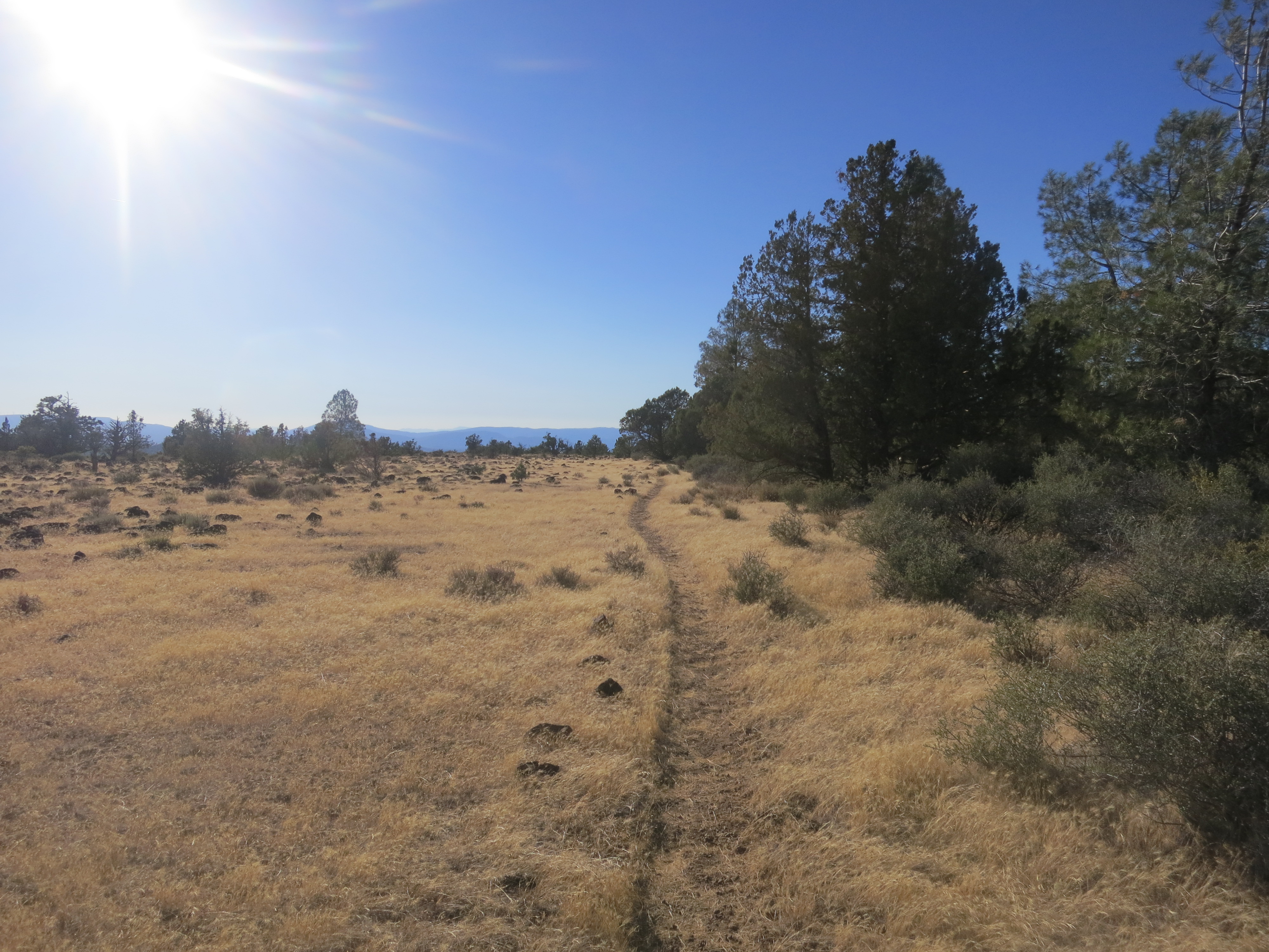 The woman returned to her car, and after learning what I was doing out here, asked me if I wanted a cold soda. I told her, “No, thank you” because I don’t like how soda makes my stomach feel. She understood that Pepsi wasn’t the best thing for me, but it was the only cold drink she had. A few minutes later, a truck pulled in and two men got out to use the restrooms. One of them chatted with me and couldn’t believe I was out here alone, hiking 2,700 miles. He couldn’t wait to tell his friend! Before they left, they asked me if I wanted some fruit and my eyes lit up! That was the best gift of all to a thru-hiker! One of the guys came back with several apples and a bag of grapes. I told him I couldn’t carry all of that and just took a few of the grapes. That was more than enough to make me happy. They wanted to know where the trail was and I pointed to the line of dirt going north. “See that dirt path? That’s where I’m going.” They wished me luck and headed on to their vacation week of fishing and drinking. I packed up and headed out to the strip of dirt that wound its way across the rim. I discovered that I had reception at one point, and stopped to send out a message on facebook about having reached the halfway point of the trail. Then, I headed on. The day was growing warmer and warmer.