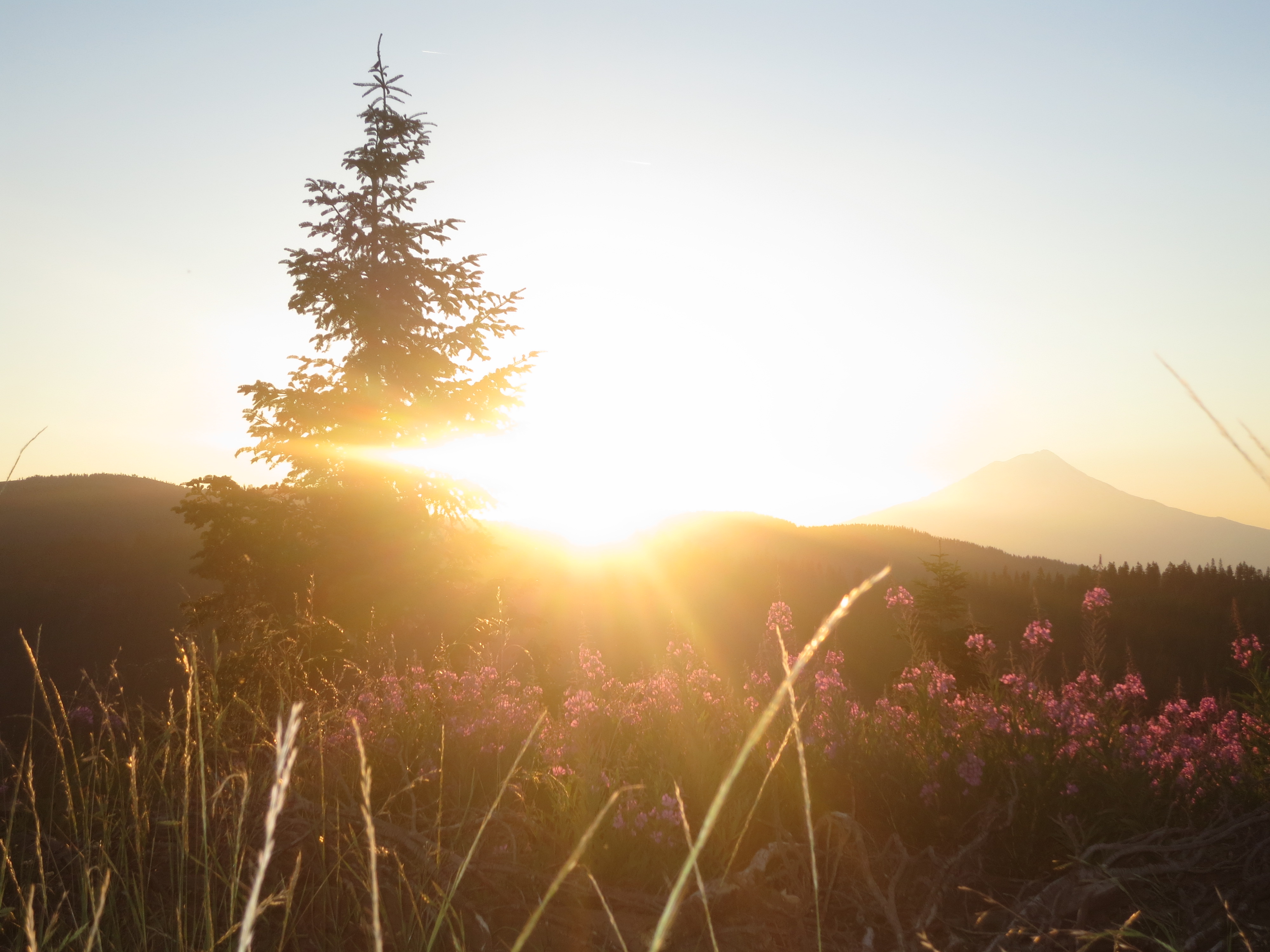 At 7:38, I saw a flat camping spot along a bend in the trail with pretty pink flowers nearby and an open view. I had planned on getting further and there was still enough sunlight to continue walking. I hesitated and then decided to make a compromise with myself, as the site looked too good to pass up. I would just have to get up early the next morning to make up for the distance I had lost by stopping early tonight! I spread out my groundcloth and sleeping bag and then boiled water for dinner, taking pictures of the setting sun, and washing the dirt off my legs, as I waited.