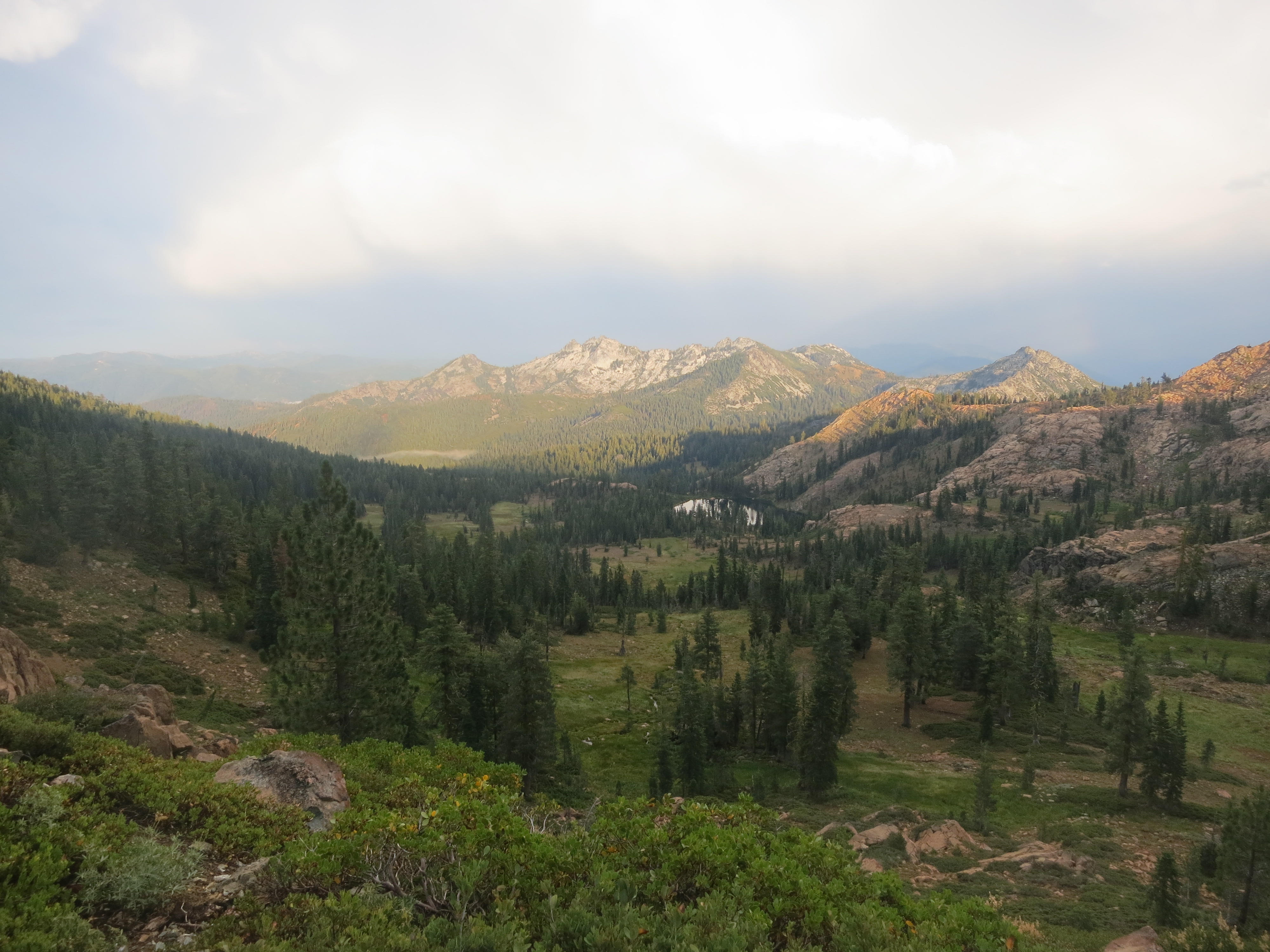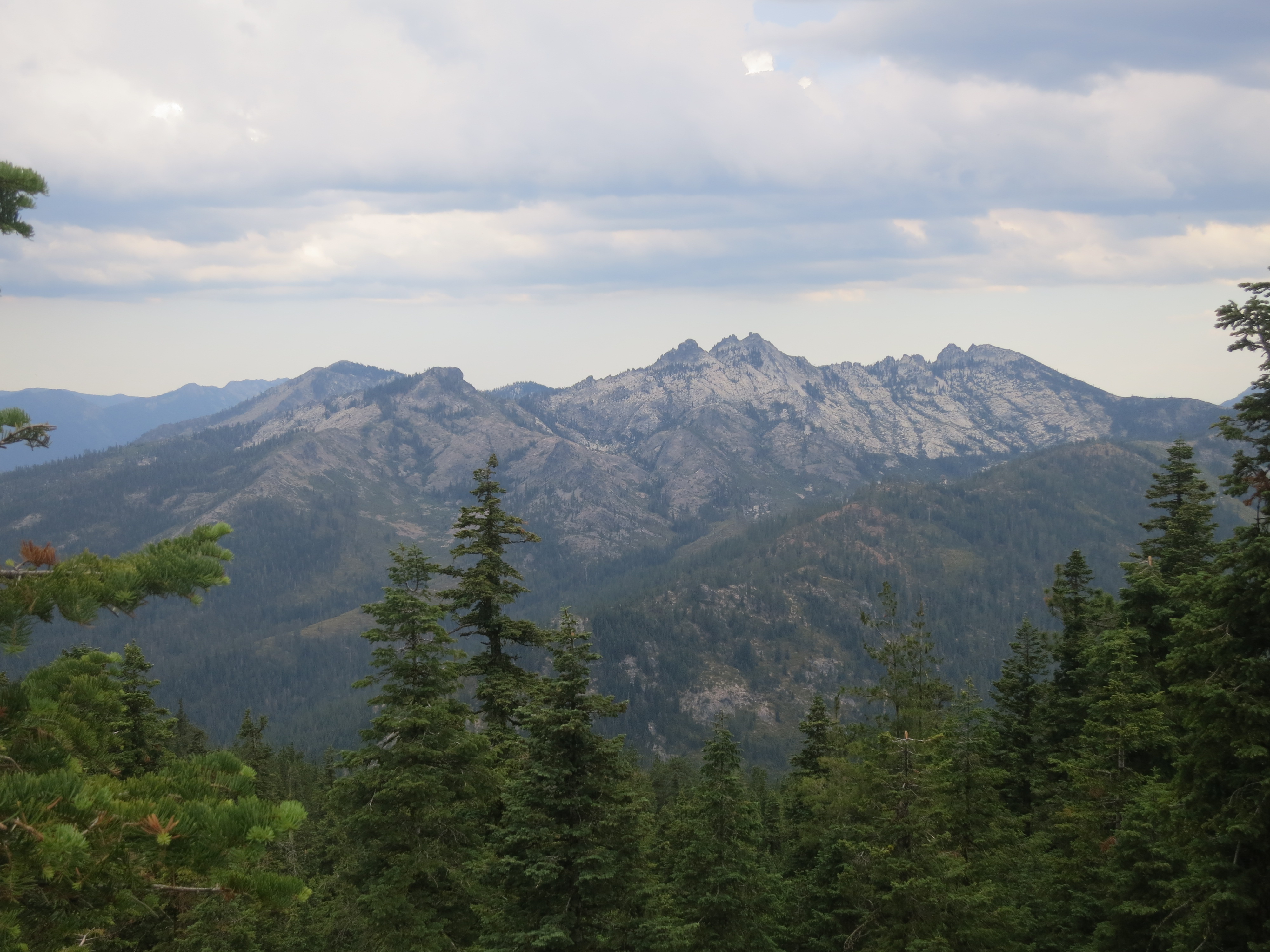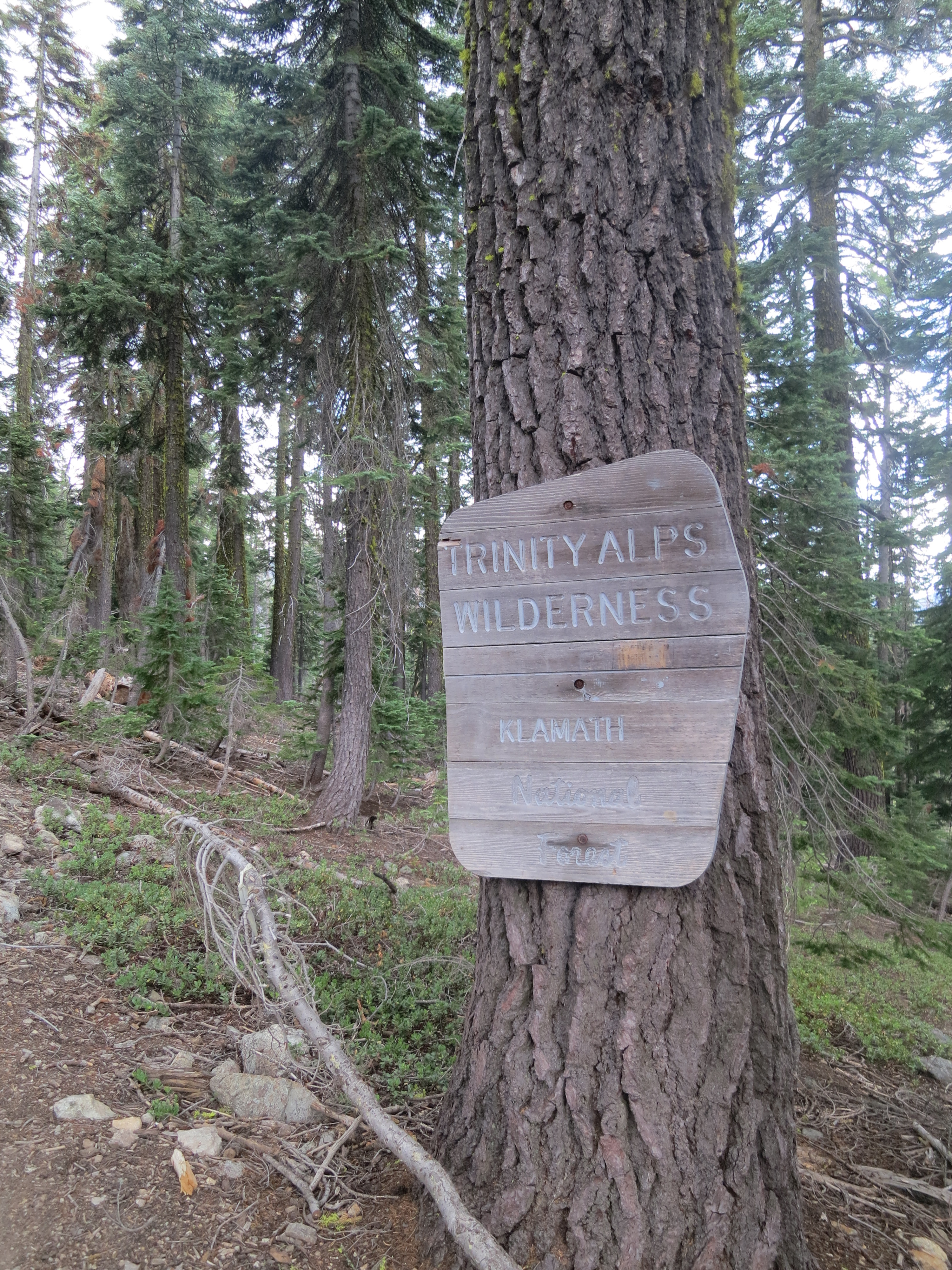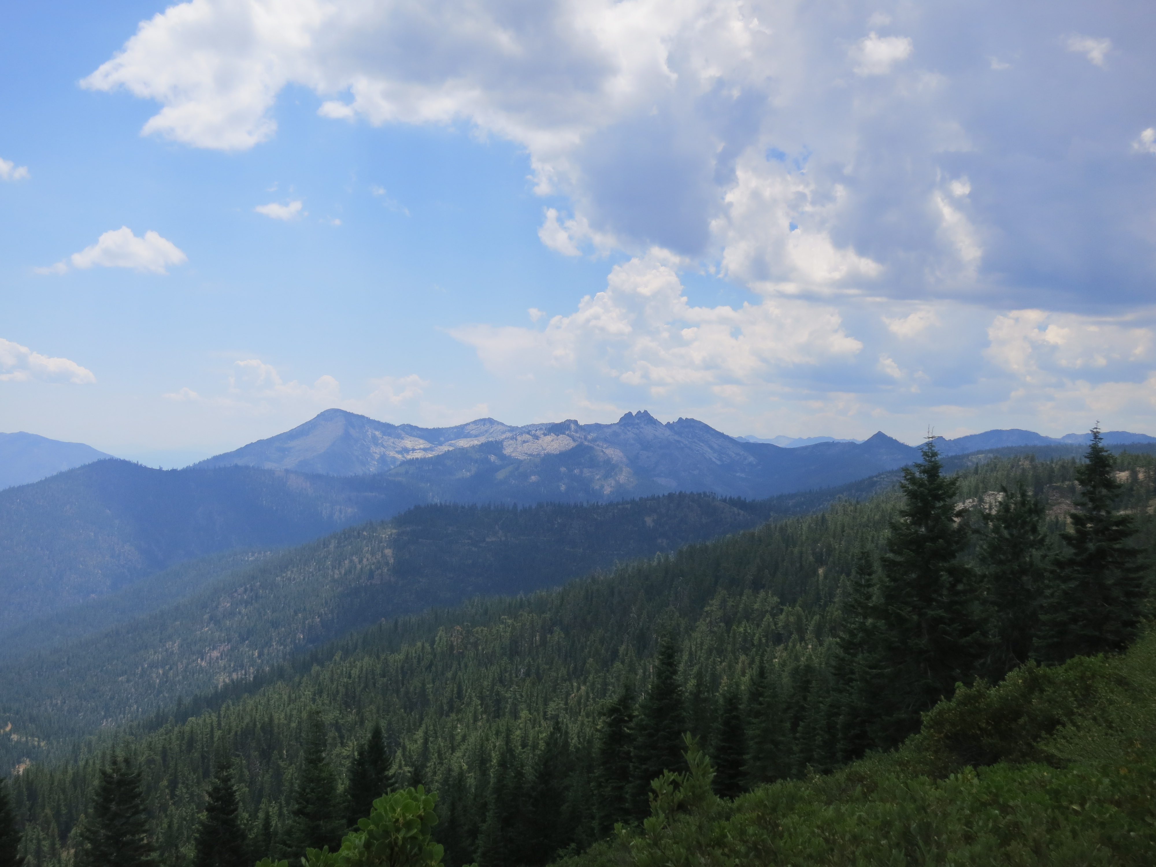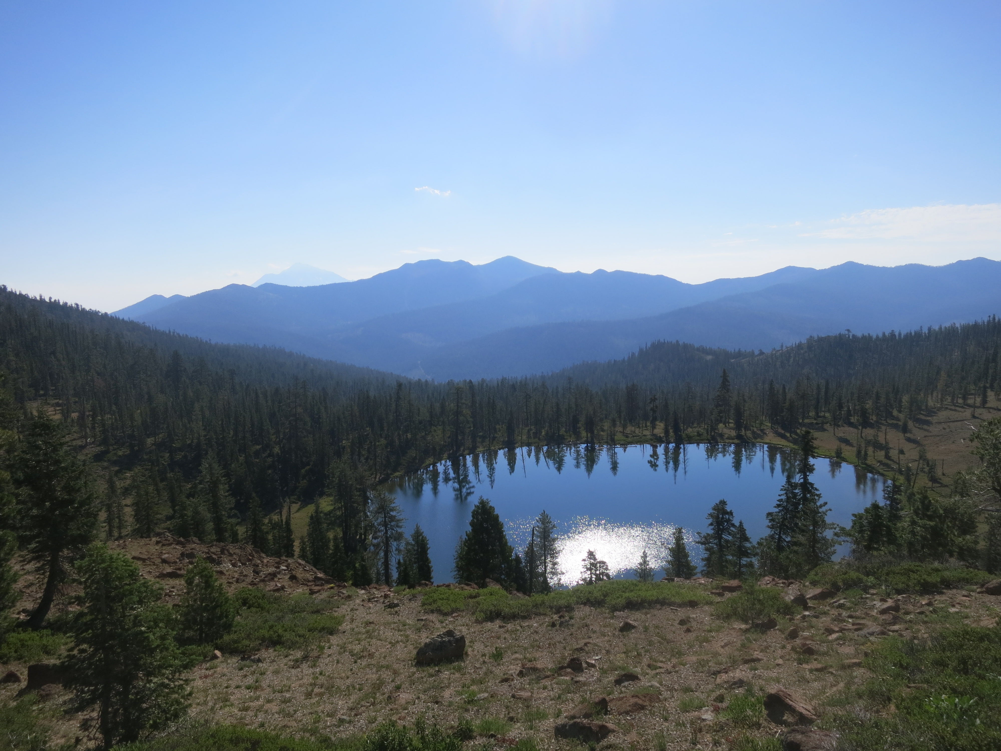 Minutes later, I heard the sound of thunder. Raindrops had fallen while we were sitting around Kermit’s campsite and I almost thought we were going to have to huddle in their RV, but then it seemed to have passed. Now, the wind was picking up. I stopped to seal my phone and camera in a ziplock bag. When I emerged out of the woods and could see Mt. Shasta in the distance, it was covered in dark clouds. I could see the rain falling and hoped it wouldn’t move this way.