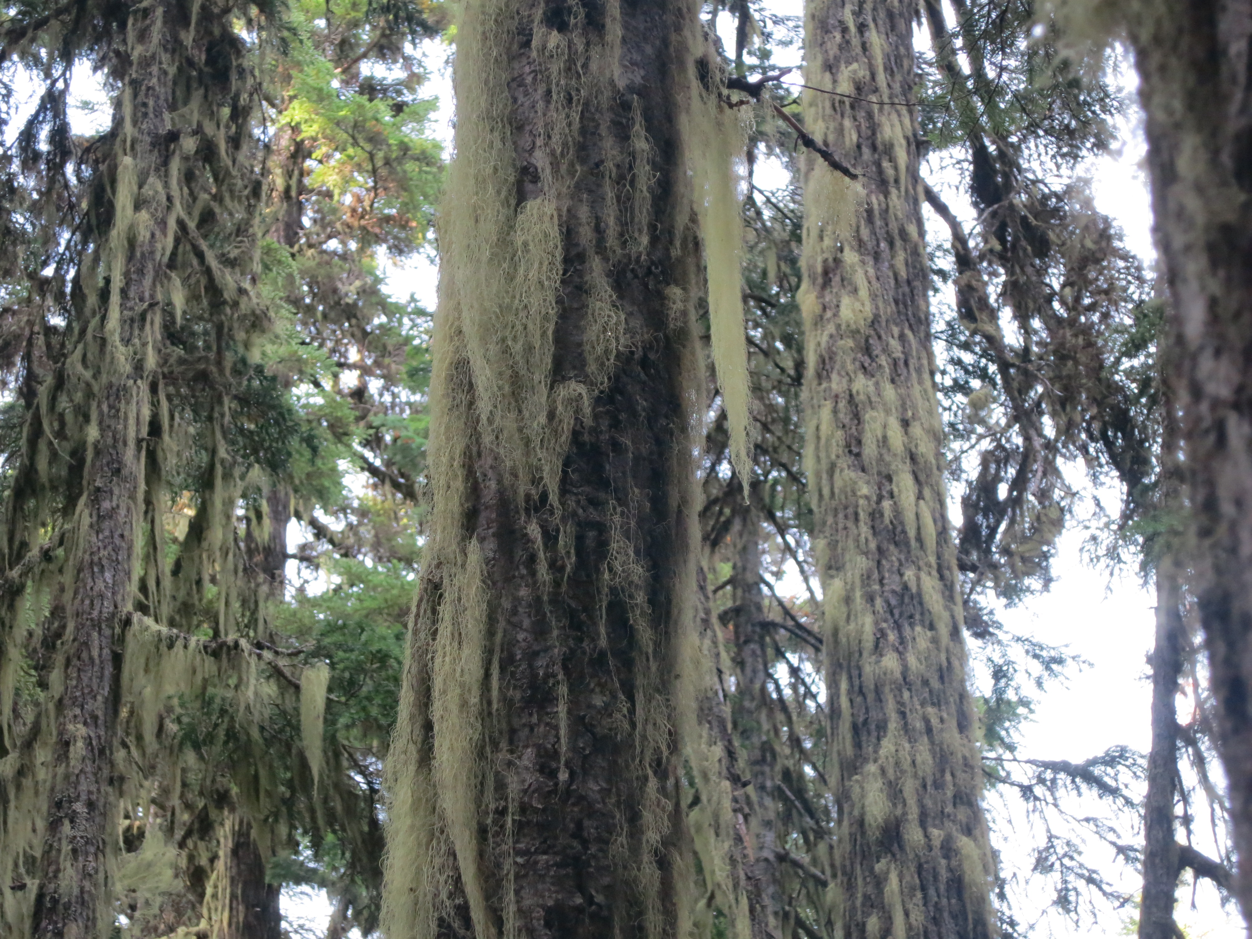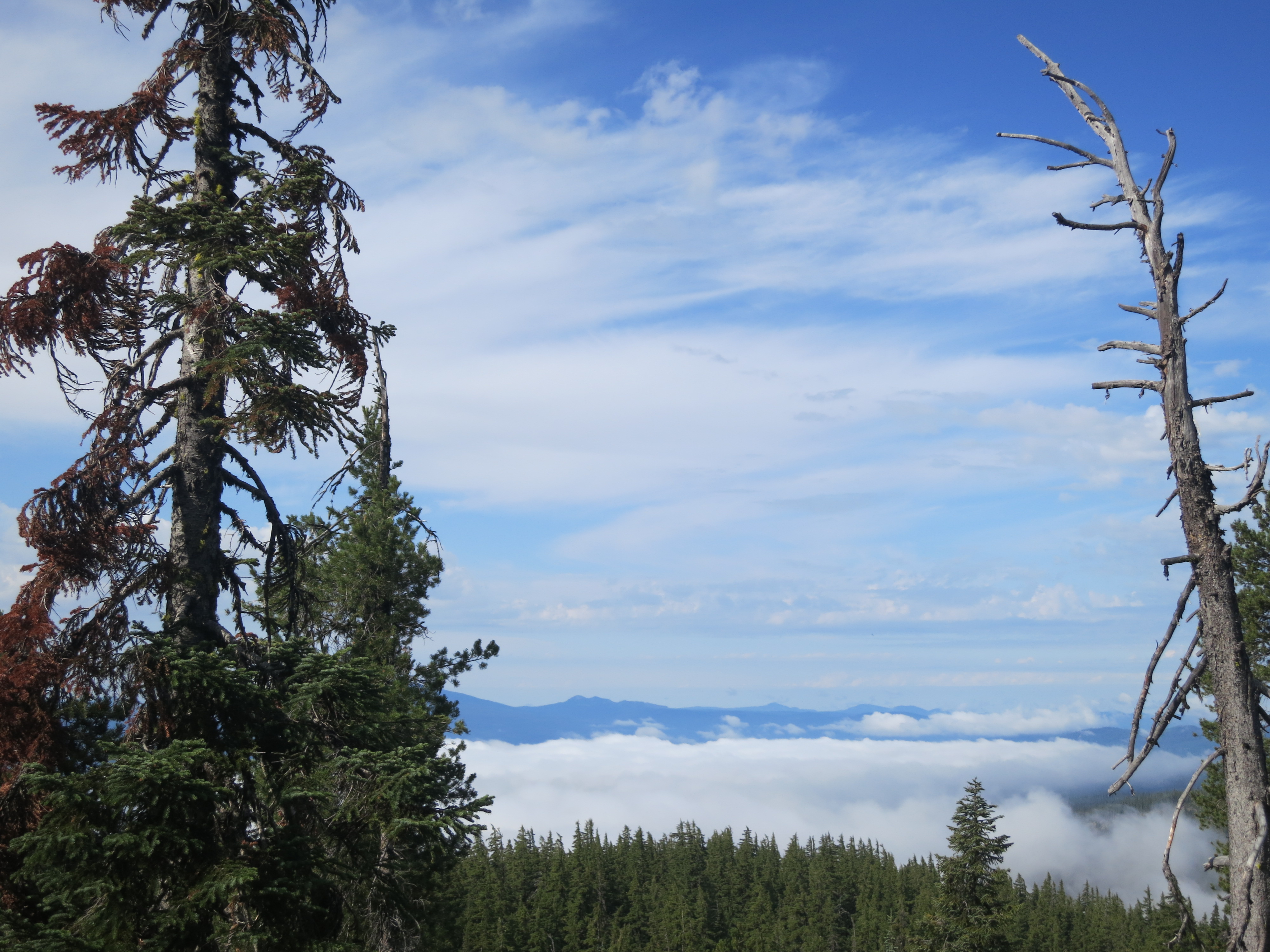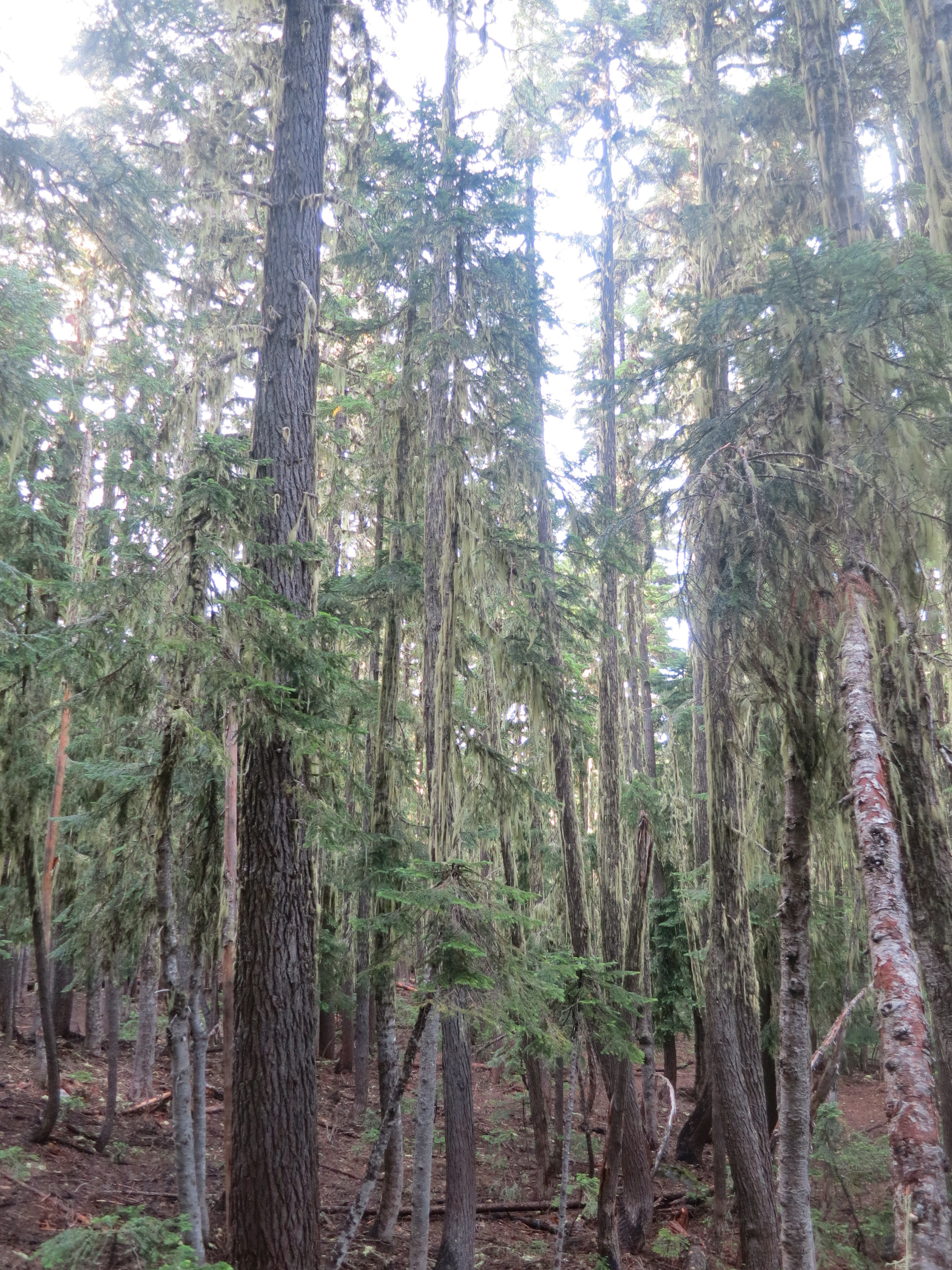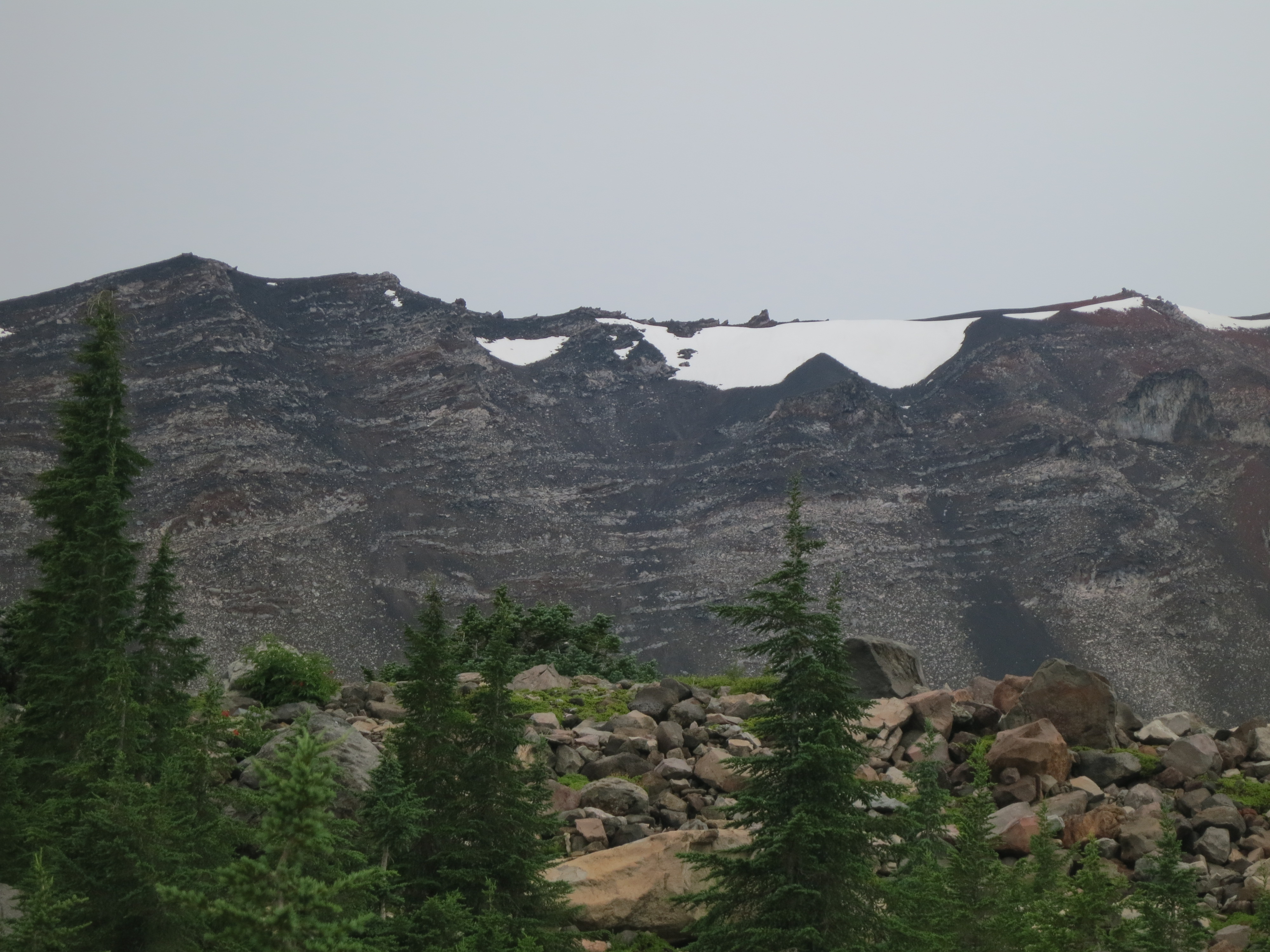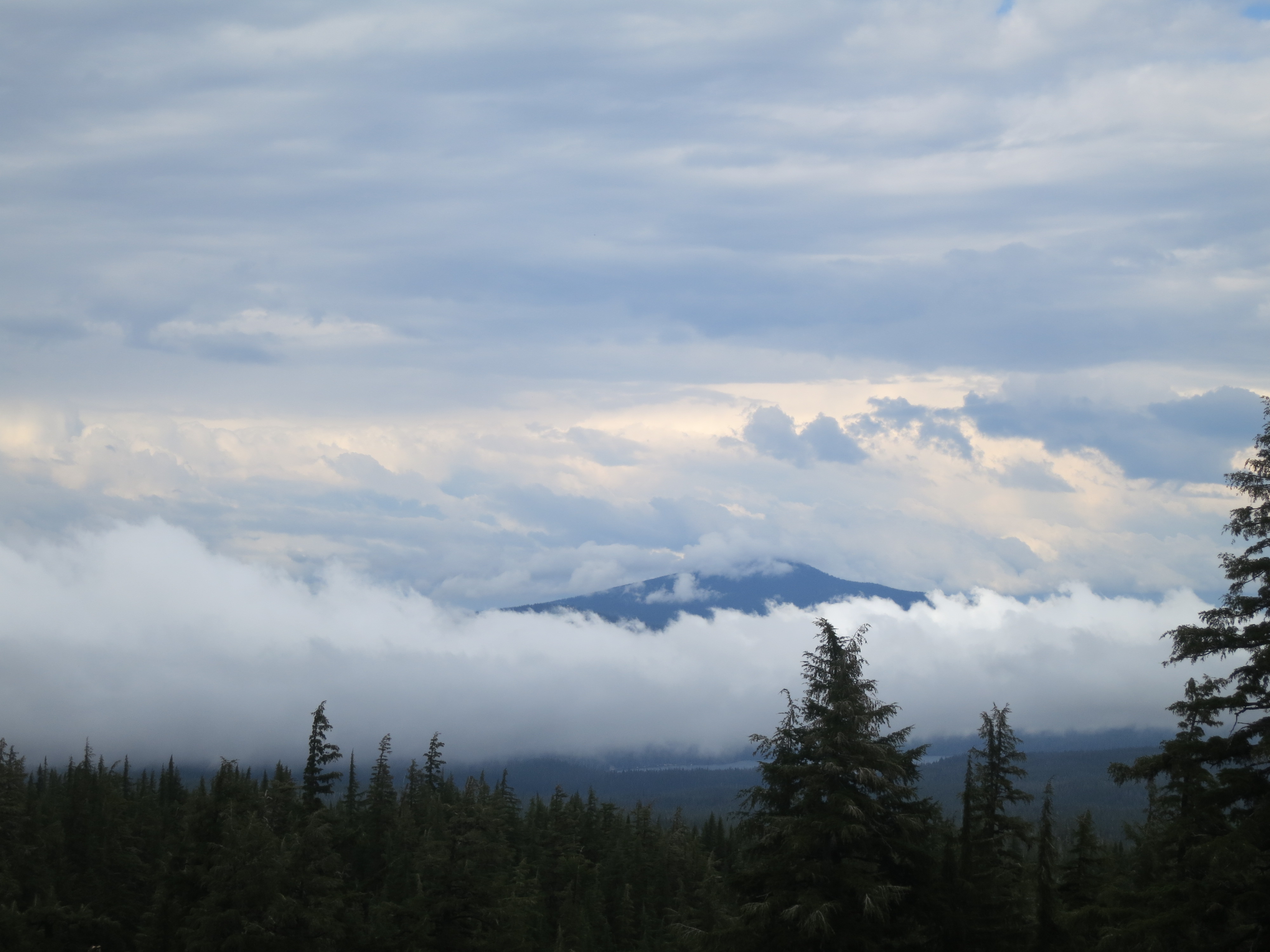 After the hail turned back to rain, I saw a man head towards me. It looked liked he had the moss that I had seen on the trees hanging from the top of his head. When I got closer, I realized it was just his hair. He said he was out playing on Diamond Peak and seemed to be in high spirits despite the weather, unlike me. He said that one day, he would also like to hike the PCT. I pretended that everything was well, making no mention of my intestinal problems, which were quite awful today. I put some of Wildcat’s essential oil into some water and drank that, but it was having no effect. I found a large tree to somewhat shelter me from the rain as I sat down to snack. Then, I continued to climb, reaching the exposed part of the trail. I hoped the storm was not following me!