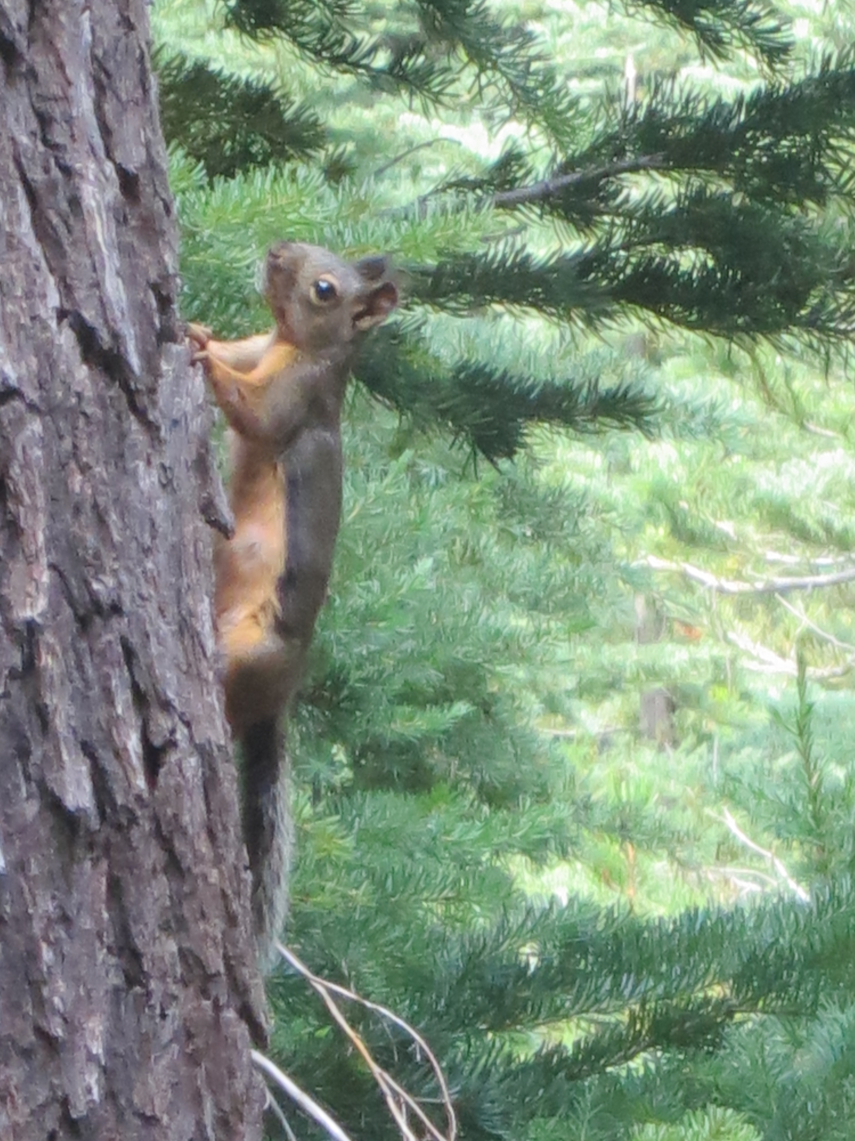 I headed on, feeling worse and worse. This was a bad intestinal day! As I approached the next lake, I heard a woman calling for her dog. When she saw me, she asked if I had seen him. I had not. She was very surprised to hear what I was doing out here and especially that I was doing it alone. We talked about my illness and she sympathized, as her daughter had picked up something similar during her world travels and still struggled with it years later. She asked me to keep a lookout for her dog, who had chased after some big animal, and asked if I could yell back to her if I saw him. Before we parted, her dog came trotting over to her, now without his pink pack that was holding its dog food! It acted extremely nonchalant, as if nothing had happened and he had never left her side. I left her to the task of searching out his pack and headed on, stopping at the lake to snack and collect more water. I could see her family sitting on the shore of the opposite side of the lake.
