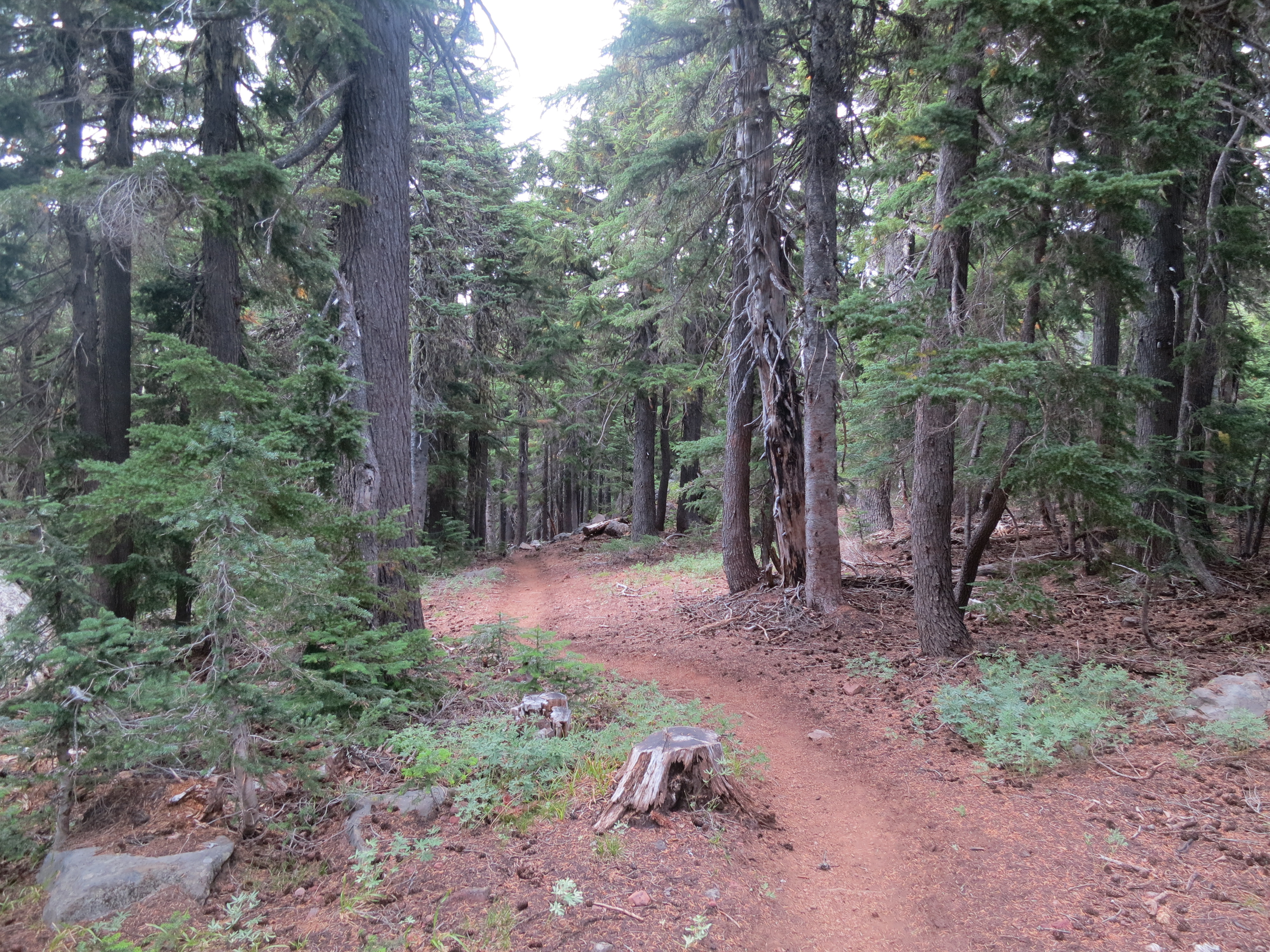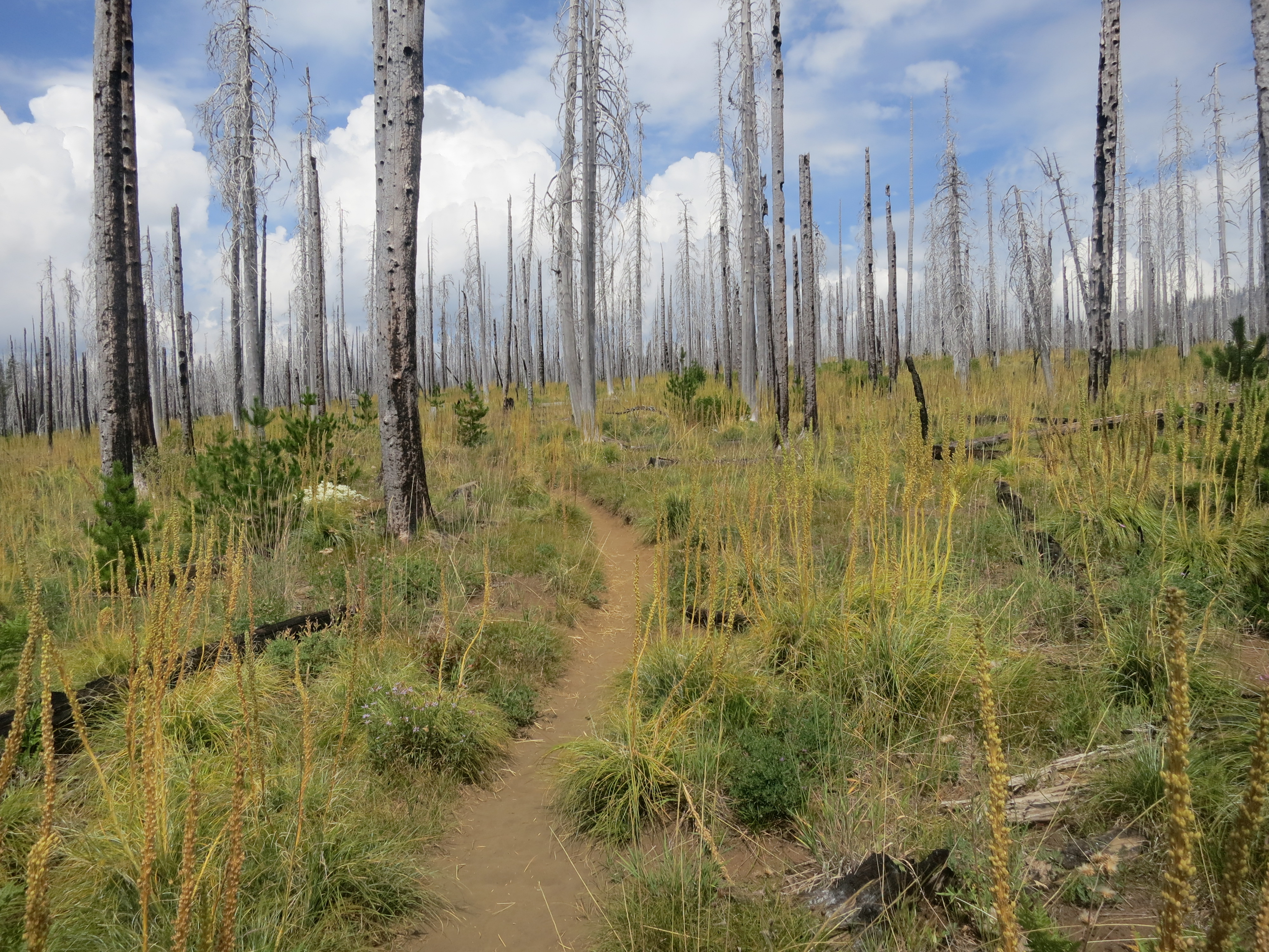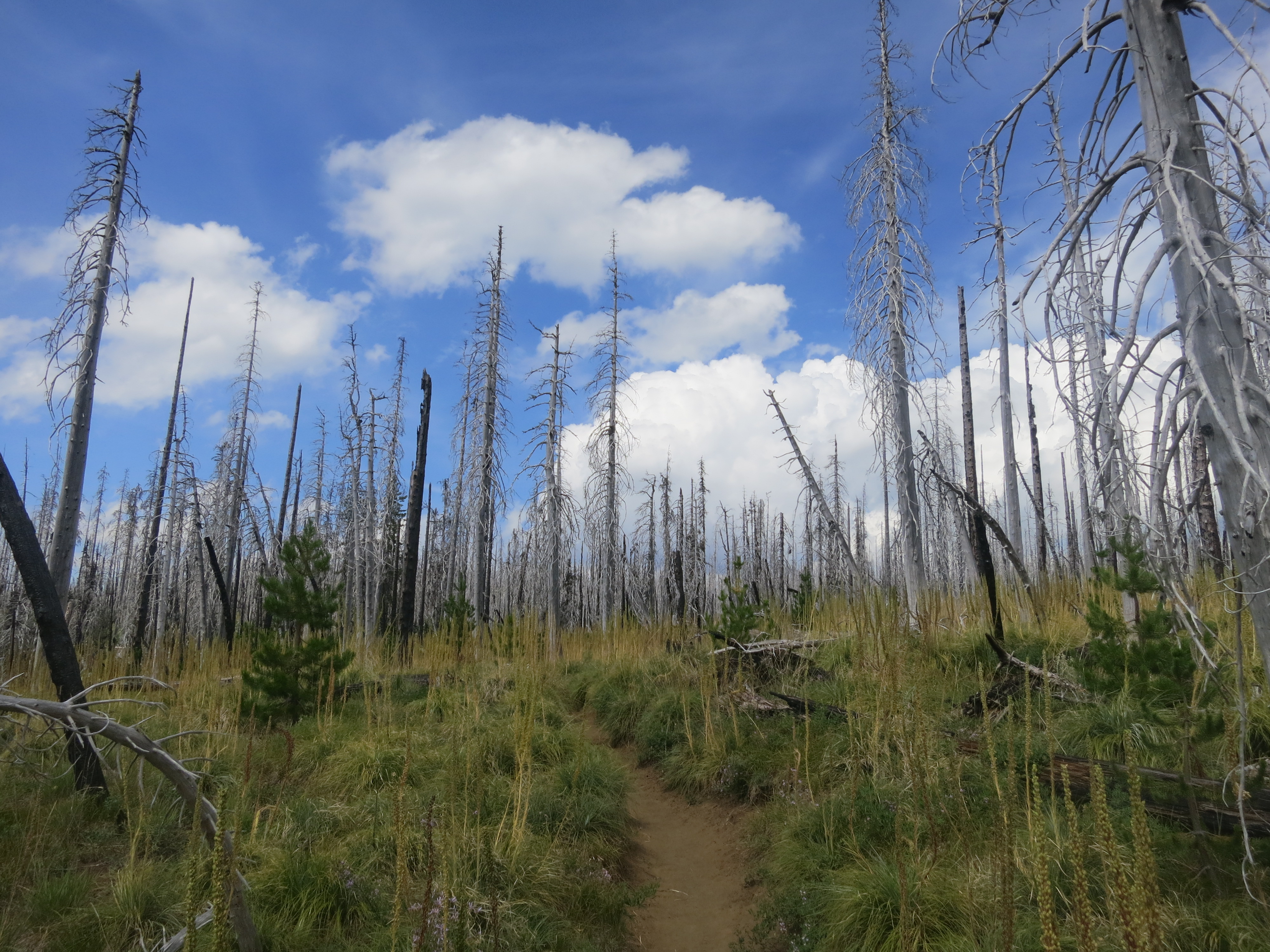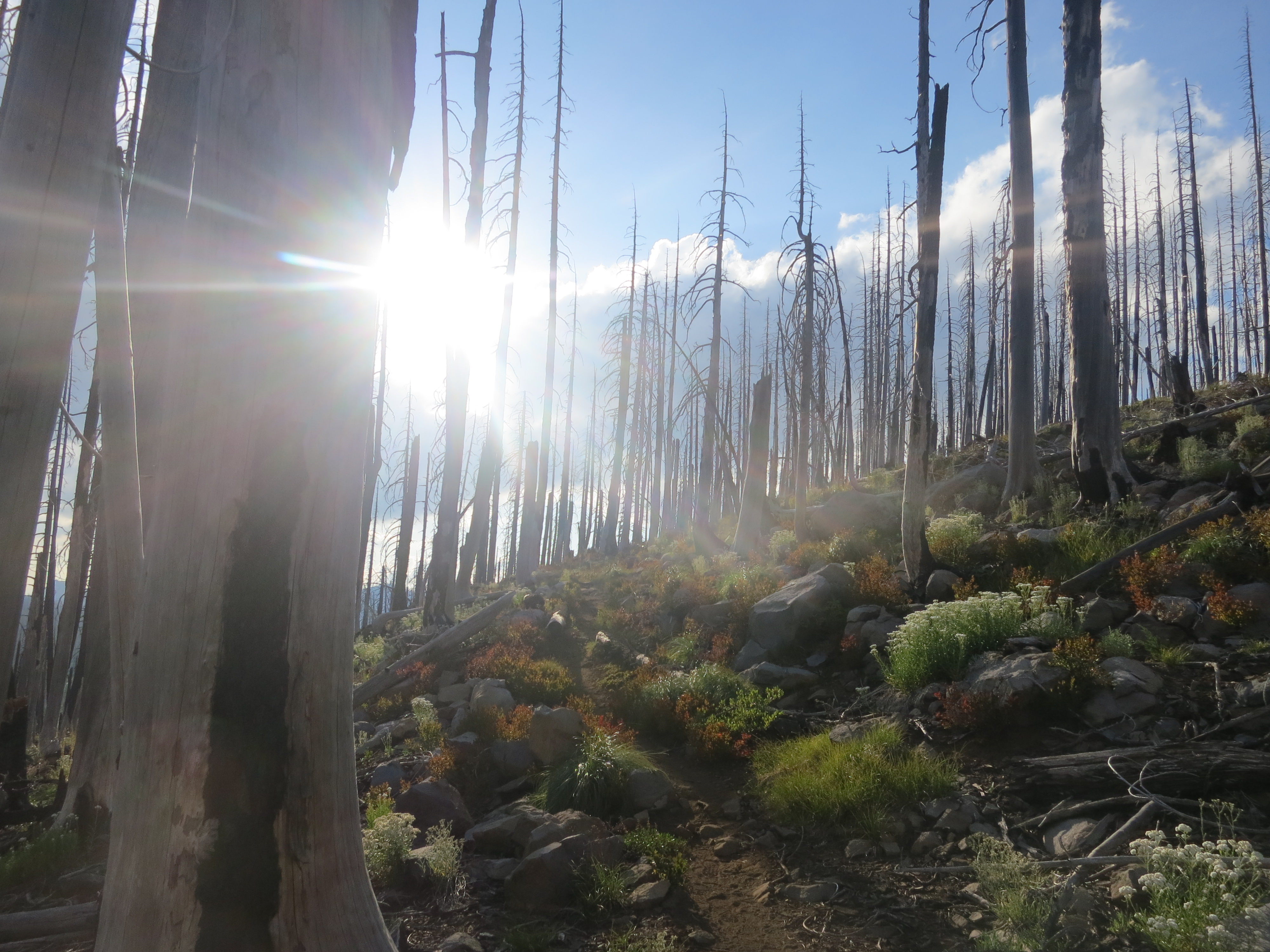 I headed out into the landscape of burned trees and lava rock and started climbing back into forest. Last night, Allyson had pointed out the huckleberries along the trail to me, and I got my first taste of these sweet berries. Now, it was easy for me to spot them and I stopped occasionally to grab and enjoy a few.