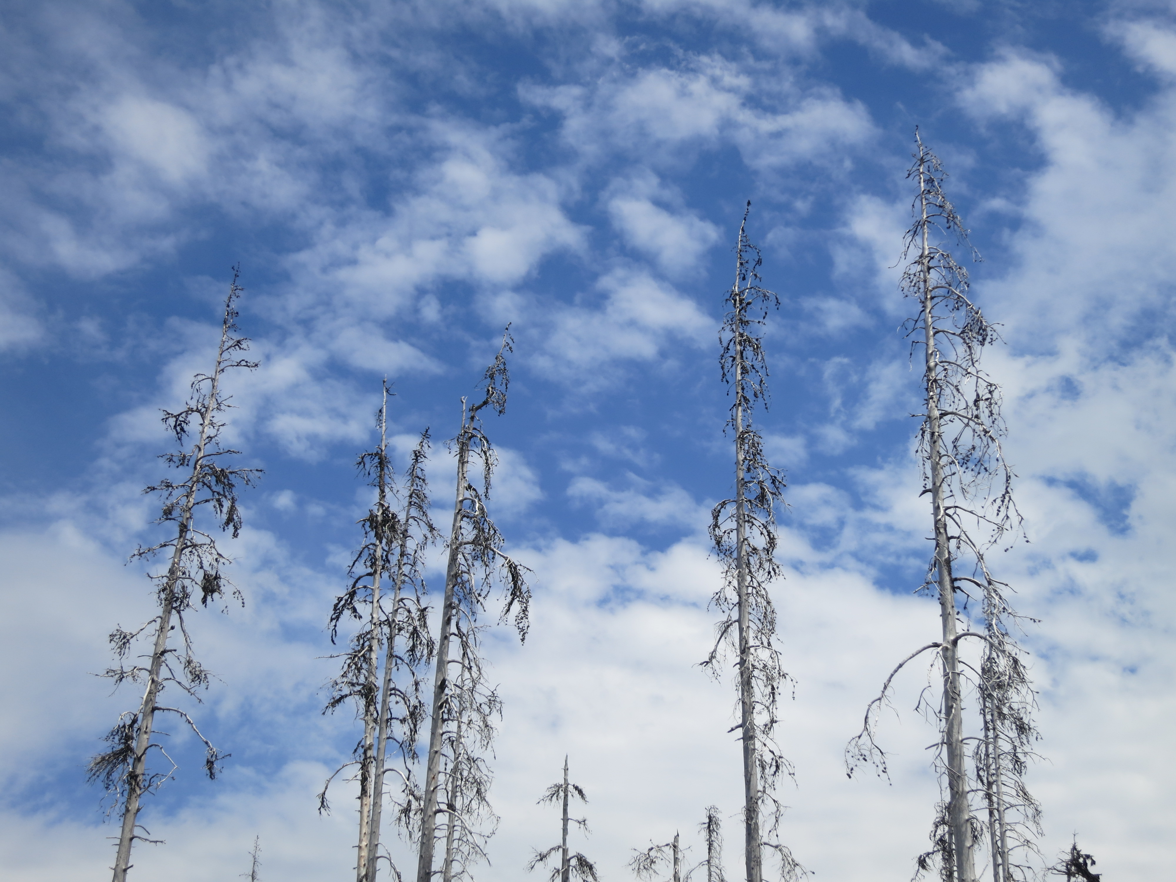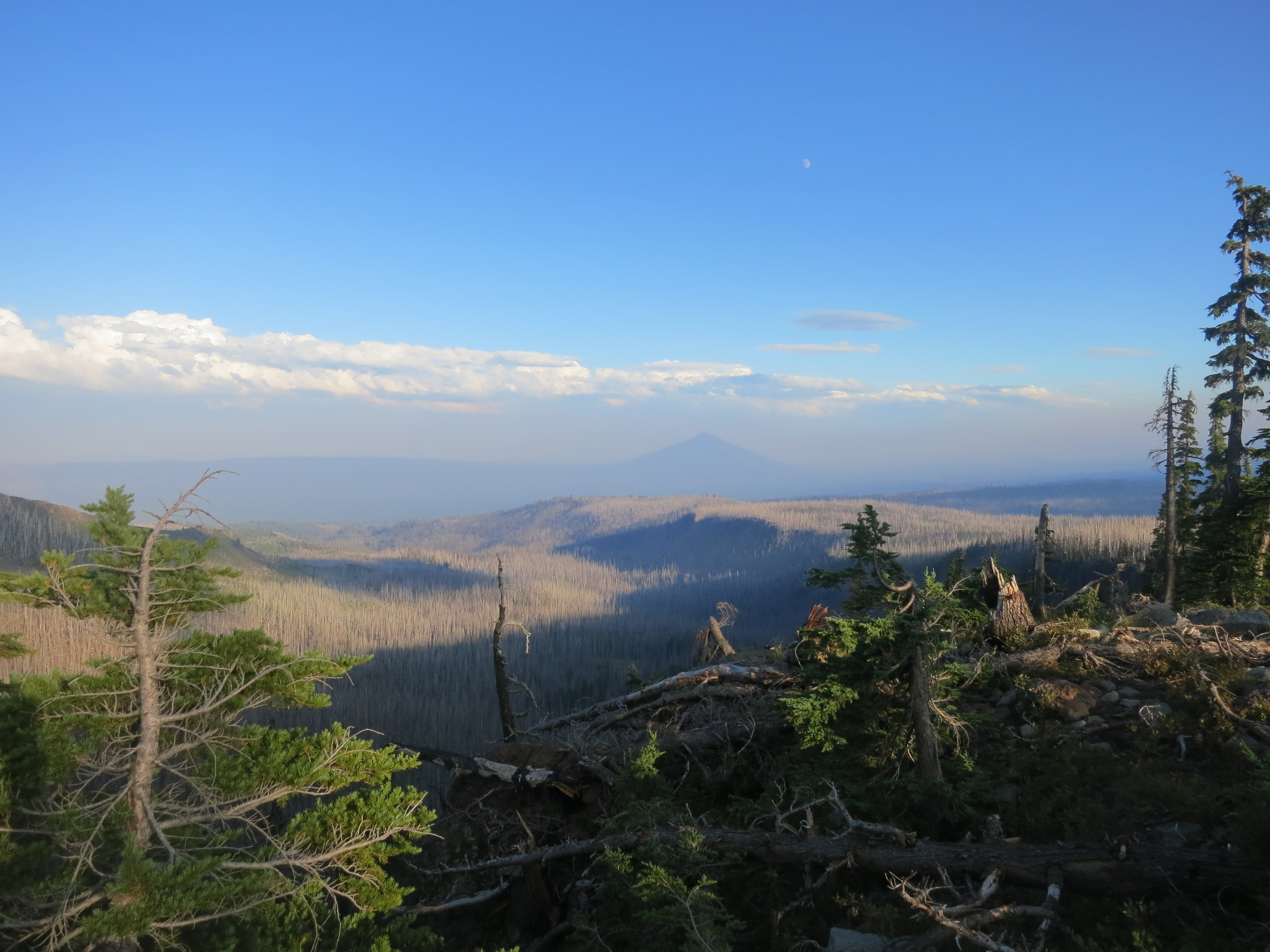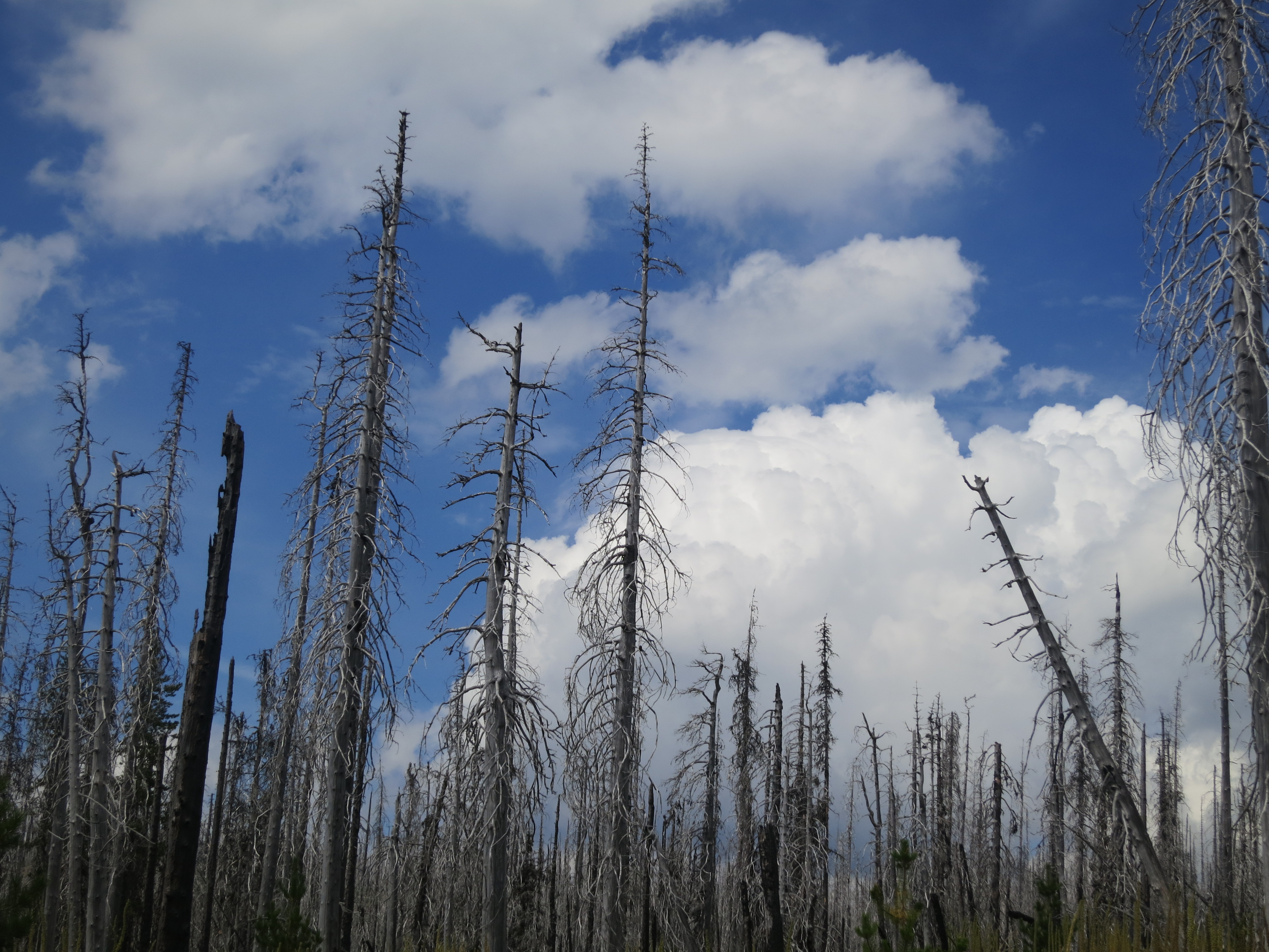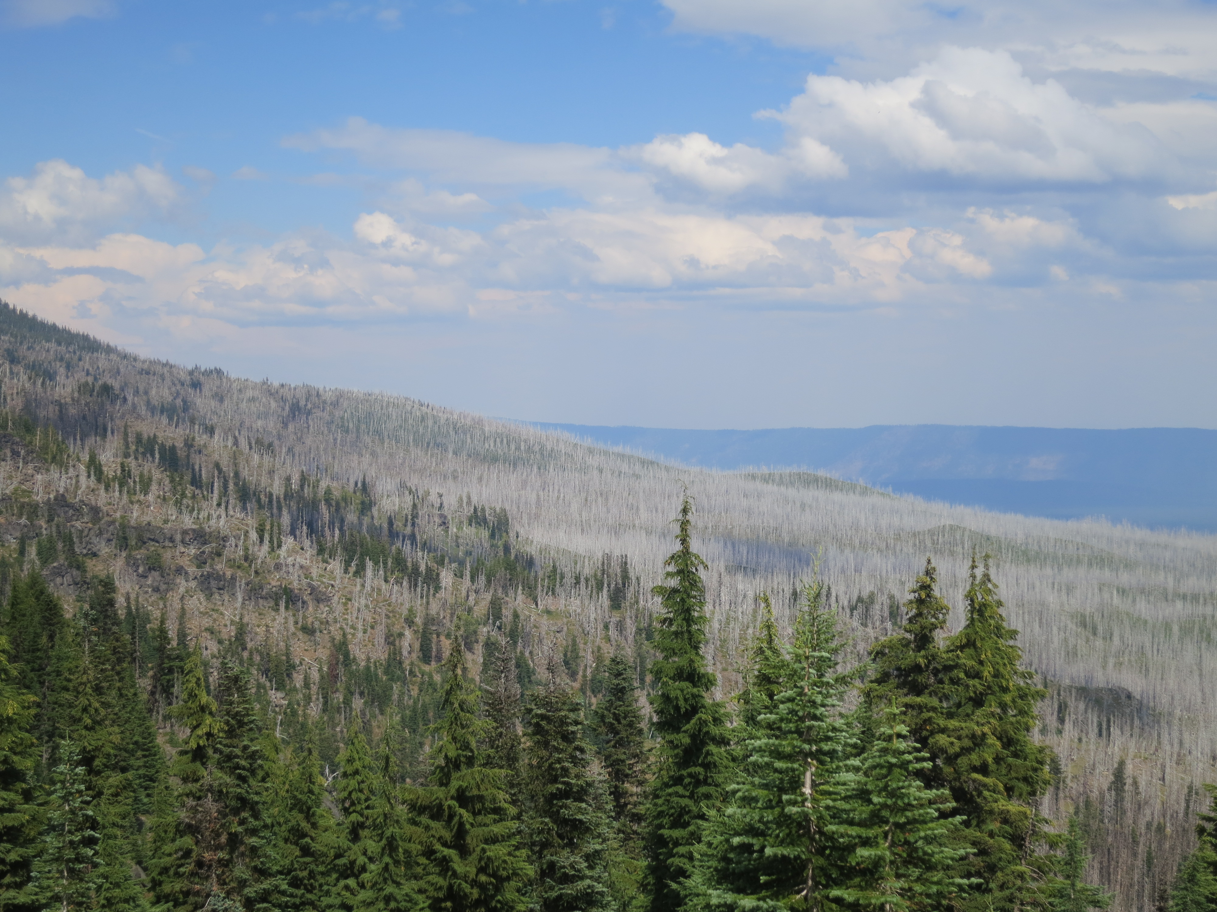 I headed out into the landscape of burned trees and lava rock and started climbing back into forest. Last night, Allyson had pointed out the huckleberries along the trail to me, and I got my first taste of these sweet berries. Now, it was easy for me to spot them and I stopped occasionally to grab and enjoy a few.