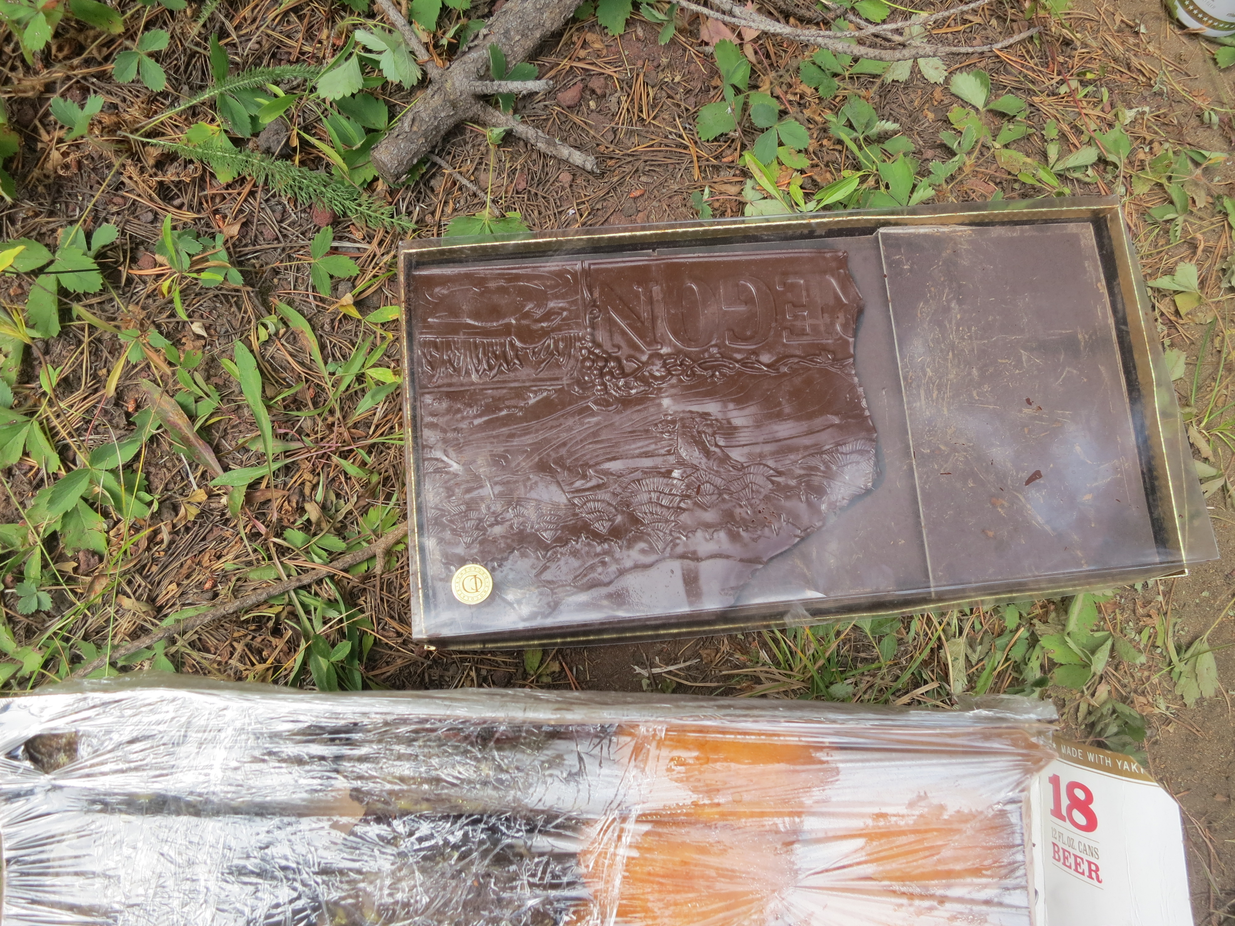 The sun was burning down on me. Before long, I reached a flat stretch and heard the traffic on the highway. Some hikers chose to hitch into Sisters or Bend from this road and I was curious to see what the situation looked like. Before I came out to the pavement, though, I spotted a box of donuts and the biggest chocolate bar I had ever seen in the dirt! I decided I might as well have some! I felt gluttonous, standing there stuffing my face.