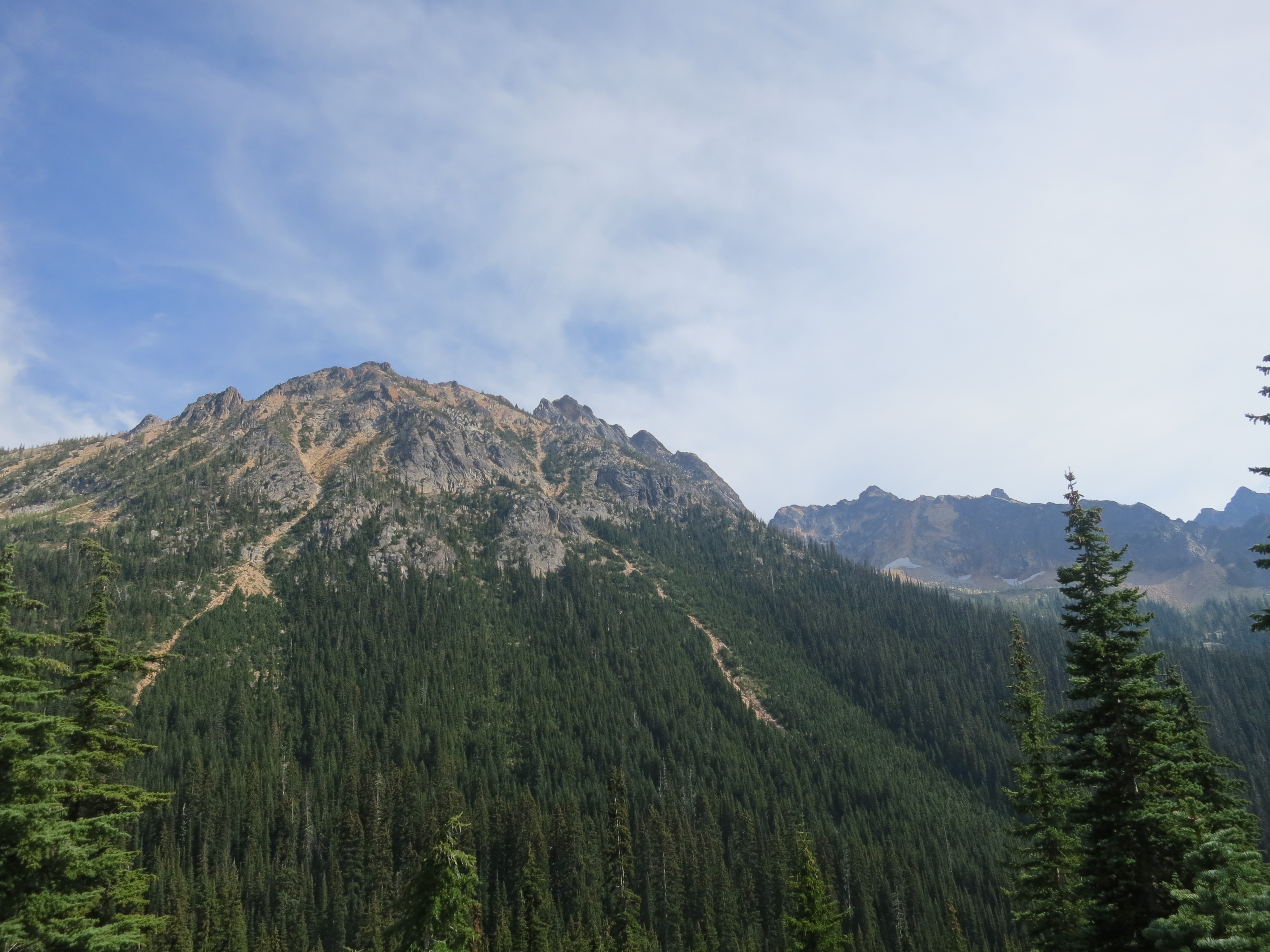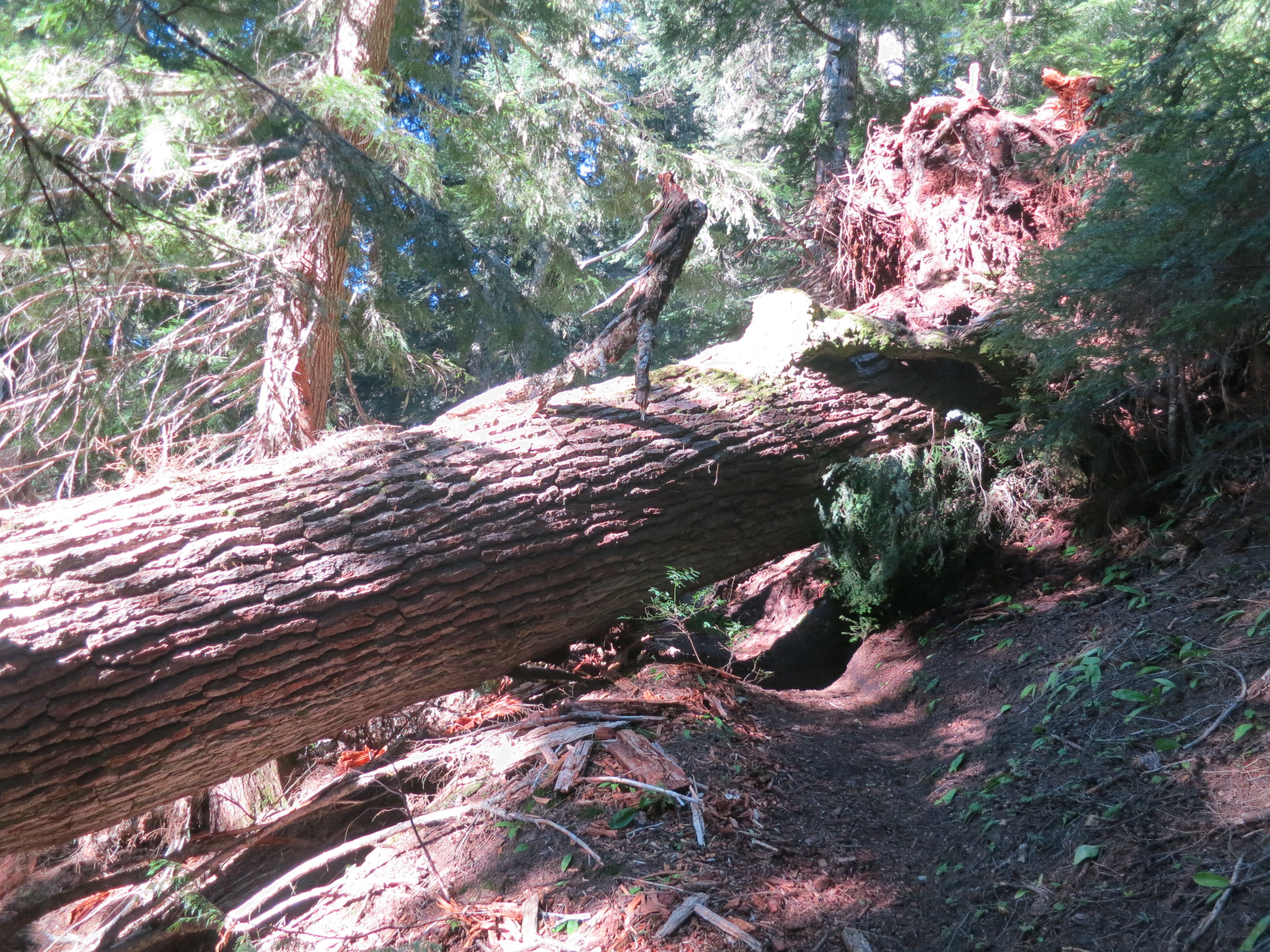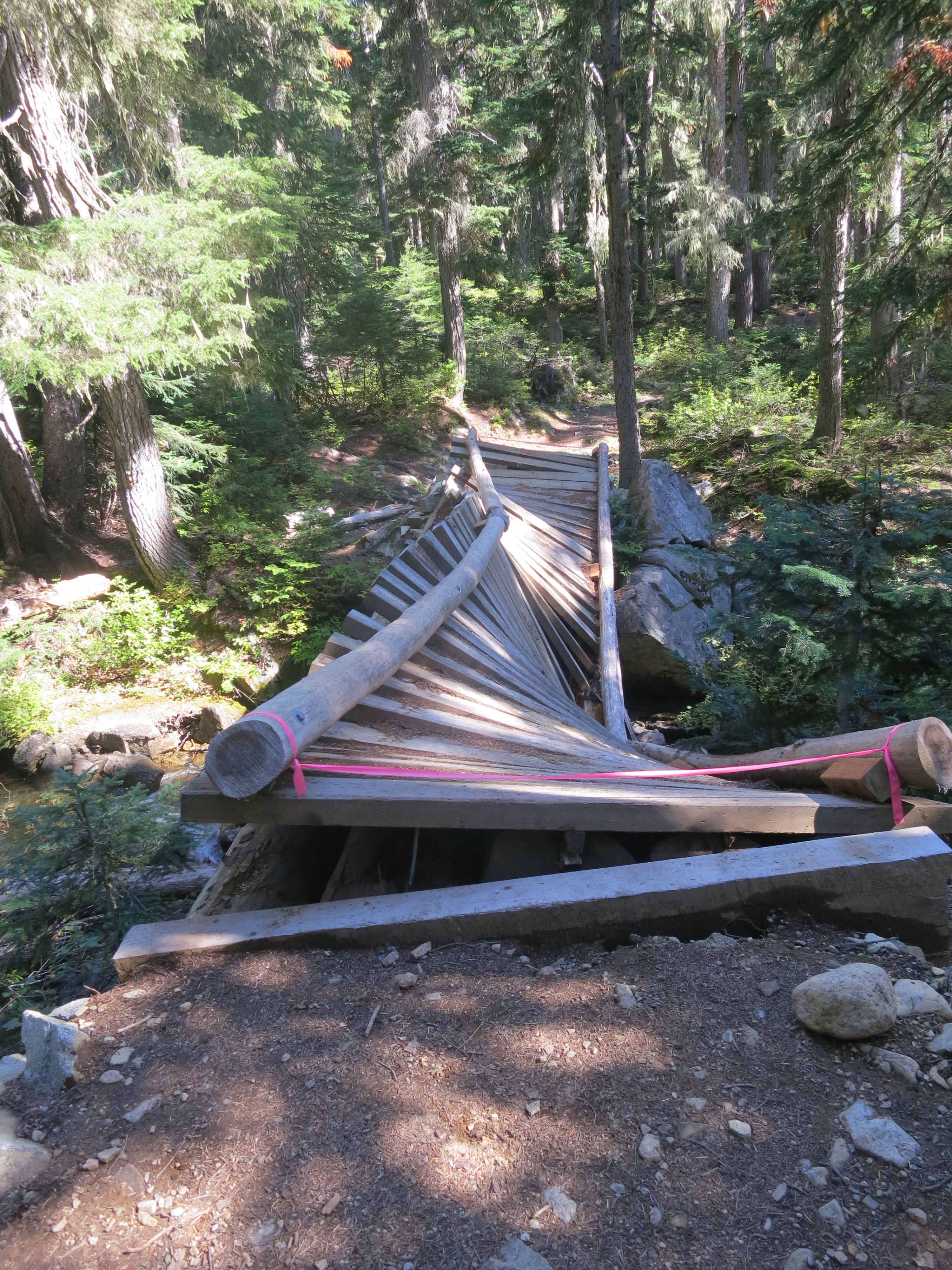 Near the bottom of these switchbacks, on the trail ahead of me, I saw Joat stopped once again. His body was turned towards the mountain and I wondered what he was doing. When I reached the spot he was in after he had moved away, I saw that he had been talking to a person. This guy said hello and asked me how the washouts I had just crossed were. He was wondering if he needed to go back and check them out. When I said they weren’t too bad, he turned around and started following me back. I told him he should go ahead of me. He had no weight on his back and it was easy to see that he could move a lot more quickly than I could. I learned that he was working with the forest service to assess the damage from the wash-outs on the trail and figure out how best to repair them. He informed me that the bigger ones were coming up. There were about 8 trenches of approximately 10-15 feet across and 8-10 feet deep. My eyes got big. I hadn’t yet come to the real wash-outs! Up ahead, I could see Joat stopped again. “Are you stuck?” I asked.