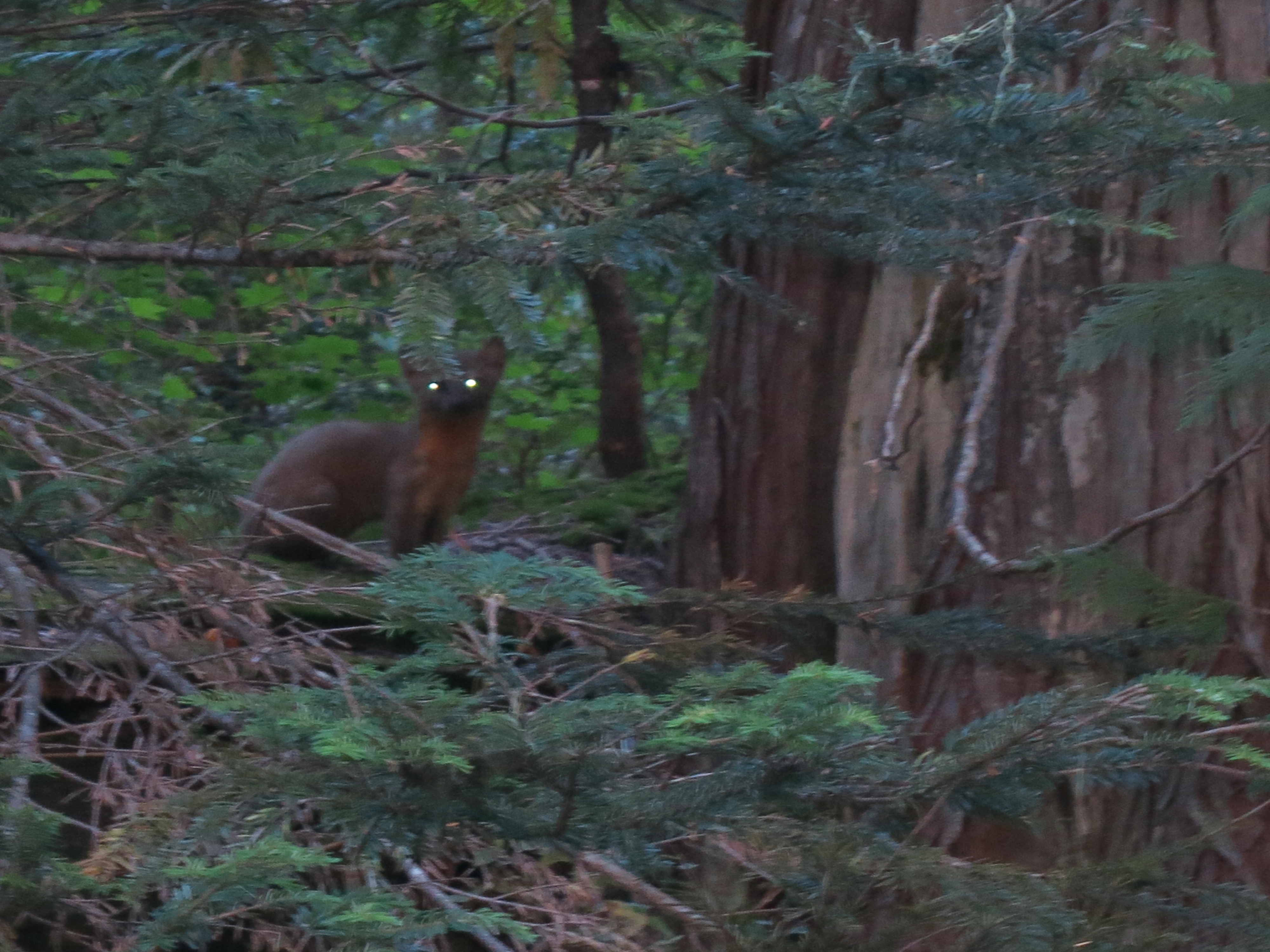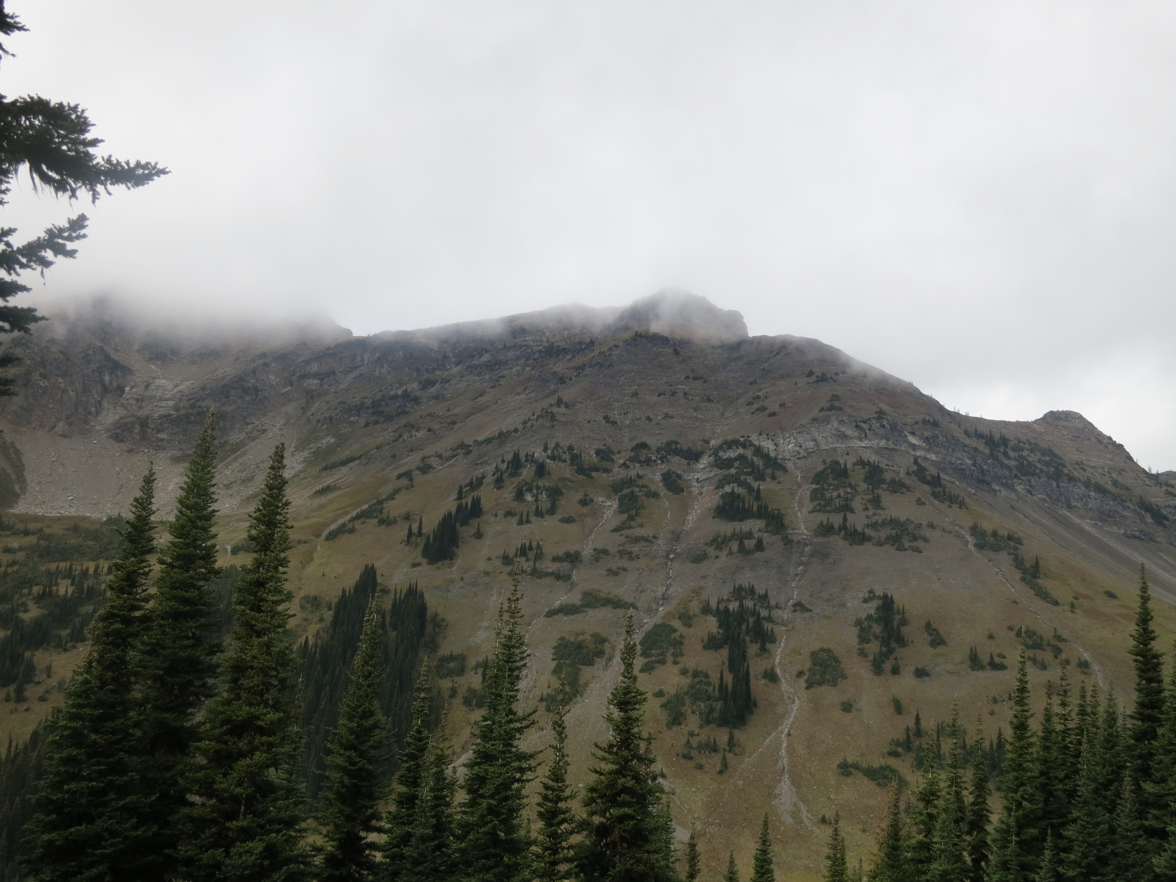 I could see Joat’s yellow shirt on the path in front of me. At times, he would stop and look around, and sometimes, I would stop in the same places to see what he was looking at. We passed by a large canvas tent with a propane tank and lots of other items outside of it. No one seemed to be in there at the time. The trail continued to loop and climb. The grey clouds remained heavy and low, obscuring the views and threatening to rain again at any time.