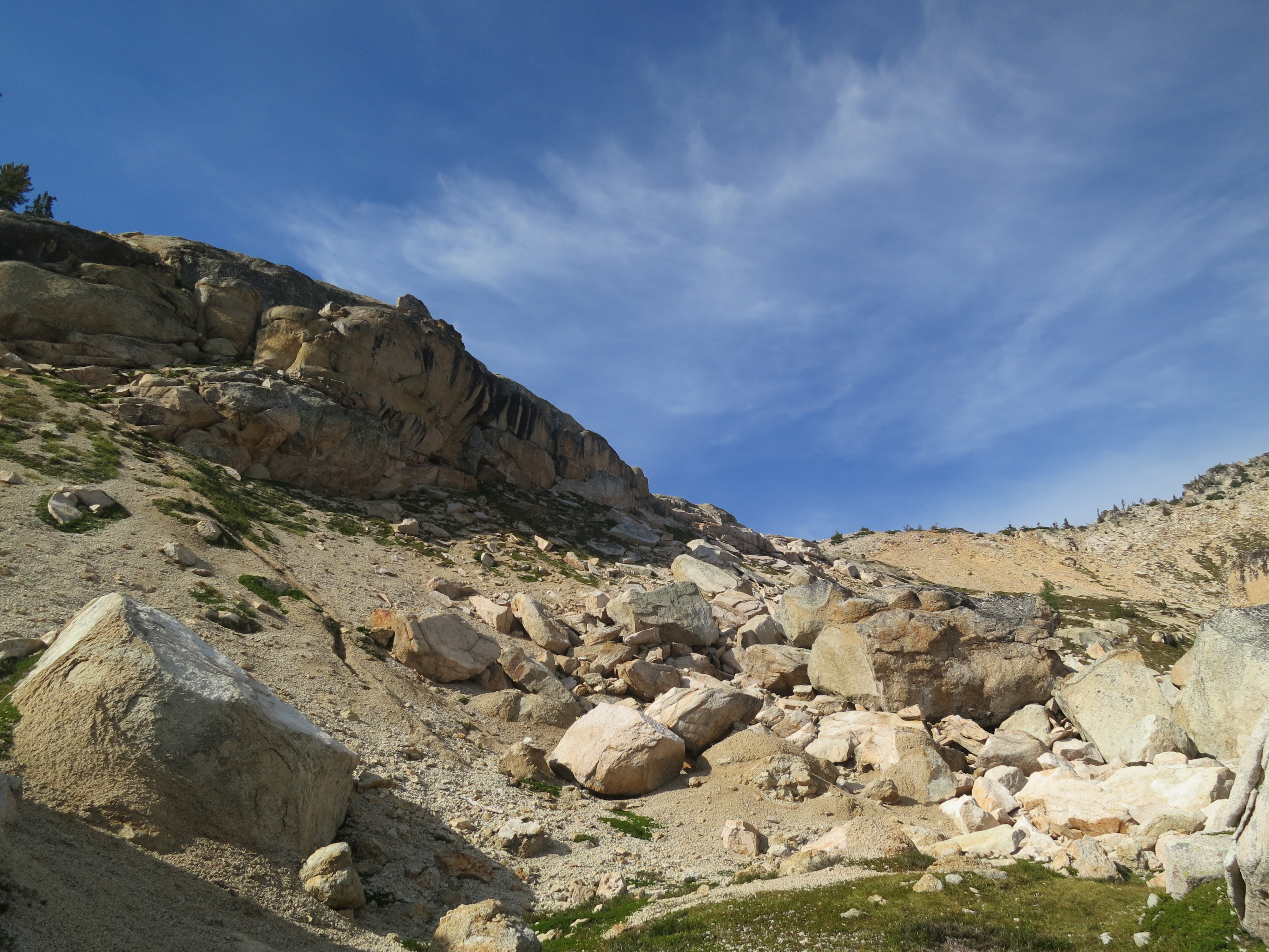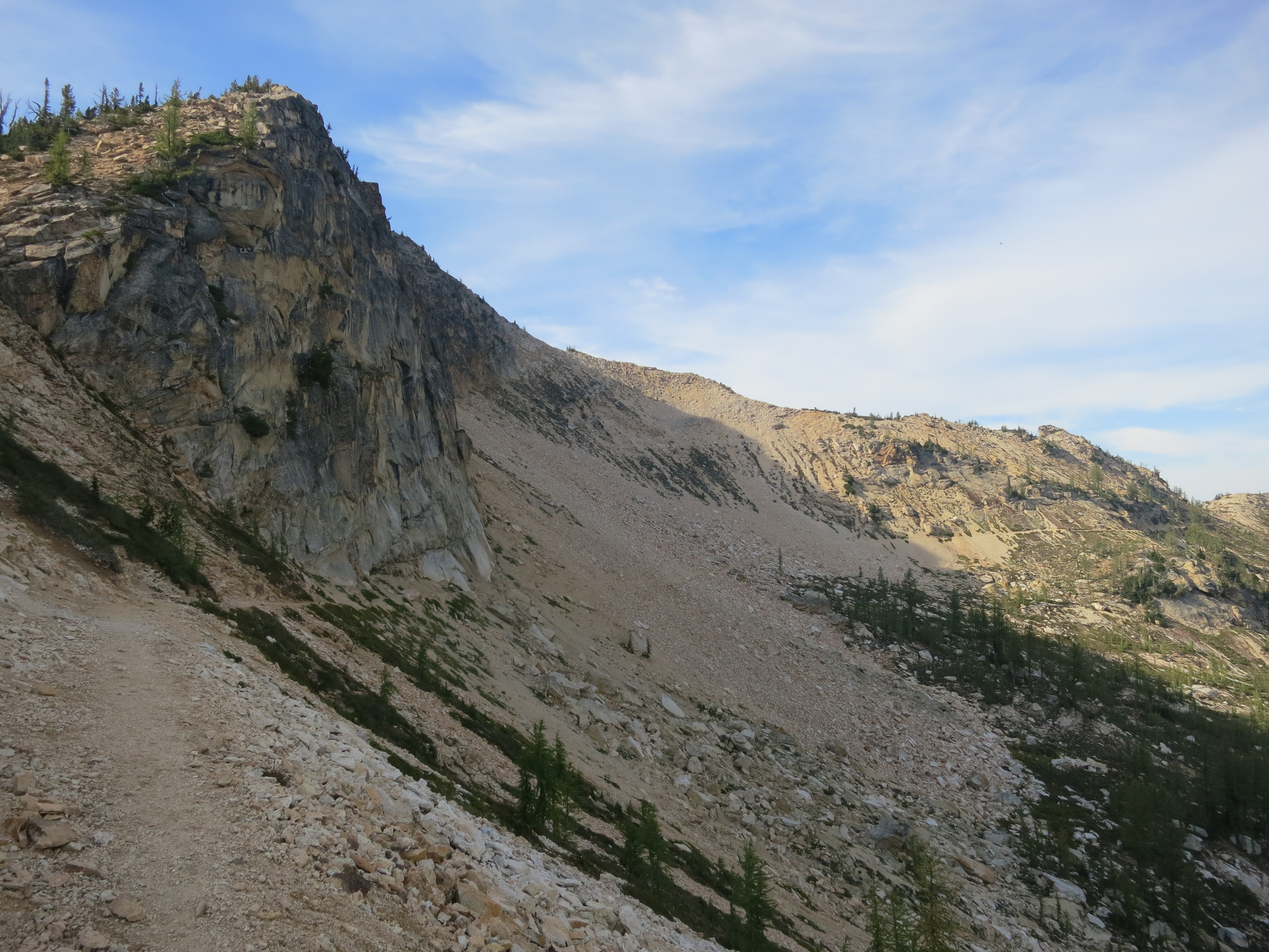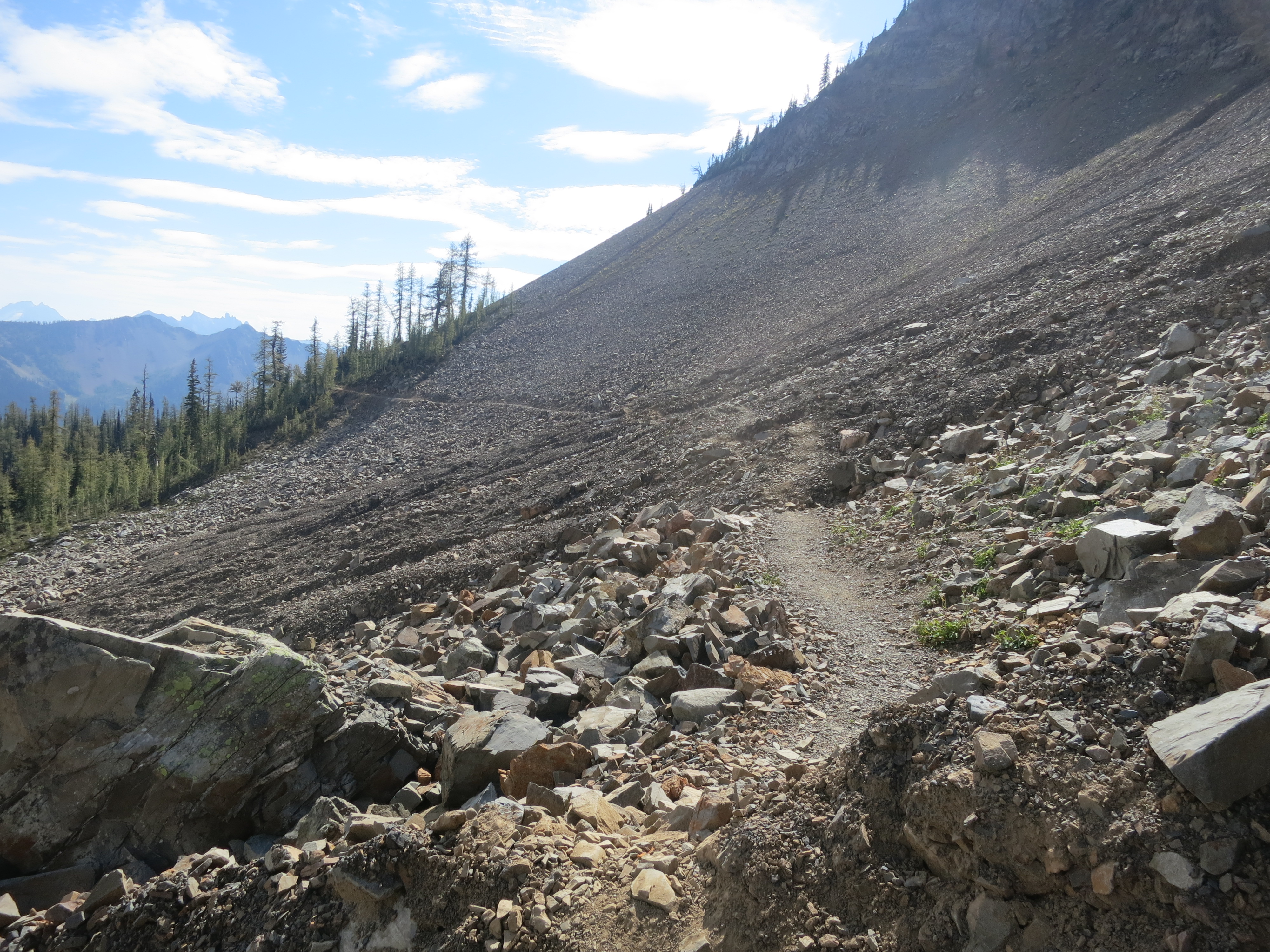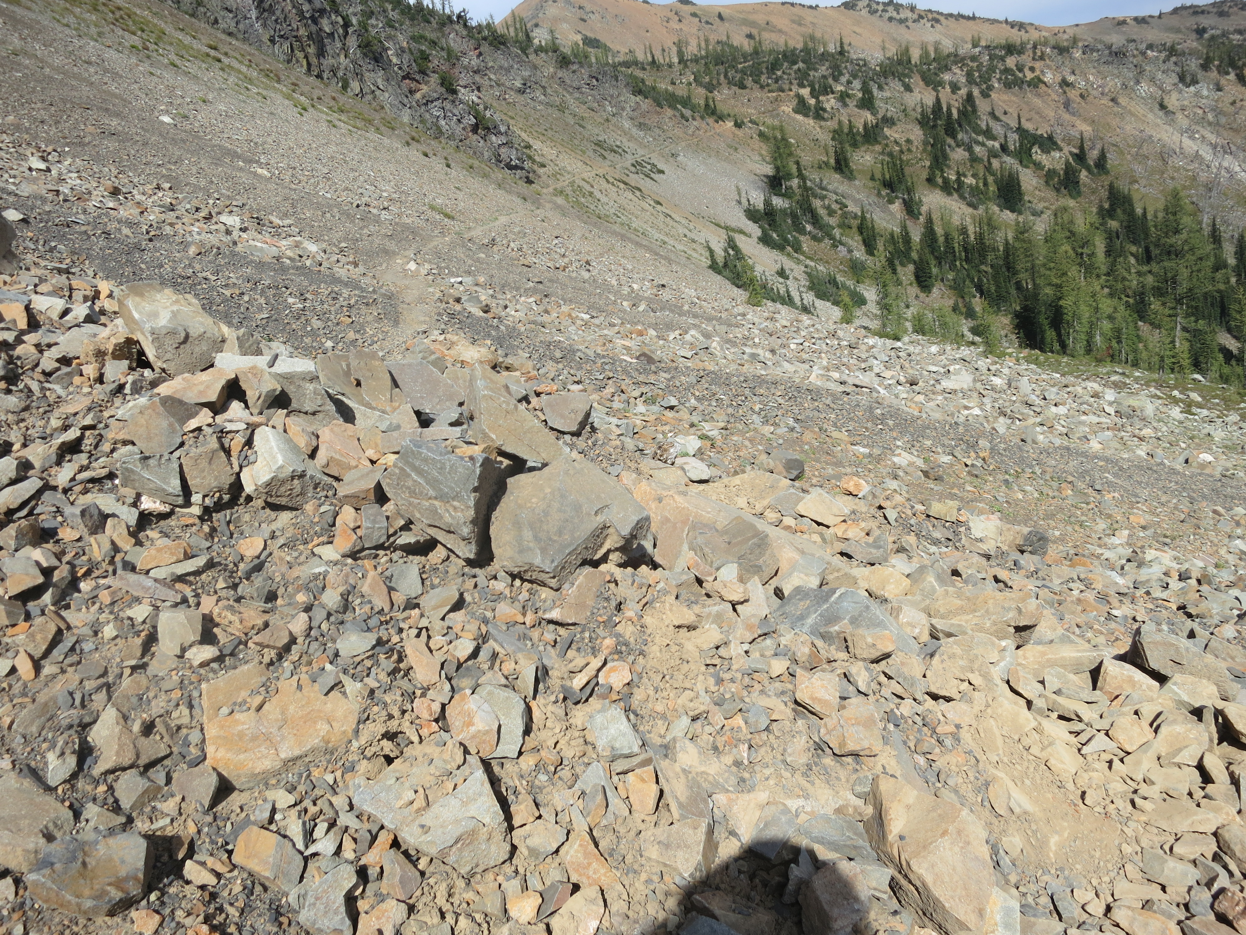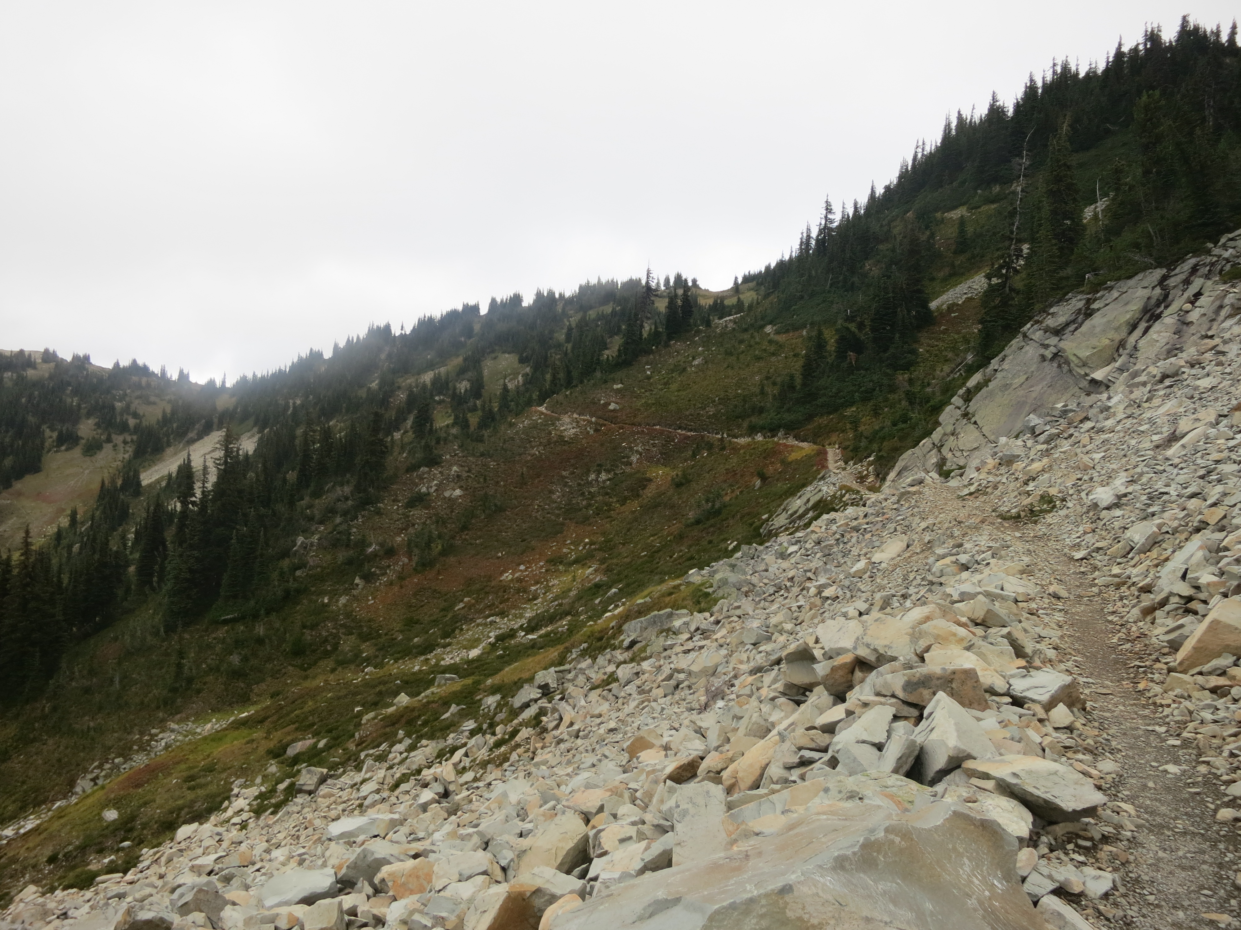 Once I reached the top of the pass, I saw a blocked off trail in front of me and followed the switchbacks down. I could still see Joat, who seemed to be easily making his way along. Every so often, I would come upon a mound of gravel over a rivulet of eroded trail and very carefully make my way over it in order not to slip off the mountainside! I thought these must be the wash-outs and felt like I was managing them quite well.