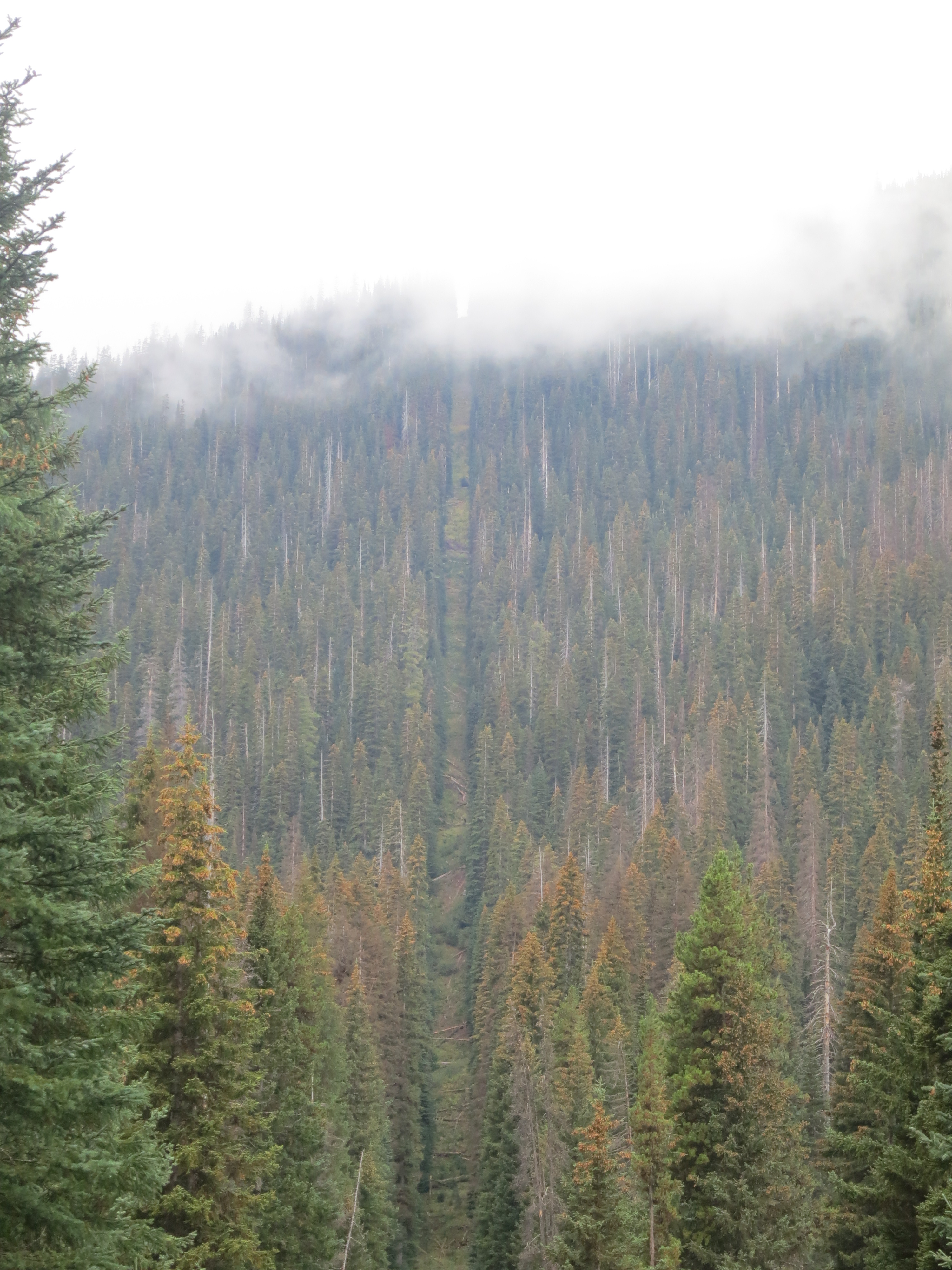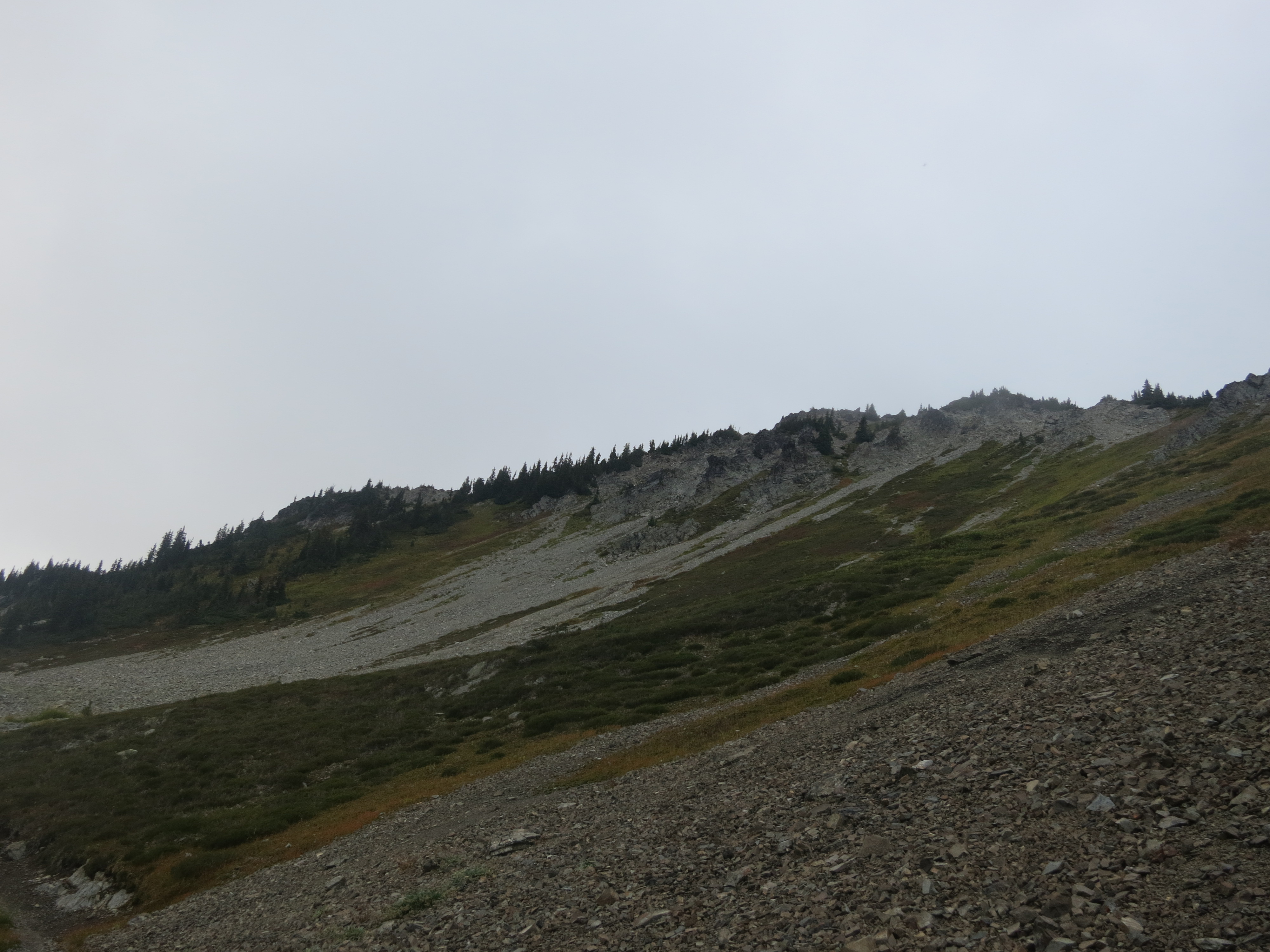 As I walked back up to the PCT, I looked at my watch and saw that it was now 8:40! It was almost my latest start on this entire hike. I looked behind me to see a hiker bent over his pack, taking off some layers, and realized from the color of his shirt that it was Joat. He had obviously gotten up much earlier than I had! I started up the climb in the light rain and fog.