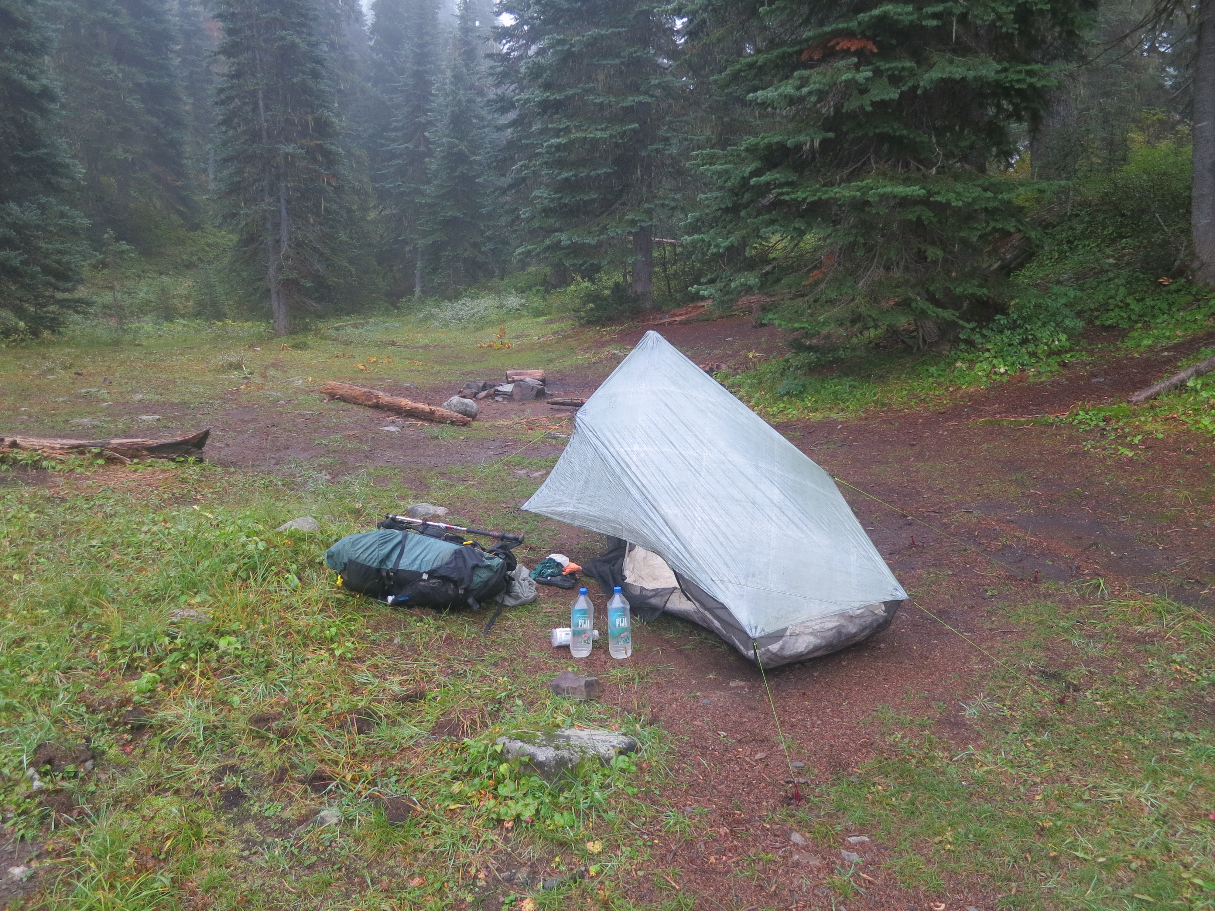“I mean people- a couple,” he said. I wondered if it was Gumby and Double-It. Joat came along and stopped as well. We learned that the other guy was a grouse hunter and he gave us a lesson on the species and how to tell if one was a male or female. He had no hat or hood, and while it was raining on him the entire time that we stood there talking, he seemed as happy as could be. Joat finally excused himself and headed on and I followed. When we reached a stream across the trail, I stopped to collect water. Joat also stopped and remarked on what an amazing thing we had just done. He said that he had read that fewer hikers hike the PCT than climb Mt. Everest each year. “I heard that too!” I said. Before he turned away, I congratulated him on his finish and told him I might see him in the morning on his way back if I was up by then.