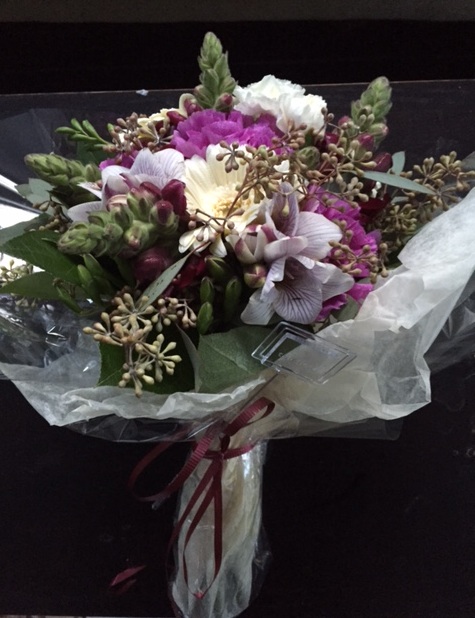 After a few hours, I started feeling pain where the incisions were, as well as a general feeling of discomfort from the swelling. I took more pain pills and continued to rest. I wasn’t sure what time my neighbor was going to come over to check on me, so I didn’t want to fall asleep. At around five, I heard someone open my downstairs door and call my name. I slowly got up and hobbled to my door. He handed me some flowers! I knew right away that Erik had them sent for me (ordered from the Netherlands!). Maybe surgery is not so bad after all- being taken care of by someone who calls you “sweetie”, having a friend I never get to see drive me home, and receiving a bouquet of flowers!