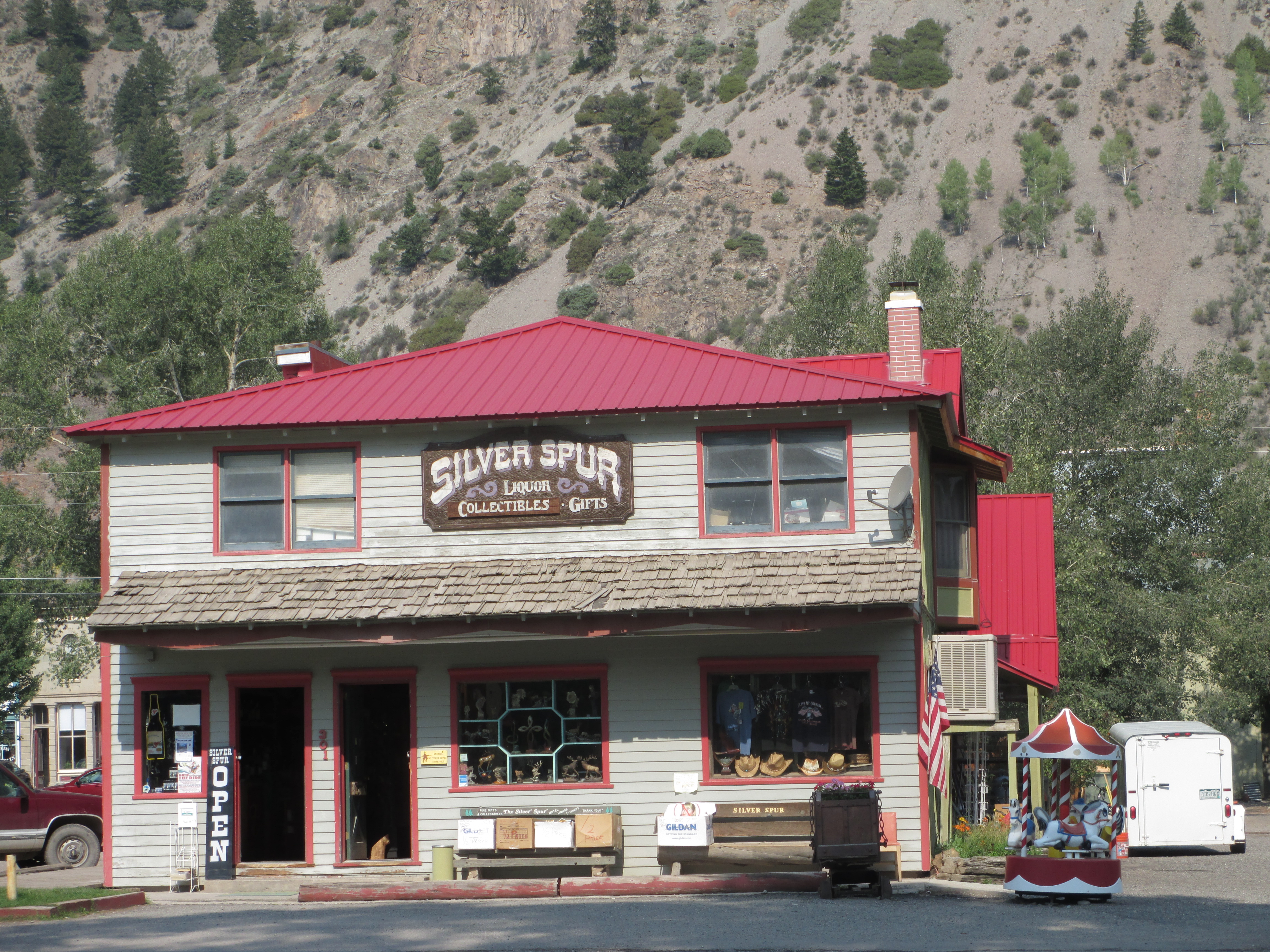 I went back to the store to get my candy bar. The cashier told me about the free brass band concert that evening and the railroad exhibit. The gun show was having a slow start, as the audience was not yet big enough. I decided to walk down to the train station. I called Chad and left him a message, telling him that I just wanted to let him know the gun show was about to begin in Silverton! The depot was closed, but I saw the array of put-put cars lined up on the tracks.