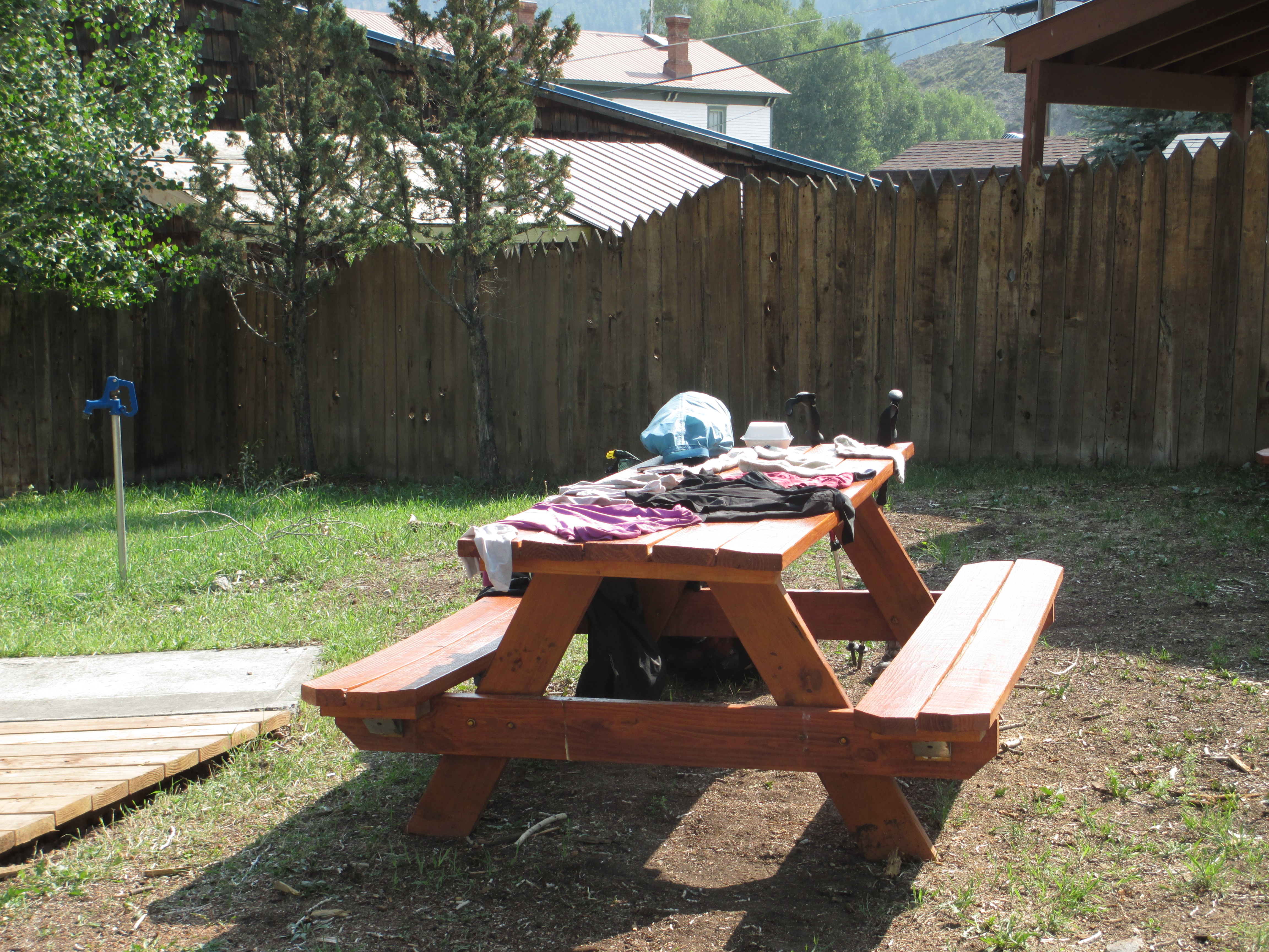 Then, I walked back to my room and started packing! I didn’t even have time to take a shower! I had hand washed some of my clothes yesterday and hung them up to dry, but they were still wet! I moved everything out of my room and over to a little grassy area with a picnic table across the street and spread all of my wet clothes over the table to dry in the sun! Ah, the life of a hobo!
