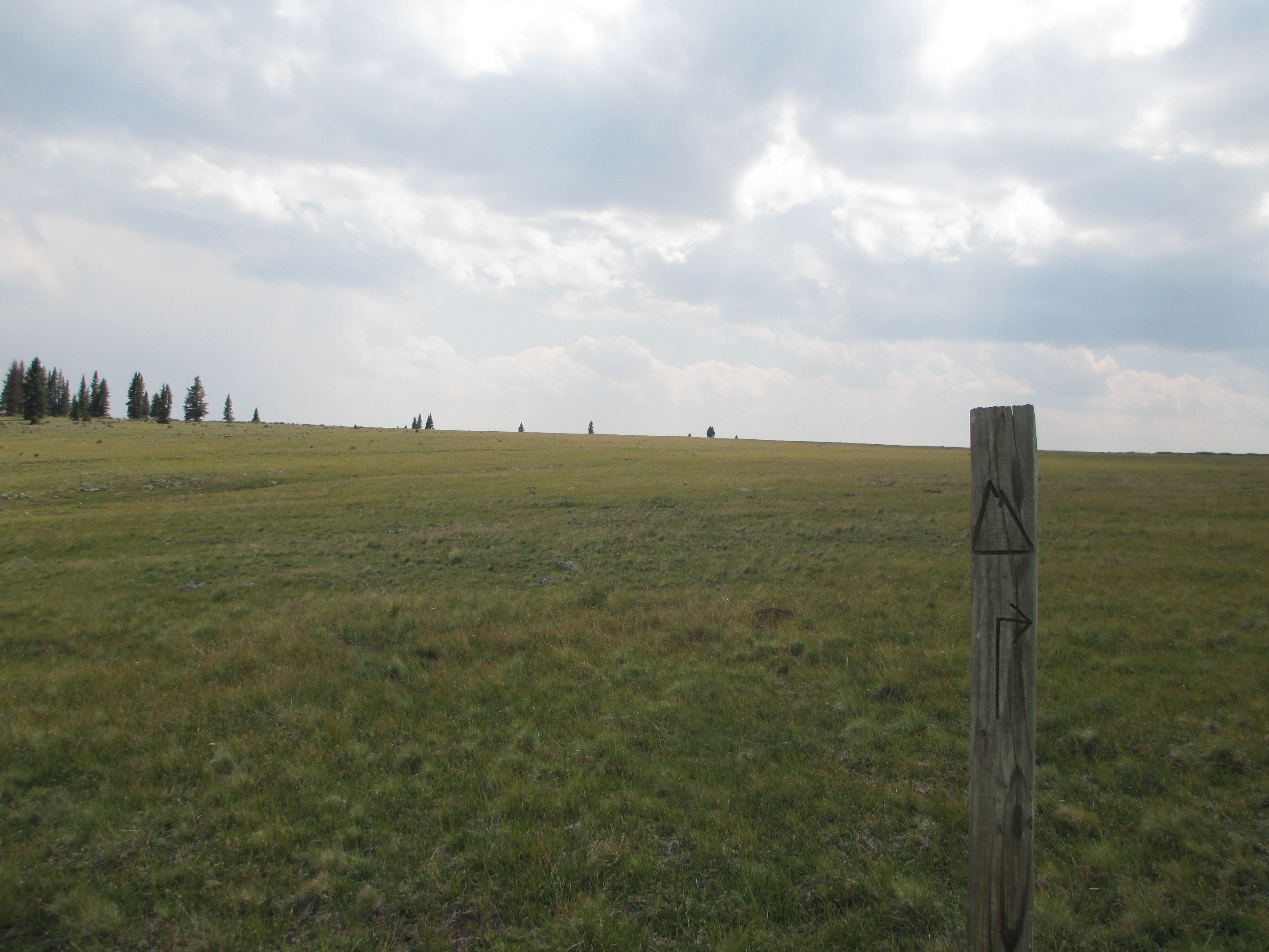 The rain became heavier and then turned to hail. On and on I hiked, watching the dark clouds. I felt lucky to notice the sign showing the split for the CDT and CT. The path I was following continued more naturally in the direction of the CDT, while the CT turned a sharp right and headed uphill (not the best direction to be headed in a storm!). I was still quite a ways from the forest.