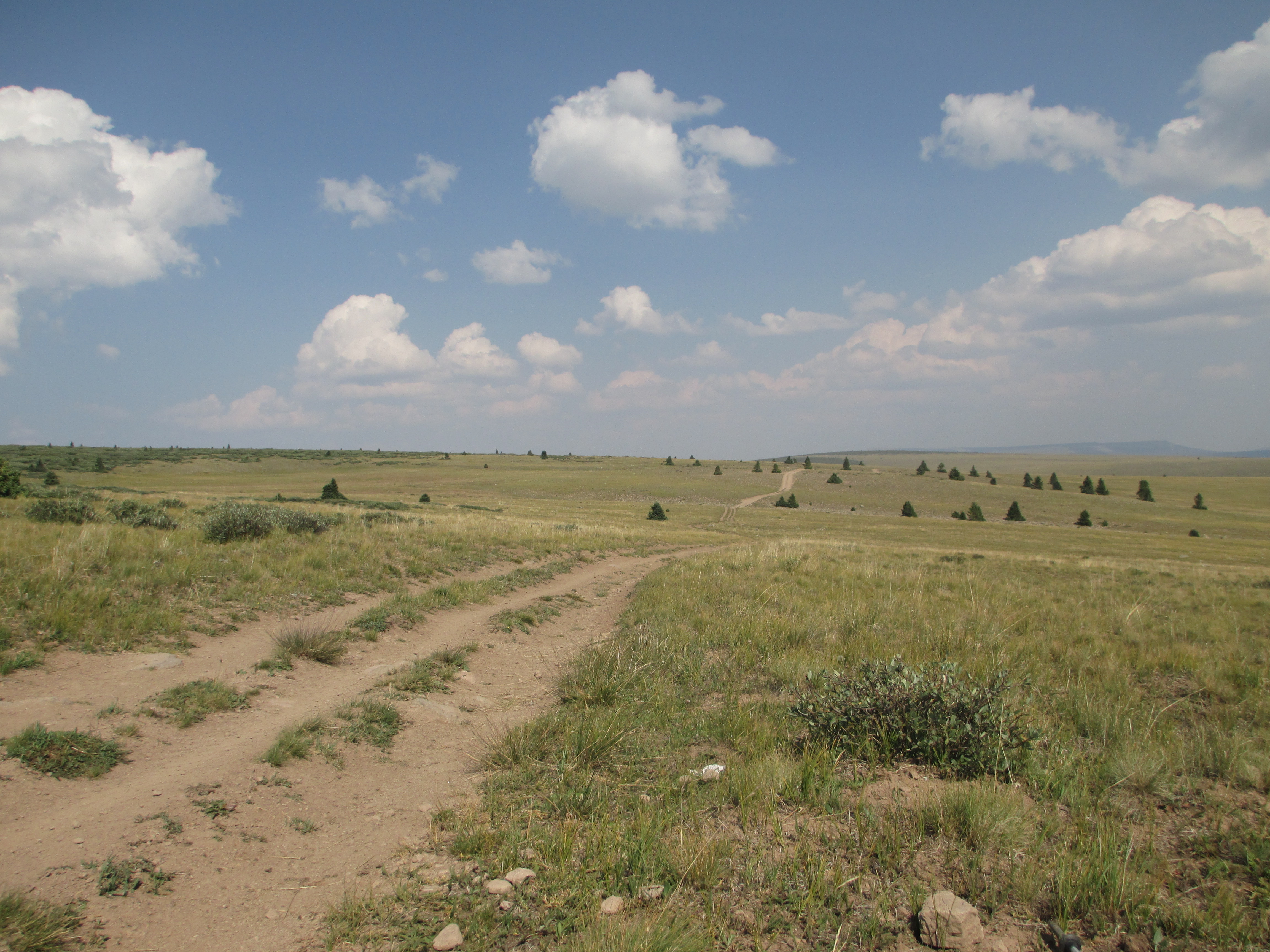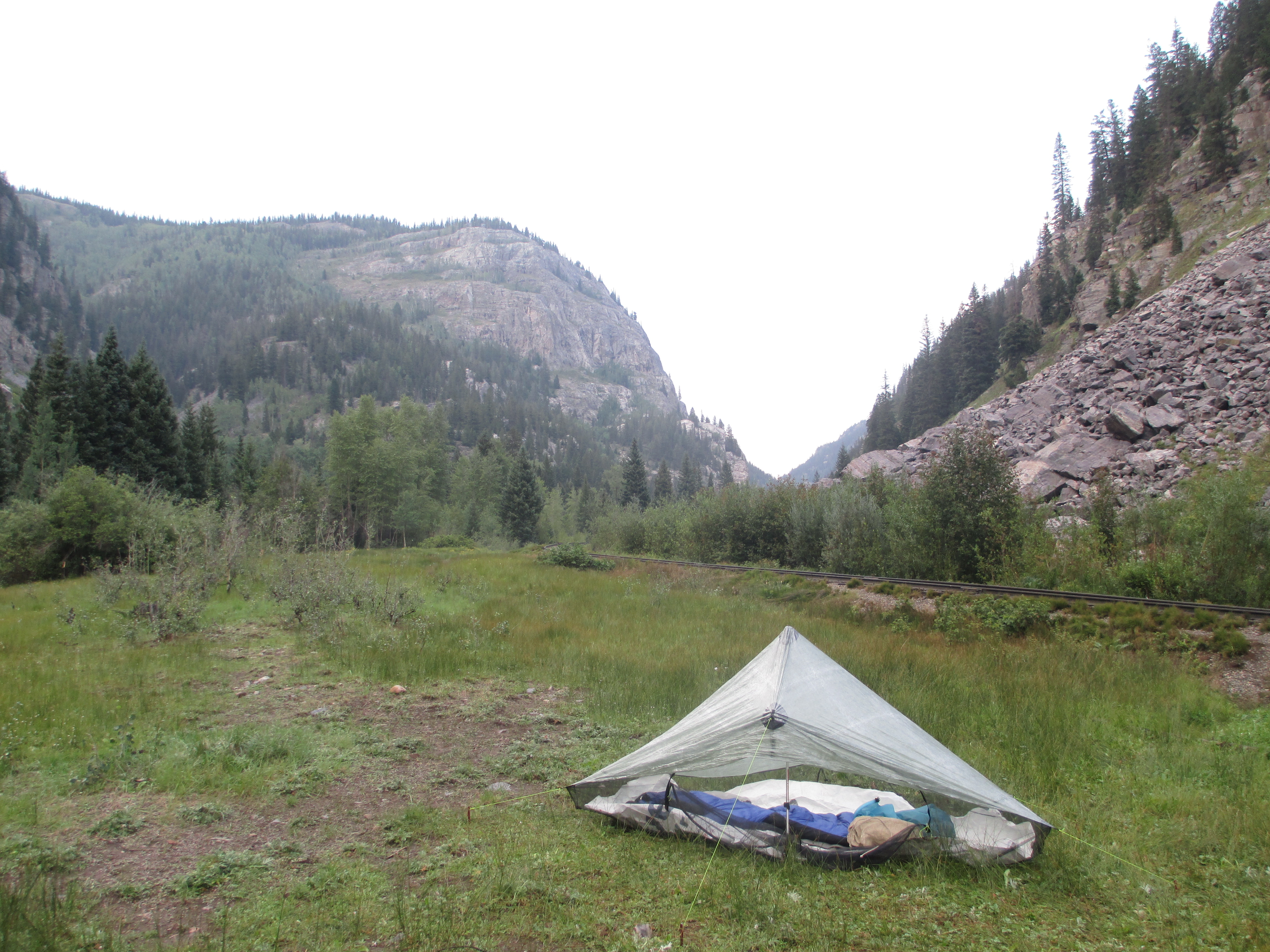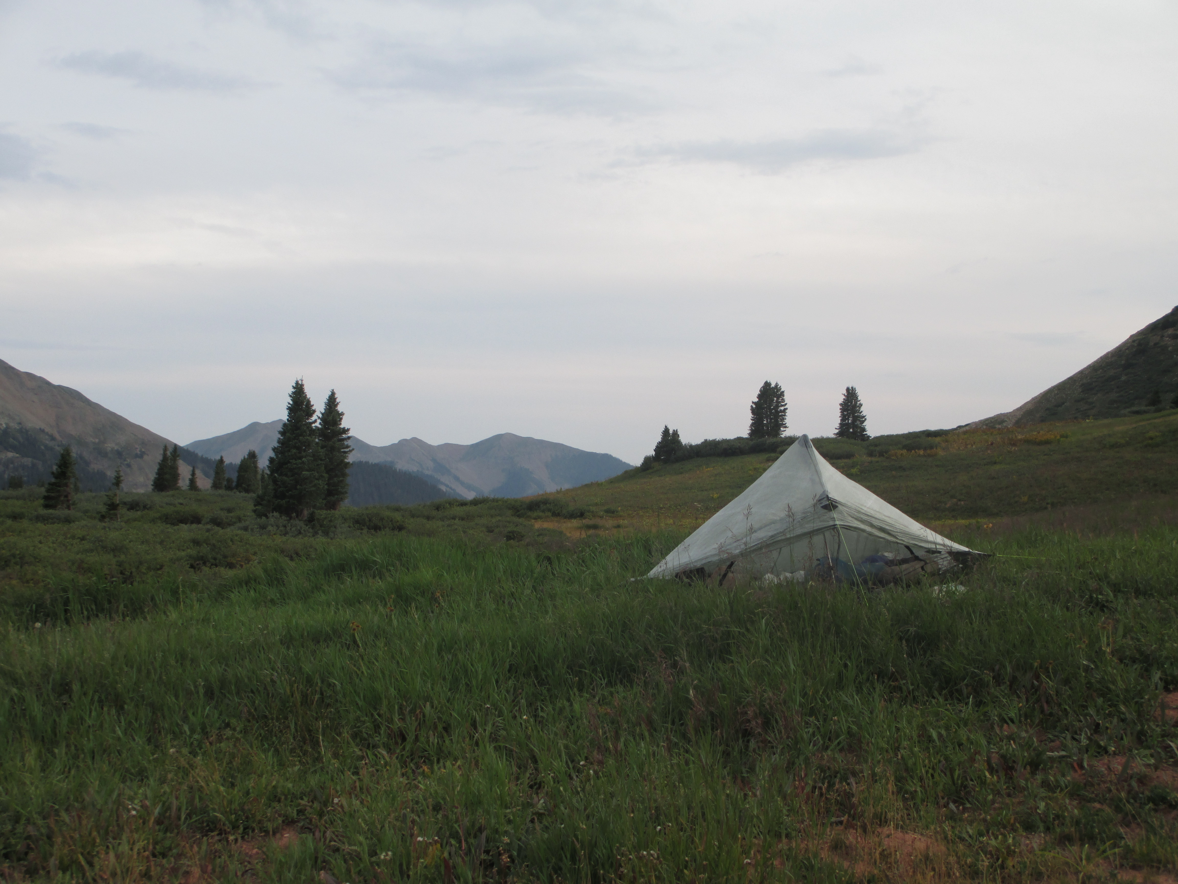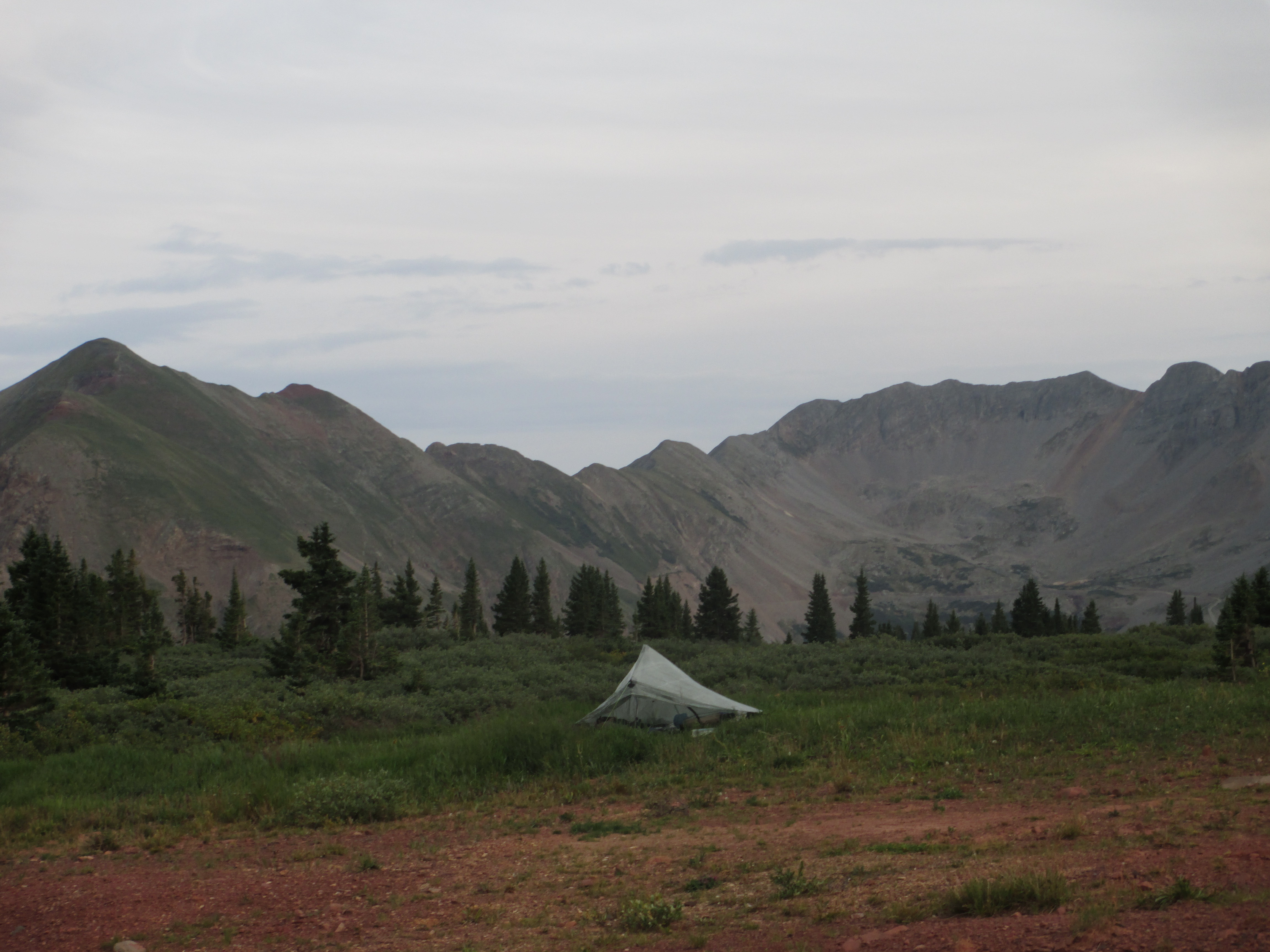 And then, I heard rain. Steady rain. I looked at my watch. 6:02. Just when it was time to get up and get going! This happened 2 days ago, as well! I thought the mornings were supposed to be sunny in Colorado! Since the rain was falling so steadily, I stayed put. The side of my tent was collapsed, so I put my pack (with the pack cover facing out) against that wall to try to create some tautness. Luckily, it didn’t appear that water was dripping into the tent near my head. The rain continued. It was now 7 o’clock! This was ridiculous! I needed to get going! I sat up and dug into my food bag. There was no way to cook, so I ate some cold cereal. Then, I steadily packed up as much as I could, pondering how I was going to break down my tent without getting all of my stuff wet! I decided to pack my Tyvek outside of my stuff sack, instead of at the bottom. I packed up everything inside the tent and then went out to break the tent down. One of the tent guy lines had come of the stake, and I had a hard time finding the loose stake in the tall grass. Finally, at 8am, I was ready to head off. I was pretty sure I was the first one out. I saw the groundcloth and a soggy green, wet tent belonging to the sister and brother headed north. It appeared that I wasn’t the only one who had trouble.