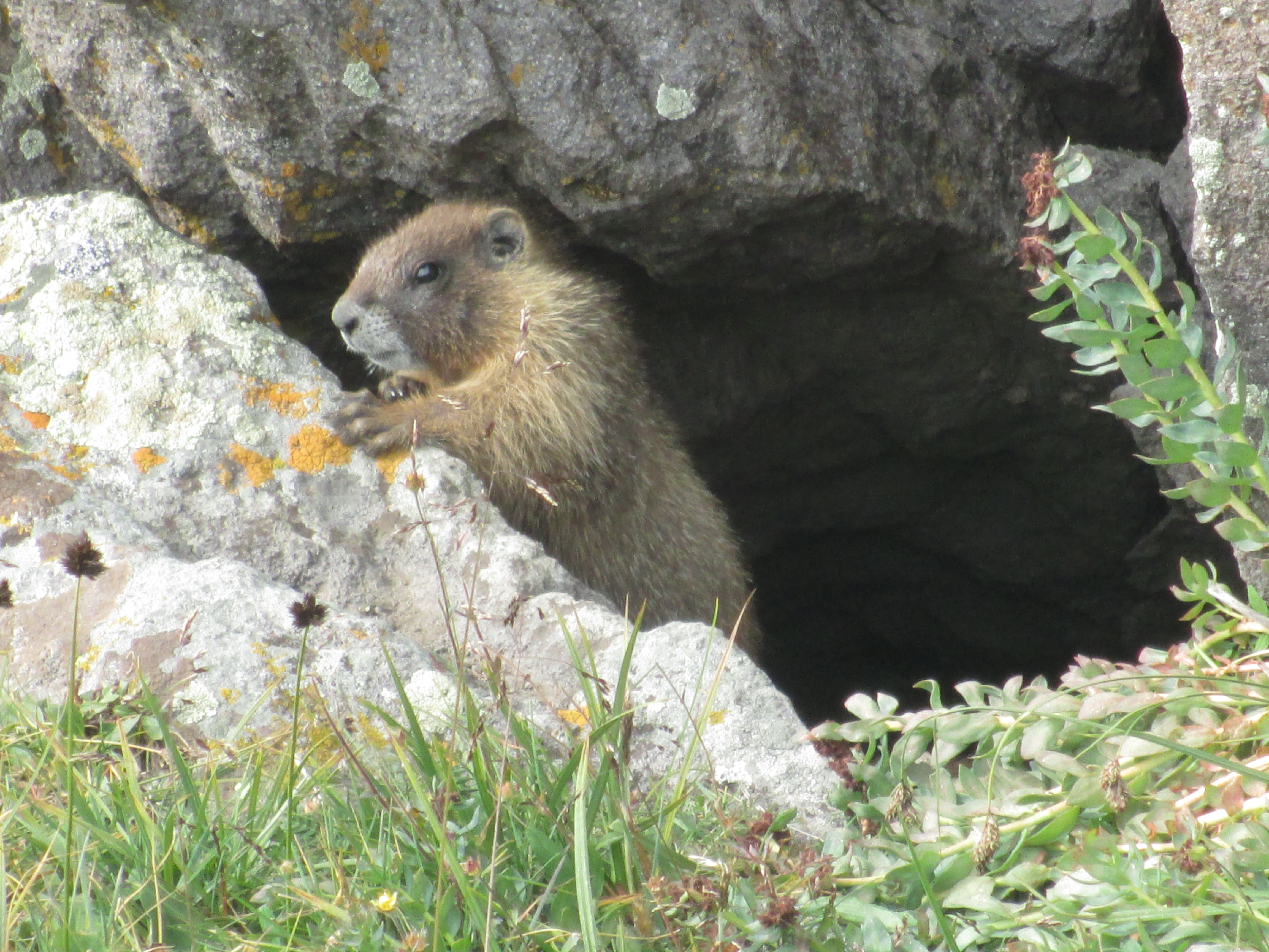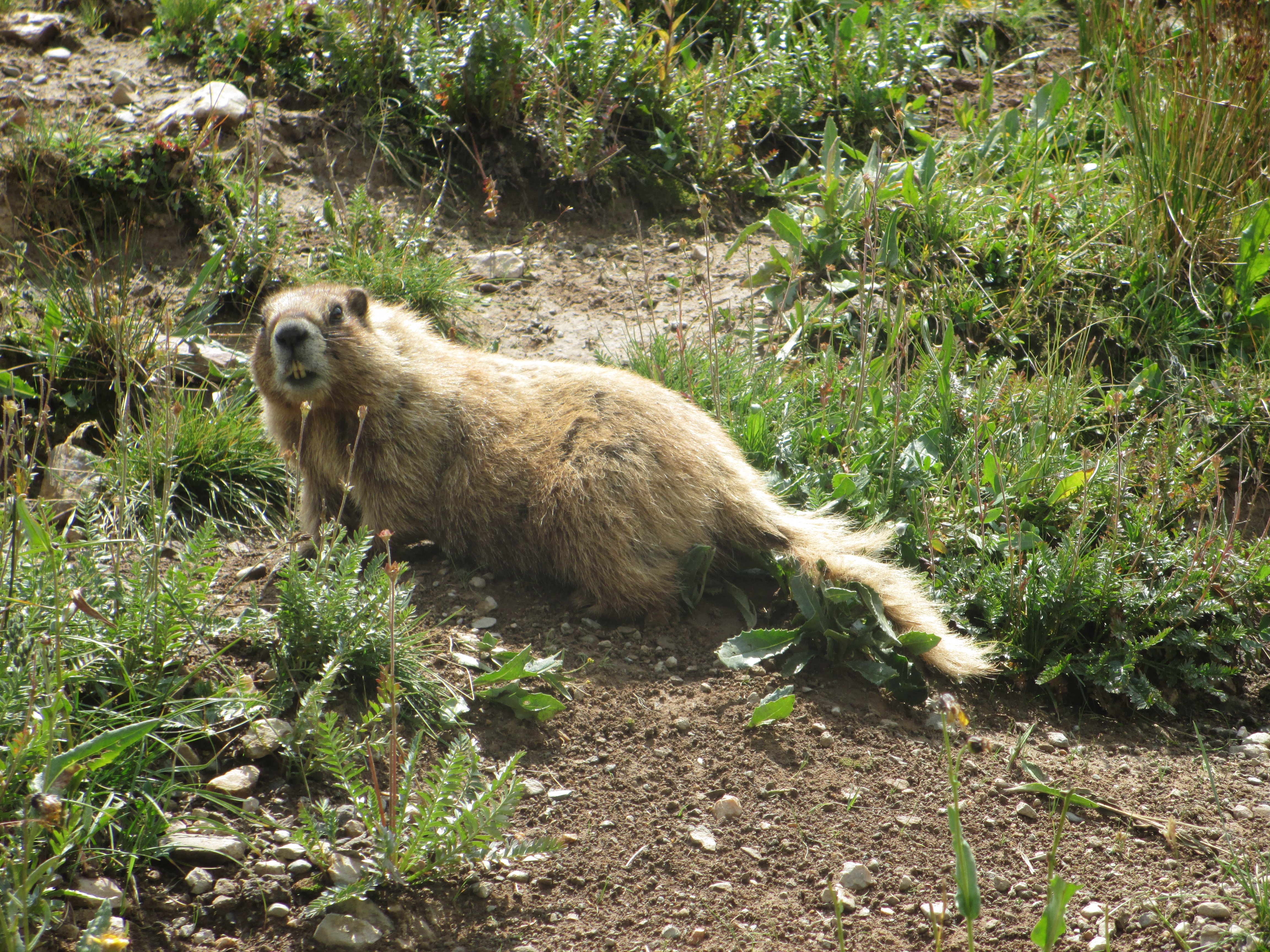 As I continued on, another marmot ran down the trail toward me. Alarmed, I yelled, “What are you doing?” at it and it dove into a rock cairn.