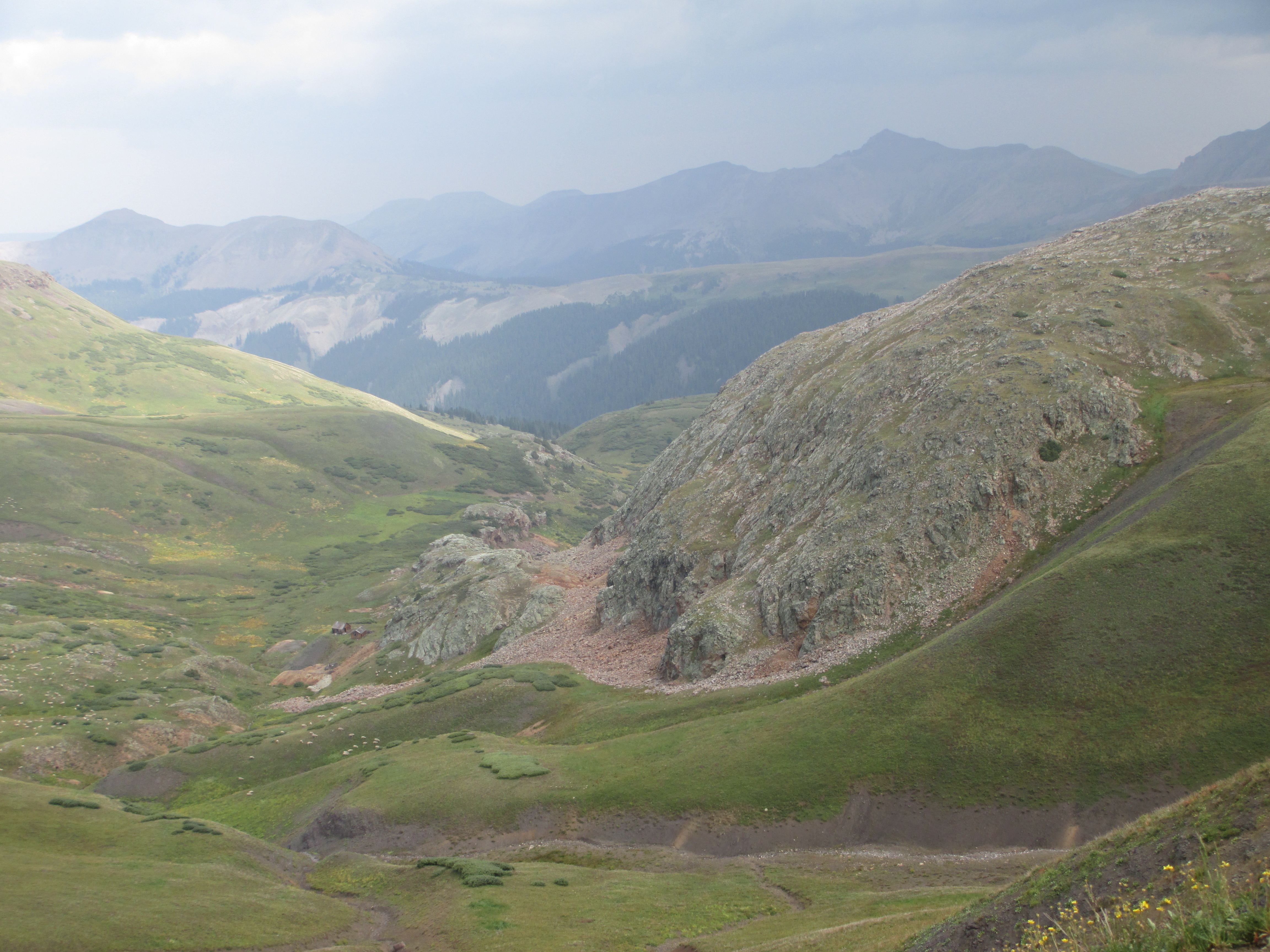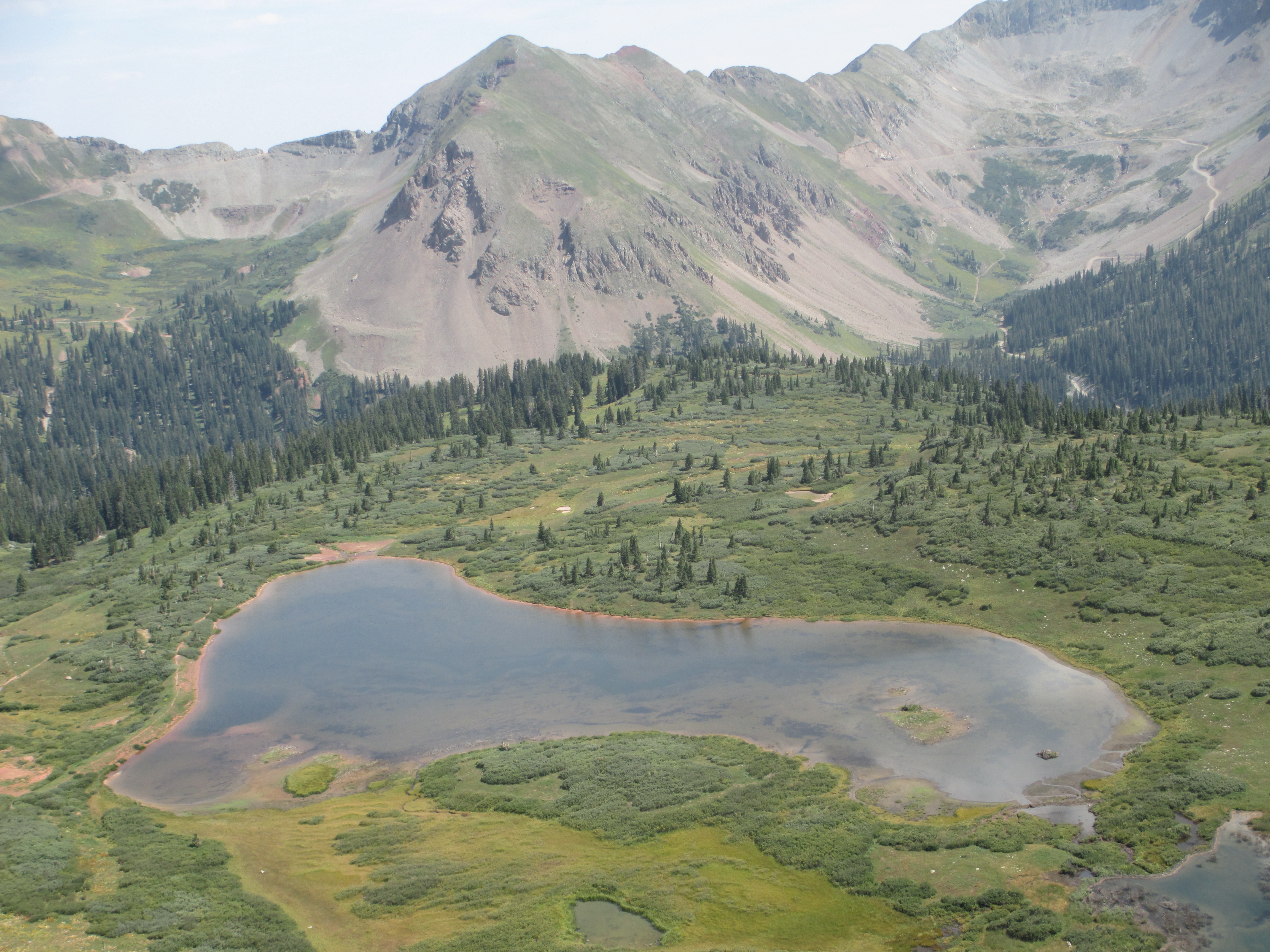 I passed by some campsites with lamas, then ran into a man who was headed the opposite way as me, and who wanted to chat for a bit. He told me there were two hikers right in front of me. (I had wondered if I would catch Derek and Amanda, whose parents gave me a ride into Lake City, and now I knew I had). I reached a green pond with some ducks swimming, then walked by more pines, and saw two young hikers huddled under a tree. I asked if their names were Derek and Amanda and they said yes. They were also tired and planned to spend the night there. They decided to end their hike in Silverton. I asked them to thank their parents for me and continued my way down the hill with the rain still starting and stopping.