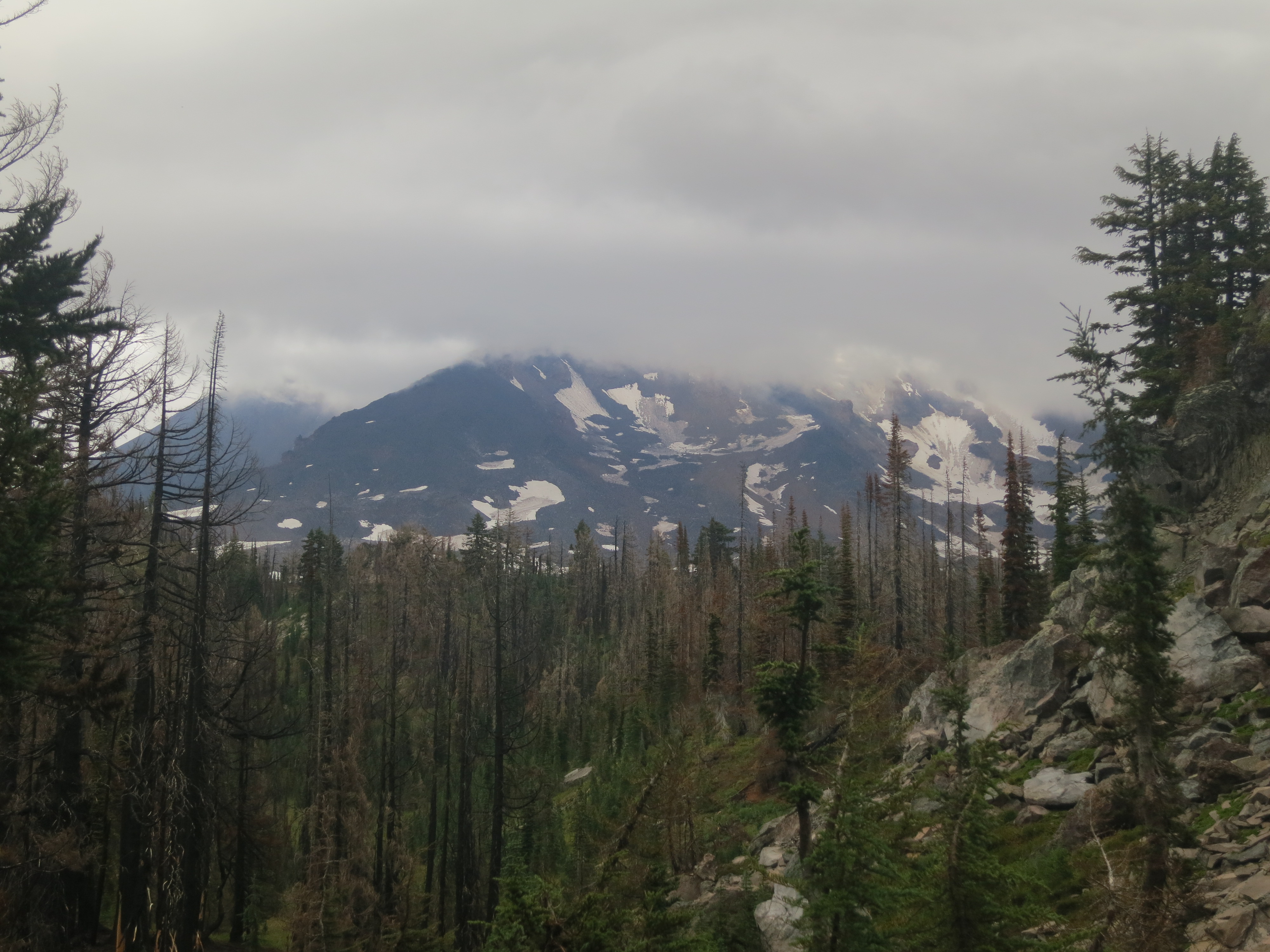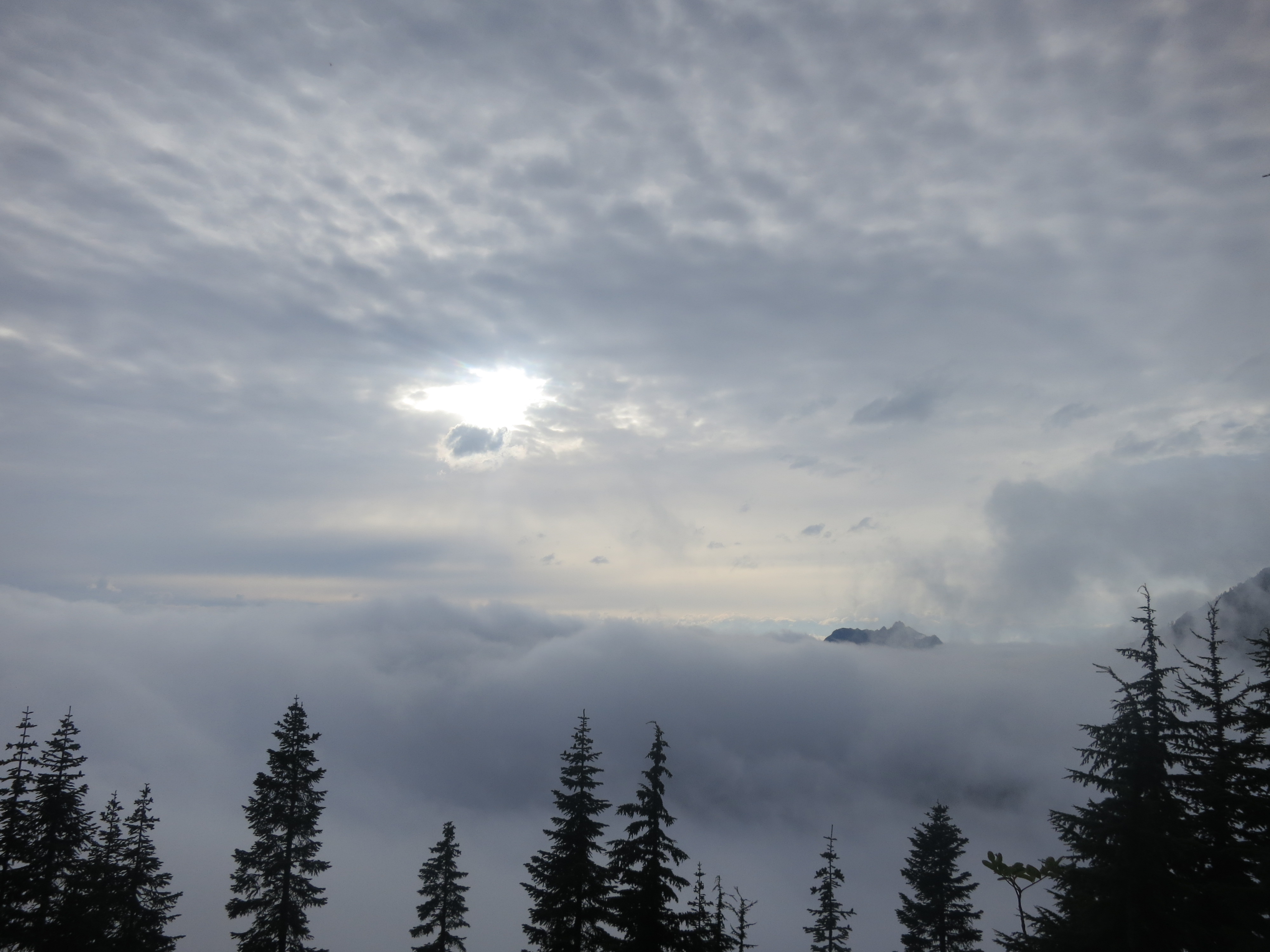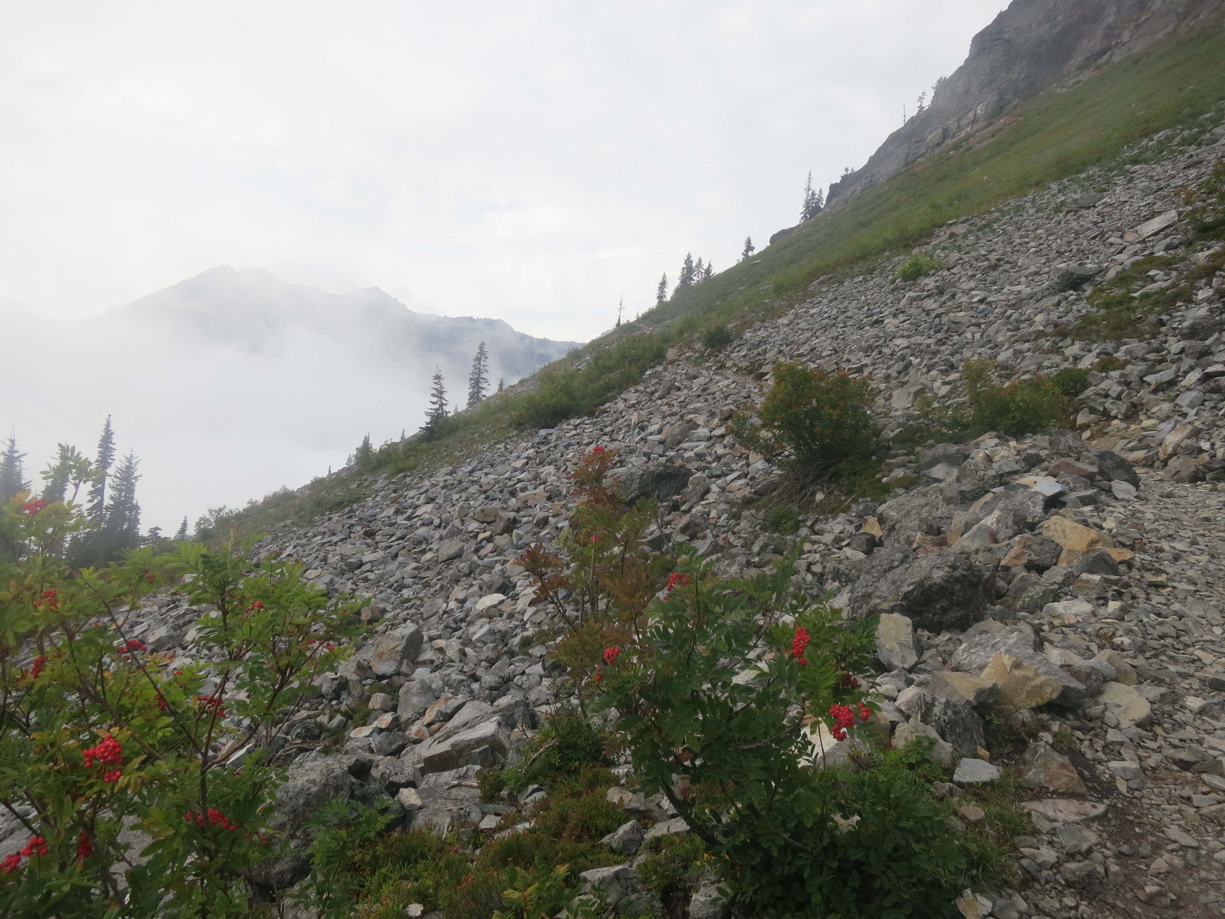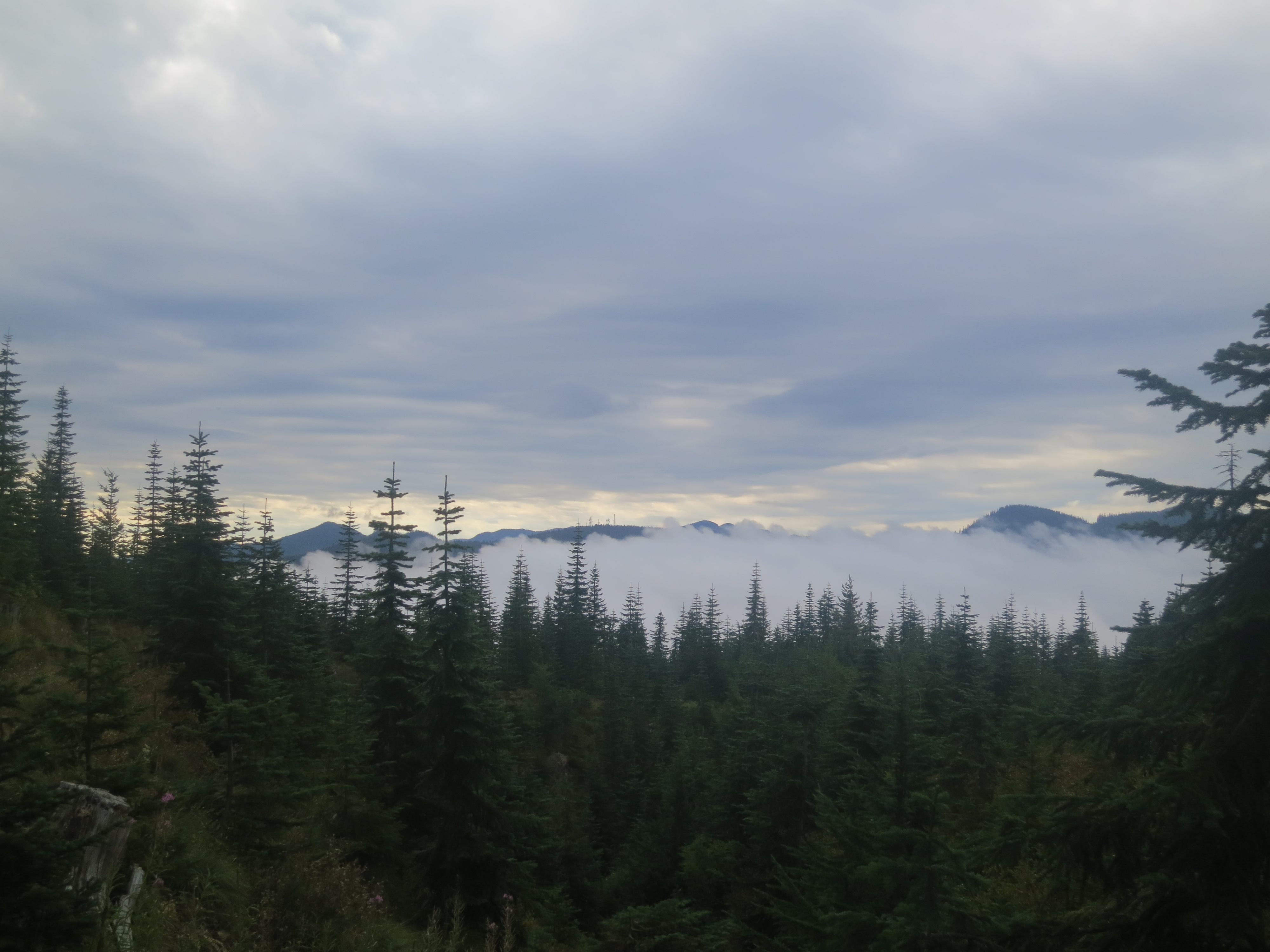 I thought it would be nice to have some company for the remaining 9 miles, but they urged me to go on ahead, as I would be faster. I figured that they needed some catching up time, as well. During the first mile or so, I thought about all of the lessons that I had learned on my journey and felt like I was having a lot of profound thoughts that I would have to share with people later. Then, the effect of the champagne wore off and I suddenly felt very, very tired and I quickly forgot all of my fascinating thoughts! How many miles did I have left? I wanted to get my heavy pack of my back! The trail climbed and still, the grey clouds hung low.