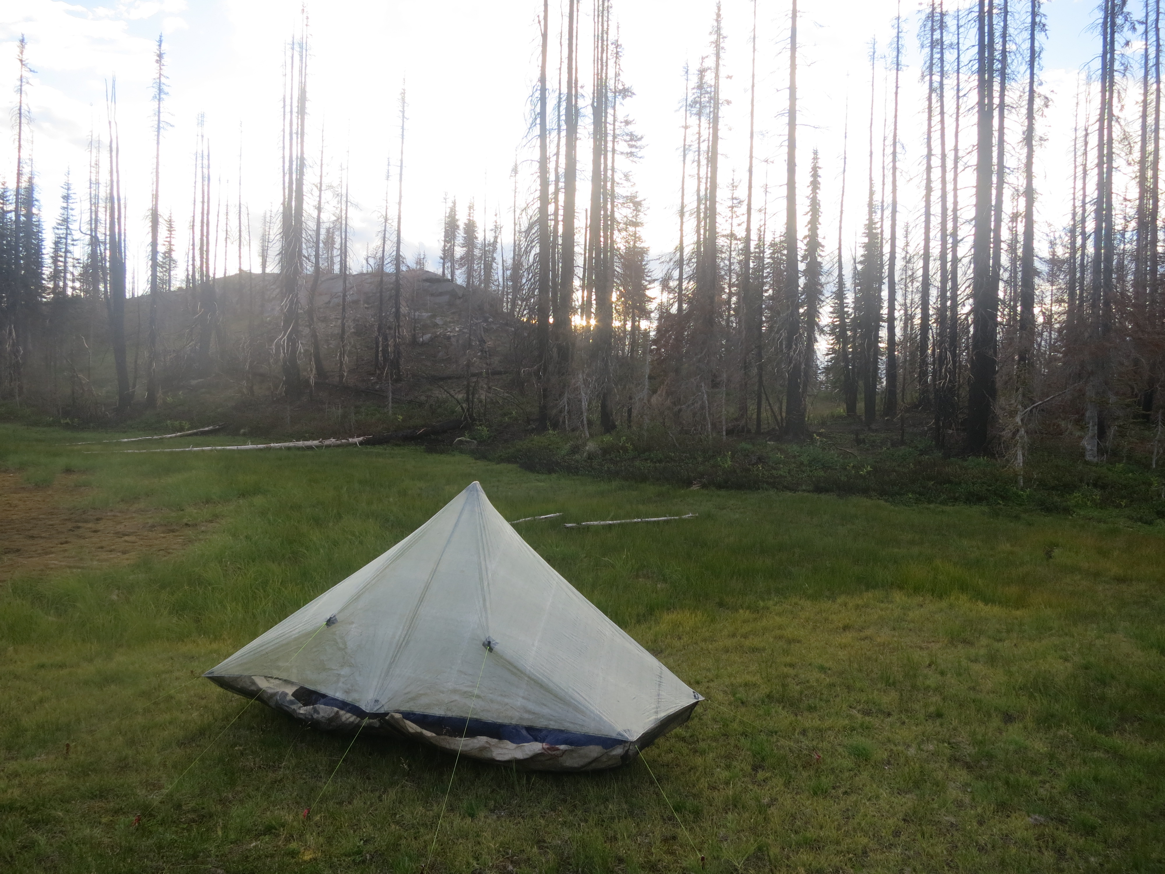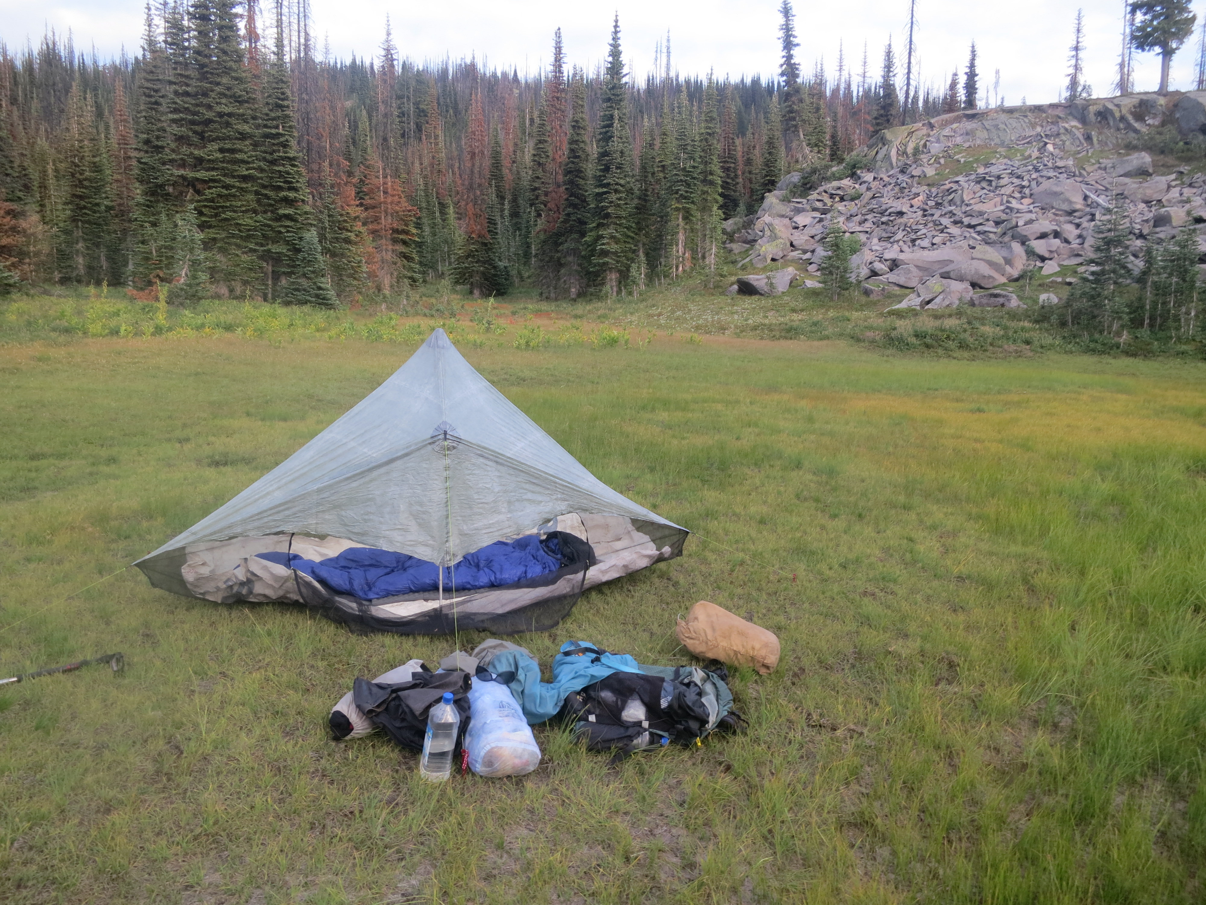 As on most nights on the trail, I woke up every hour or so, checked the time, saw that it was still the middle of the night, and changed my sleeping position. Around 5:30 in the morning, I fell asleep hard (also as usual). This morning, I awoke at 6:33 to the sound of my breathing. It was 6:30 already? I looked out and saw Gumby and Double-It packing up their tent. There was no way I could be ready in time to leave with them. Although I was worried that there would be no one to take my picture at the border, I reminded myself to stay calm and stick to my own rhythm. Everything would work out, I told myself. I ate my half serving of granola and started a boil for my coffee, which I ate with a single poptart. Double-It called out another “Congratulations” to me, which made me smile. Gumby said that if they didn’t see me at the border, they would see me in Manning Park. “Okay”. They took off at 7am. It was still rainy and dark out. I figured that my slower start would give the clouds more of a chance to break up. Slowly, I packed up my things- stuffing my long underwear and sleeping socks into my extra clothing stuff sack for the last time, squishing my sleeping bag into its own sack, and throwing each little bag outside my tent in order to fold up my sleeping pad and groundcloth.