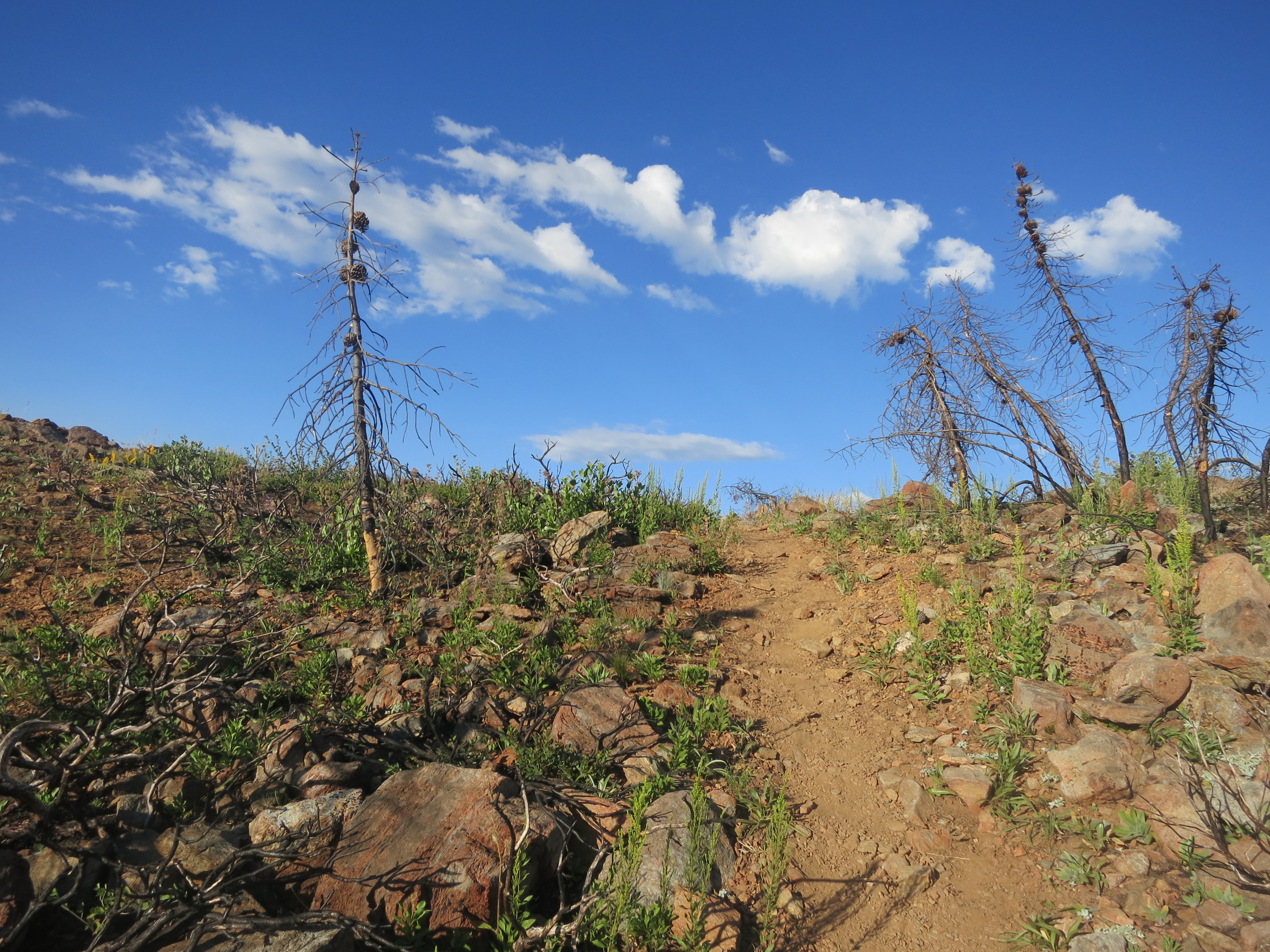 I packed up, climbed back onto the trail and headed on my way. The woods opened up for a brief section that allowed for a nice view. I was reminded of a similar part of the trail in the desert with piles of rocks on one side and an open view on the other.